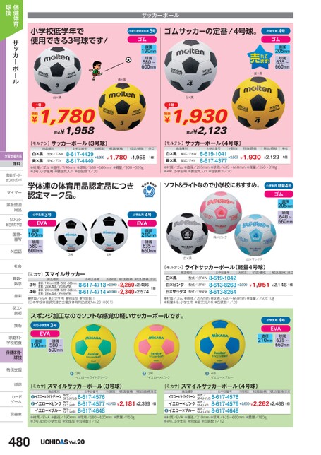 サッカーボール小学校低学年で使用できる3号球です!小学生用低学年用3号ゴム直径190mm球周580〜600mm黄×黒ゴムサッカーの定番!4号球。小学生用4号ゴム直径205mm球周635〜660mm黄×黒白×黒白×黒1個税抜¥1,780税込¥1,9581個税抜¥1,930税込¥2,123[モルテン]サッカーボール(3号球)商品種別お申込番号M価税抜税抜価格税込価格型式/F3W白×黒黄×黒●材質/ゴム●直径/190mm●球周/580〜600mm●質量/300〜320g●3号、小学生用●要空気入れ●包装数:1/208-617-44398-617-4440¥1,780¥1,958型式/F3Y¥2,300単位1個[モルテン]サッカーボール(4号球)商品種別お申込番号M価税抜税抜価格税込価格型式/F4W白×黒黄×黒●材質/ゴム●直径/205mm●球周/635〜660mm●質量/350〜390g●4号、小学生用●要空気入れ●包装数:1/208-619-10418-617-4377¥1,930¥2,123型式/F4Y¥2,500単位1個学体連の体育用品認定品につき認定マーク品。小学生用3号EVA直径190mm球周580〜600mm3号4号小学生用4号EVA直径210mm球周635〜660mmソフト&ライトなので小学校におすすめ。小学生用軽量4号ゴム直径205mm球周640〜660mm白×ピンク白×黒白×サックス[ミカサ]スマイルサッカー商品種別お申込番号M価税抜税抜価格税込価格単位直径/190mm、球周/580〜600mm、質量/260g、型式/SF326-WBK直径/210mm、球周/635〜660mm、質量/280g、型式/SF428-WBK3号4号●材質/EVA●小学生用●完成品●包装数:1〈日本学校体育研究連合会優良体育用品認定No.2018001〉8-617-4713¥2,900¥2,260¥2,4868-617-4714¥3,000¥2,340¥2,5741個[モルテン]ライトサッカーボール(軽量4号球)商品種別お申込番号M価税抜税抜価格税込価格単位型式/LSF4P型式/LSF4W白×黒白×ピンク白×サックス●材質/ゴム●直径/205mm●球周/640〜660mm●質量/250±10g●軽量4号、小学生用●要空気入れ●包装数:1/208-619-10428-613-82638-613-8264型式/LSF4SK¥2,500¥1,951¥2,1461個スポンジ加工なのでソフトな感覚の軽いサッカーボールです。幼児・小学生用3号EVA直径190mm球周580〜600mm小学生用4号EVA直径210mm球周635〜660mm●3号イエロー×ライトグリーン●3号イエロー×ピンク●4号イエロー×ブルー[ミカサ]スマイルサッカーボール(3号球)[ミカサ]スマイルサッカーボール(4号球)商品種別お申込番号M価税抜税抜価格税込価格単位商品種別お申込番号M価税抜税抜価格税込価格単位型式/イエロー×ライトグリーンイエロー×ピンク型式/イエロー×ブルーSF4J-YLG8-617-45788-617-4579SF4J-YBL8-617-4649SF4J-YP型式/●●材質/EVA●直径/210mm●球周/635〜660mm●質量/180g●4号、小学生用●完成品●包装数:1/12¥2,800¥2,262¥2,4881個¥2,700¥2,181¥2,3991個●材質/EVA●直径/190mm●球周/580〜600mm●質量/150g●3号、幼児・小学生用●完成品●包装数:1/12型式/イエロー×ライトグリーンイエロー×ピンク型式/イエロー×ブルーSF3J-YLG8-617-45768-617-4577SF3J-YBL8-617-4648SF3J-YP型式/●●保健体育・サッカーボール球技学習支援用品理科発表ボード・発表ボード・ホワイトボードタイマータイマー黒板関連黒板関連用品用品SDGs・SDG総合的な学習国語・国語書写書写外国語外国語社会社会算数・算数数学数学音楽音楽図工・図工美術美術技術技術家庭科・家庭科・学校給食学校給食保健体育・球技特別支援特別支道徳道徳カードカゲーム図書室図書室480Vol.20