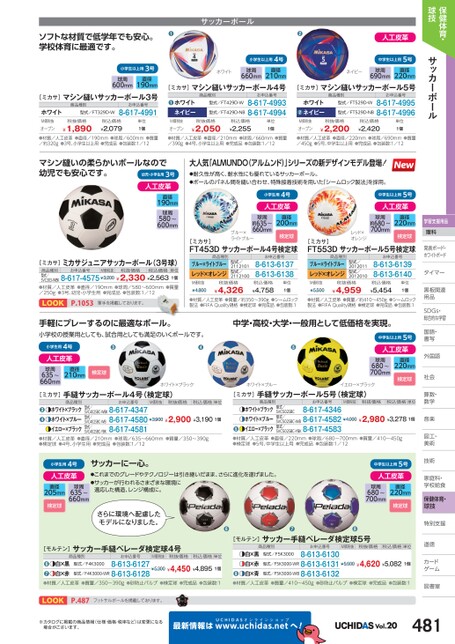 保健体育・球技サッカーボール学習支援用品理科発表ボード・発表ボード・ホワイトボードトタイマータイマー黒板関連黒板関連用品用品SDGs・DGs・総合的な学習習国語・語・書写写外国語国社会社会算数・数・数学学図工・工・美術術技術術家庭科・家庭科・学校給食校食保健体育・球技特別支援別道徳徳カードゲームム図書室書小学生用4号人工皮革直径球周635〜660mm205mm検定球サッカーに一心。●これまでのグレードやテクノロジーは引き継いだまま、さらに進化を遂げました。●サッカーが行われるさまざまな環境に適応した構造、レンジ構成に。さらに環境へ配慮したモデルになりました。●●●中学生以上用5号人工皮革直径220mm球周680〜700mm検定球[モルテン]サッカー手縫ペレーダ検定球5号商品種別お申込番号M価税抜税抜価格税込価格単位¥5,500¥4,620¥5,0821個●●材質/人工皮革●質量/410〜450g●砂防止バルブ●検定球●完成品●包装数:1白×黒白×赤白×青型式/F5K30008-613-6130型式/F5K3000-WR8-613-6131型式/F5K3000-WB8-613-6132●●商品種別お申込番号M価税抜税抜価格税込価格単位白×黒白×赤型式/F4K30008-613-6127型式/F4K3000-WR8-613-6128●●材質/人工皮革●質量/350〜390g●砂防止バルブ●検定球●完成品●包装数:1¥5,300¥4,450¥4,8951個●[モルテン]サッカー手縫ペレーダ検定球4号LOOKP.487フットサルボールを掲載しております。※カタログに掲載の商品情報(仕様・価格・税率など)は変更になる場合がございます。最新情報はUCHIDASww.uchidas.netwへ!Vol.20481ソフトな材質で低学年でも安心。学校体育に最適です。❶サッカーボール❷人工皮革小学生以上用3号直径球周190mm[ミカサ]マシン縫いサッカーボール3号600mm商品種別ホワイト型式/FT329D-Wお申込番号8-617-4991ホワイト210mm[ミカサ]マシン縫いサッカーボール4号660mmネイビー220mm[ミカサ]マシン縫いサッカーボール5号690mm商品種別●ホワイトネイビー型式/FT429D-W型式/FT429D-NBお申込番号8-617-49938-617-4994ホワイトネイビー商品種別型式/FT529D-Wお申込番号8-617-49958-617-4996小学生以上用4号直径球周中学生以上用5号直径球周税抜価格¥1,890M価税抜オープン●材質/人工皮革●直径/190mm●球周/600mm●質量/約320g●3号、小学生以上用●完成品●包装数:1/12税込価格¥2,079単位1個税抜価格¥2,050M価税抜オープン●材質/人工皮革●直径/210mm●球周/660mm●質量/390g●4号、小学生以上用●完成品●包装数:1/12税込価格¥2,255単位1個税抜価格型式/FT529D-NB●M価税抜オープン●材質/人工皮革●直径/220mm●球周/690mm●質量/450g●5号、中学生以上用●完成品●包装数:1/12¥2,200税込価格¥2,420単位1個マシン縫いの柔らかいボールなので幼児でも安心です。幼児・小学生用3号人工皮革直径190mm球周580〜600mm[ミカサ]ミカサジュニアサッカーボール(3号球)商品種別型式/お申込番号M価税抜税抜価格税込価格単位SVC303-WBK8-617-4575¥3,200¥2,330¥2,5631個●材質/人工皮革●直径/190mm●球周/580〜600mm●質量/250g●3号、幼児・小学生用●完成品●包装数:1/12LOOKP.1053軍手を掲載しております。大人気「ALMUNDO(アルムンド)」シリーズの新デザインモデル登場!●耐久性が高く、耐水性にも優れているサッカーボール。●ボールのパネル間を縫い合わせ、特殊接着技術を用いた「シームロック製法」を採用。小学生用4号人工皮革直径球周約635〜660mm200mm検定球ブルー×ライトブルー中学生以上用5号人工皮革直径220mm球周約680〜700mm検定球レッド×オレンジ[ミカサ]FT453Dサッカーボール4号検定球[ミカサ]FT553Dサッカーボール5号検定球商品種別ブルー×ライトブルーレッド×オレンジ型式/2112101型式/2112100M価税抜¥4,800税抜価格¥4,326お申込番号8-613-61378-613-6138商品種別ブルー×ライトブルーレッド×オレンジ型式/2012011型式/2012010税込価格¥4,758単位1個M価税抜¥5,500税抜価格¥4,959お申込番号8-613-61398-613-6140税込価格¥5,454単位1個●材質/人工皮革●質量/約350〜390g●シームロック製法●FIFAQuality規格●検定球●完成品●包装数:1●材質/人工皮革●質量/約410〜450g●シームロック製法●FIFAQuality規格●検定球●完成品●包装数:1手軽にプレーするのに最適なボール。小学校の授業用としても、試合用としても満足のいくボールです。中学・高校・大学・一般用として低価格を実現。中学生以上用5号商品種別ホワイト×ブラックホワイト×ブルーイエロー×ブラック型式/SVC502SBC型式/8-617-4346SVC502SBC-WB8-617-4582SVC502SBC-YBK8-617-4583型式/●●材質/人工皮革●直径/220mm●球周/680〜700mm●質量/410〜450g●検定球●5号、中学生以上用●完成品●包装数:1/12¥4,000¥2,980¥3,2781個音楽楽¥3,900¥2,900¥3,1901個型式/SVC402SBC-WBK8-617-43478-617-45808-617-4581型式/SVC402SBC-WB型式/SVC402SBC-YBK商品種別ホワイト×ブラックホワイト×ブルーイエロー×ブラック●●●材質/人工皮革●直径/210mm●球周/635〜660mm●質量/350〜390g●検定球●4号、小学生用●完成品●包装数:1/12[ミカサ]手縫サッカーボール4号(検定球)[ミカサ]手縫サッカーボール5号(検定球)お申込番号M価税抜税抜価格税込価格単位お申込番号M価税抜税抜価格税込価格単位ホワイト×ブラックホワイト×ブルーイ