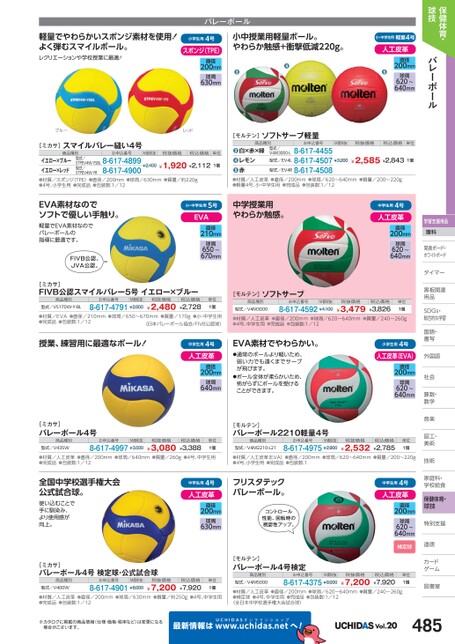 保健体育・球技バレーボール学習支援用品理科発表ボード・発表ボード・ホワイトボードトタイマータイマー黒板関連黒板関連用品用品SDGs・DGs・総合的な学習習国語・語・書写写中学生用4号人工皮革直径200mm球周620〜640mm税抜価格¥3,479税込価格¥3,826単位1個軽量でやわらかいスポンジ素材を使用!よく弾むスマイルボール。レクリエーションや学校授業に最適!バレーボール小学生用4号スポンジ(TPE)小中授業用軽量ボール。やわらか触感+衝撃低減220g。直径200mm球周630mm●●小・中学生用軽量4号人工皮革直径●200mm球周620〜640mmM価税抜税抜価格税込価格単位¥3,200¥2,585¥2,8431個[モルテン]ソフトサーブ軽量商品種別お申込番号型式/V4M3000-L8-617-4455型式/EV4L8-617-4507型式/EV4R8-617-4508白×赤×緑レモン赤●●●単位1個●材質/人工皮革●直径/200mm●球周/620〜640mm●質量/200〜220g●軽量4号、小・中学生用●完成品●包装数:1/12ブルーレッド[ミカサ]スマイルバレー縫い4号商品種別お申込番号M価税抜税抜価格税込価格型式/STPEV4W-YSBL8-617-48998-617-4900イエロー×ブルーイエロー×レッド●材質/スポンジ(TPE)●直径/200mm●球周/630mm●質量/約220g●4号、小学生用●完成品●包装数:1/12¥1,920¥2,112型式/STPEV4W-YR¥2,400EVA素材なのでソフトで優しい手触り。軽量でEVA素材なのでバレーボールの指導に最適です。FIVB公認。JVA公認。小・中学生用5号EVA中学授業用やわらか触感。直径210mm球周650〜670mm[ミカサ]FIVB公認スマイルバレー5号イエロー×ブルー商品種別型式/VS170W-Y-BLお申込番号M価税抜8-617-4791¥2,800税抜価格¥2,480税込価格¥2,728単位1個●材質/EVA●直径/210mm●球周/650〜670mm●質量/170g●小・中学生用●完成品●包装数:1/12〈日本バレーボール協会/FIVB公認球〉授業、練習用に最適なボール!中学生用4号人工皮革直径200mm球周640mm[ミカサ]バレーボール4号商品種別型式/V435Wお申込番号M価税抜8-617-4997¥3,500税抜価格¥3,080税込価格¥3,388単位1個[モルテン]ソフトサーブ商品種別型式/V4M3000お申込番号M価税抜8-617-4592¥4,100●材質/人工皮革●直径/200mm●球周/620〜640mm●質量/240〜260g●4号、中学生用●完成品●包装数:1/12EVA素材でやわらかい。小学生用4号●通常のボールより軽いため、弱い力でも遠くまでサーブが飛びます。●ボール全体が柔らかいため、怖がらずにボールを受けることができます。[モルテン]バレーボール2210軽量4号商品種別型式/V4M2210-L21お申込番号M価税抜8-617-4975¥2,900人工皮革(EVA)外国語国直径200mm球周620〜640mm税抜価格¥2,532税込価格¥2,785単位1個社会社会算数・数・数学学音楽楽図工・工・美術術●材質/人工皮革●直径/200mm●球周/640mm●質量/260g●4号、中学生用●完成品●包装数:1/12●材質/人工皮革(EVA)●直径/200mm●球周/620〜640mm●質量/200〜220g●4号、小学生用●完成品●包装数:1技術術全国中学校選手権大会公式試合球。使い込むことで手に馴染み、より使用感が向上。中学生用4号人工皮革直径200mm球周630mmフリスタテックバレーボール。コントロール性能、回転時の視認性アップ。[ミカサ]バレーボール4号検定球・公式試合球商品種別型式/V400Wお申込番号M価税抜8-617-4901¥8,000税抜価格¥7,200税込価格¥7,920単位1個●材質/人工皮革●直径/200mm●球周/630mm●質量/約250g●4号、中学生用●完成品●包装数:1/12[モルテン]バレーボール4号検定商品種別型式/V4M5000お申込番号M価税抜8-617-4375¥8,000●材質/人工皮革●直径/200mm●球周/620〜640mm●質量/240〜260g●検定球●4号、中学生用●完成品●包装数:1/12〈全日本中学校選手権大会試合球〉※カタログに掲載の商品情報(仕様・価格・税率など)は変更になる場合がございます。最新情報はUCHIDASww.uchidas.netwへ!Vol.20485中学生用4号人工皮革直径200mm球周620〜640mm検定球税抜価格¥7,200税込価格¥7,920単位1個家庭科・家庭科・学校給食校食保健体育・球技特別支援別道徳徳カードゲームム図書室書