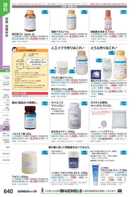 ※金属イオンを含む廃液は処理業者などに委託し、適切に処理してください。※試薬・実験材料につきましては、外装が変更になる場合があります。ご了承ください。※試薬類につきましては、お客様のご都合による返品はお受けできません。試薬・実験材料質量500g質量500g容量15mL塩化鉄(Ⅱ)(塩化第一鉄)お申込番号M価税抜税抜価格税込価格8-615-4459¥5,300¥5,035¥5,538単位1本●質量/500g●包装数:1人工イクラの作り方アルギン酸ナトリウム水溶液に食紅を混ぜておけば赤い粒になるよ!<材料>・水50mL・アルギン酸ナトリウム1g程度→ビーカーに入れた水を、ガラス棒でかくはんしながらアルギン酸ナトリウムを溶かしておく。<生成場所>・水200mL・塩化カルシウム10〜20g程度→別のビーカーに入れて混ぜておく。材料を生成場所のビーカーにピペットで1滴ずつ垂らすとイクラのような透明な粒々ができあがります。LOOK薬包紙を掲載しております。P.722融点(凝固点)の実験に。容量25gパルミチン酸25gお申込番号M価税抜税抜価格税込価格8-615-2477¥2,650¥2,516¥2,767単位1本硫酸マグネシウムお申込番号M価税抜税抜価格税込価格8-615-4460¥2,350¥2,233¥2,456硝酸銀水溶液0.1molお申込番号M価税抜税抜価格税込価格8-615-4462¥1,500¥1,425¥1,567単位1本単位1本商品種別型式/R8251●質量/500g●包装数:1商品種別型式/R8229●容量/15mL●包装数:1人工イクラ作りはこれ!とうふ作りはこれ!容量500g容量100g●容量25g●容量500gアルギン酸ナトリウムお申込番号M価税抜税抜価格税込価格単位8-615-1494¥2,500¥2,375¥2,6121本●●容量/25g●包装数:1塩化カルシウム(結晶)お申込番号M価税抜税抜価格税込価格単位8-615-1495¥3,200¥3,042¥3,3461本●●容量/500g●包装数:1塩化マグネシウムお申込番号M価税抜8-615-3405¥1,000商品種別にがり100g※仕様が変更になる場合があります。税抜価格税込価格¥949¥1,043単位1本型式/P21518-615-4461¥3,150¥2,992¥3,2911本500g商品種別●包装数:1サイエンスマジックに!●紙おむつでもこの物質を利用!●吸水力約400倍!容量200gろうそくの原料、キャンドルづくりに。※必ず湯煎またはろう容器で溶かしてください。※パラフィンの入った鍋を直接火にかけると引火する恐れがありますので、絶対に行わないでください。容量1kg粒状吸水性ポリマー200gお申込番号M価税抜税抜価格税込価格8-615-1193¥1,600¥1,520¥1,672単位1本商品種別型式/ST-500D商品種別[東京ローソク]パラフィンお申込番号M価税抜8-615-2467¥2,600税抜価格¥2,4701kg(融点約58℃)税込価格¥2,717単位1袋型式/06-7011●容量/25g●包装数:1●容量/200g●材質/吸水性ポリマー●包装数:1●粒状●包装数:1/20葉の裏に塗って蒸散量を比べてみよう。容量500g手指の保湿にもお使いいただけます。容量100g●水や水蒸気を通さないので、植物の蒸散の実験に最適です。●少量ずつ出せ、グループ用にも便利なチューブタイプです。●敏感肌でもお使いいただけます。容量60g理科試薬・実験材料学習支援用品理科ビーカー・ビーカー・容器類容器類スタンド類・加熱器具加熱器安全配慮安全配温度計・温度計計量・計測鏡・鏡・レンズ・レンズ・磁石磁石電気・電気・パーツ類パーツ類エネルギーエネルギーろ紙・ろ紙・試験紙・試験紙環境測定環境測薬品・実験材料実験キット・おもしろ実験し理科教材・実験器実験器観察観察飼育・栽培飼育・栽培収納・管理[大洋製薬]ワセリンHGボトル100gお申込番号M価税抜8-637-5670オープン税抜価格¥780税込価格¥858単位1本商品種別型式/4975175023214●寸法/56(径)×78(高)mm白色ワセリン●pH/中性●包装数:1/10●内容量/100g●成分/[大洋製薬]ワセリンHGチューブ60g商品種別型式/23221お申込番号8-637-5220M価税抜¥800税抜価格¥720税込価格¥792単位1本●寸法/38(幅)×30(奥)×150(高)mm●内容量/60g●包装数:1/100Vol.20この他にも別冊に理科関連用品を掲載しております。ワセリン500gお申込番号M価税抜税抜価格税込価格8-615-2549¥3,350¥3,184¥3,502単位1本●容量/500g●包装数:1640