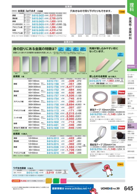 理科金属板・金属材料学習支援用品理科ビーカー・ビーカー・容器類器スタンド類・加熱器具熱安全配慮全温度計・度・計量・計測鏡・鏡・レンズ・レンズ・磁石石電気・電気・パーツ類パーツ類エネルギーエネルギーろ紙・ろ紙・試験紙・験・環境測定境薬品・実験材料実験キット・おもしろ実験理科教材・教実験器実験器観察察飼育・栽培飼育・栽培収納・管理先端が差し込みやすい形になっています。10×50mm銅板亜鉛板差し込める金属板各10枚入お申込番号8-615-2570M価税抜税抜価格¥2,000¥1,903¥2,093税込価格単位1組(各10枚入)商品種別銅板・亜鉛板型式/P3724●寸法/10×50×0.5(厚)mm(1枚)●包装数:120m実験例銅箔テープに硝酸銀水溶液を滴下した様子。銅箔テープ10mm×20mお申込番号M価税抜税抜価格税込価格単位8-619-2703¥1,200¥1,140¥1,2541巻商品種別型式/P3812●寸法/約10幅)mm×20(長)m●厚さ/0.05mm●包装数:1※仕様が変更になる場合があります。1m実験例亜鉛箔テープに硫酸銅水溶液を滴下した様子。亜鉛箔テープ25mm×1mお申込番号M価税抜税抜価格税込価格単位8-619-2704¥1,200¥1,140¥1,2541巻商品種別型式/P3813●寸法/約25(幅)mm×1長)m●包装数:1●厚さ/0.1mm※仕様が変更になる場合があります。金属板[BSS]金属板3φ穴あき10枚組商品種別お申込番号M価税抜税抜価格税込価格単位銅板亜鉛板鉄板ステンレス板(SUS304)アルミニウム板鉛板マグネシウム板●寸法/45×150mm●包装数:1/50亜鉛・鉛・マグネシウム)、1/100(銅・鉄・ステンレス・アルミニウム)8-615-3422¥3,800¥3,573¥3,9308-615-3421¥3,000¥2,709¥2,9798-615-3423¥1,700¥1,650¥1,8158-615-3424¥2,100¥1,891¥2,0808-615-3425¥1,350¥1,266¥1,3928-615-3426¥4,800¥4,319¥4,7508-615-5181¥6,100¥5,491¥6,040純度/99.9%以上、厚さ/0.5mm純度/99.5%以上、厚さ/0.5mm純度/99%以上、厚さ/0.5mm厚さ/0.3mm純度/99.5%以上、厚さ/0.5mm純度/99.5%以上、厚さ/0.8mm純度/95%以上、厚さ/0.5mm(10枚組)1セット穴あきなので吊り下げたりもできます。10枚組銅板亜鉛板鉄板ステンレス板アルミニウム板鉛板マグネシウム板金属材料身の回りにある金属の特徴は?実験によく使われる8種類の金属板を用意しました。12×50mm50×100mm45×150mm300×300mm※理科実験に使用する素材のため、表面処理をしておりません。びた場合は、やすりで削ったりびとり剤を使用して除却してください。銅板亜鉛板鉄板ステンレス板アルミニウム板ニッケル板鉛板真ちゅう(黄銅)板金属板1枚商品種別銅板亜鉛板鉄板ステンレス板アルミニウム板ニッケル板鉛板0.5mm厚さ/0.3mm厚さ/0.5mm厚さ/0.5mm50×100mm45×150mm300×300mm50×100mm45×150mm300×300mm厚さ/50×100mm45×150mm300×300mm50×100mm45×150mm300×300mm50×100mm45×150mm50×100mm45×150mm45×150mm厚さ/1.0mm厚さ/0.5mm厚さ/0.3mm厚さ/0.5mm真ちゅう(黄銅)板●包装数:1金属板10枚入銅板亜鉛板鉄板アルミニウム板●厚さ/0.5mm●包装数:1商品種別12×50mm12×50mm12×50mm50×100mm45×150mm12×50mm単位1枚単位お申込番号8-615-17518-615-11688-615-17568-615-17528-615-11698-615-17578-615-17548-615-11718-615-17588-615-17558-615-11728-615-17598-615-17938-615-11738-615-19328-615-44018-615-1930お申込番号8-615-33138-615-33148-615-33158-615-23368-615-23378-615-3316M価税抜¥360¥370¥4,750¥620¥650¥1,080¥790¥300¥3,920¥220¥180¥2,350¥2,700¥2,100¥750¥460¥1,000M価税抜¥450¥370¥320¥1,650¥1,800¥320税抜価格¥339¥351¥584¥630¥745¥290税込価格¥372¥386¥4,477¥4,924¥642¥693¥1,026¥1,128¥819¥319¥3,694¥4,063¥227¥188¥2,215¥2,436¥2,565¥2,821¥2,000¥2,200¥713¥784¥446¥490¥946¥1,040¥207¥171税抜価格¥422¥347¥302税込価格¥464¥381¥332¥1,582¥1,740¥1,728¥1,900¥336¥3061組(10枚入)うずまき銅線10本入商品種別型式/R4320お申込番号8-615-1145M価税抜¥3,100税抜価格¥3,019税込価格¥3,320単位1組(10本入)10本入●寸法/230(長)×1(径)×8(巻径)mm●包装数:1LOOKP.294紙ヤスリを掲載しております。※カタログに掲載の商品情報(仕様・価格・税率など)は変更になる場合がございます。最新情報はUCHIDASww.uchidas.netwへ!Vol.20645