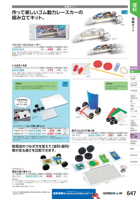理科実験キット対象年齢8歳以上制作例組立例作って楽しいゴム動力レースカーの組み立てキット。実験キット[池田工業社]ゴムゴムレーサーお申込番号8-612-7514M価税抜¥550税抜価格¥440税込価格¥484単位1セット●寸法/組立時:70(幅)×230(奥)×80(高)mm、パッケージ/100(幅)×20(奥)×255(長)mm●質量/60g●材質/ABS樹脂、ラバー、鉄、POM、木、紙●対象年齢/8歳以上●包装数:1/12いとまきぐるまお申込番号8-615-3286M価税抜¥195税抜価格¥174税込価格¥191単位1セット●寸法/車輪:54(径)×15(厚)mm、筒:23(径)×55(長)mm、プラスチック棒:5径)×200(長)mm●材質/ポリプロピレン●包装数:1〈セット内容〉車輪×2、筒×1、プラスチック棒×1、輪ゴム×3組立例(実験例)①輪ゴムを伸ばす長さを変えて、車が走る距離を調べる(5cm・10cm)。②輪ゴムの本数を変えて車が走る距離を調べる。対象年齢小学校3年以上(組立例)①ゴムをひっぱって戻る力で動く車②風を受けて動く車取扱説明書にメジャーが付いています。ゴム通し穴付き組立例組立例[ウチダテクノ]ゴムで動く車セット商品種別税込価格¥5851セット10セット型式/P51378-615-3467¥5,250¥4,891¥5,380型式/P51398-615-3466¥532M価税抜¥560お申込番号税抜価格単位1セット1組(10セット入)●制作時間の目安/15分●対象年齢/小学校3年生以上●包装数:1〈セット内容〉車台、車軸×2本、発射台、輪ゴム×2本、タイヤ×4個、取扱説明書(メジャー付最大30cm)風やゴムの力で動く車商品種別型式/P5132お申込番号8-615-1975※車台は1つです。M価税抜¥570税抜価格¥551税込価格¥606単位1セット●寸法/プラスチック段ボール:150×200mm、前輪:60(径)mm、後輪:75径)mm●包装数:1〈セット内容〉車台(プラスチック段ボール)、タイヤ、車軸、工作方眼用紙、輪ゴム、金具、発射機乾電池のつなぎ方を変えて(並列・直列)車が走る速さを比較できます。学習支援用品理科ビーカー・ビーカー・容器類器スタンド類・加熱器具熱安全配慮全温度計・度・計量・計測鏡・鏡・レンズ・レンズ・磁石石電気・電気・パーツ類パーツ類エネルギーエネルギーろ紙・ろ紙・試験紙・験・環境測定境薬品・薬品・実験材料験実験キット・おもしろ実験理科教材・教実験器実験器観察察飼育・栽培飼育・栽培収納・管理[ウチダテクノ]電池で動く車セット商品種別型式/P5134お申込番号8-615-2572組立例M価税抜¥880税抜価格¥828税込価格¥910単位1セット●包装数:1〈セット内容〉車台(プラスチック段ボール)、タイヤ(直径50mm)、車軸、プーリー、2段プーリー、ハトメ、輪ゴム、単三乾電池ボックス、モーター、モーターベース、スイッチ、両面テープ、ビニル銅線、説明書※単三乾電池×2個は付属していません。100mmmm0915mm※カタログに掲載の商品情報(仕様・価格・税率など)は変更になる場合がございます。最新情報はUCHIDASww.uchidas.netwへ!Vol.20647
