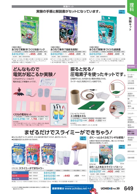 理科実験キット実験キット実験の手順と解説書がセットになっています。対象年齢6歳以上[池田工業社]おうちで実験!手づくり冷却パックお申込番号M価税抜8-619-3702オープン税抜価格¥455税込価格¥500単位1個[池田工業社]おうちで事件!?指紋を採取!お申込番号M価税抜8-619-3703オープン税抜価格¥455税込価格¥500単位1個[池田工業社]おうちで実験!手づくりろ過装置お申込番号M価税抜8-619-3704オープン税抜価格¥590税込価格¥649単位1個商品種別型式/000000900商品種別型式/000000810商品種別型式/000000910●パッケージ寸法/85(幅)×40(奥)×140(高)mm●材質/尿素、ポリプロピレン、PET、アルミニウム、ポリエチレン●対象年齢/6歳以上●包装数:1/12●パッケージ寸法/85(幅)×40(奥)×140(高)mm●材質/竹、ガチョウの羽、蓄光パウダー、ポリエチレンテレフタレート、紙●対象年齢/6歳以上●包装数:1/12●パッケージ寸法/85(幅)×40(奥)×140(高)mm●材質/炭、わた(ポリエステル)、綿、ゴム●対象年齢/6歳以上●包装数:1/12どんなもので電気が起こるか実験!くだものやジュースなどで電気を起こす実験キットです。振ると光る!圧電素子を使ったキットです。圧電素子とは、力が加わると電気を発生させる、ライターなどに利用されている素子です。学習支援用品理科ビーカー・ビーカー・容器類器スタンド類・加熱器具熱安全配慮全温度計・度・計量・計測鏡・鏡・レンズ・レンズ・磁石石電気・電気・パーツ類パーツ類エネルギーエネルギーろ紙・ろ紙・試験紙・験・環境測定境薬品・薬品・実験材料験実験キット・おもしろ実験理科教材・教実験器実験器観察察飼育・栽培飼育・栽培収納・管理くだもの電池セットお申込番号M価税抜8-615-2796¥1,900税抜価格税込価格¥1,765¥1,941単位1セット●包装数:1〈セット内容〉電子メロディ(ケース付)×1、銅板×2枚、亜鉛板×2枚、クリップ付リード線×3個、コップ×2個、やすり組立例使用例[コンセプトプラス]エコ発電ホタルお申込番号8-615-2770¥1,000M価税抜税抜価格税込価格単位¥955¥1,0501セット実験例●包装数:1〈セット内容〉紙筒、圧電素子、LED、石、紙の葉まぜるだけでスライミーができちゃう!●もともと色がついていますが、さらに絵の具で色がつけられ、遊び方いろいろ。●溶液量を変えると形作りもできます。対象年齢6歳以上ぷく〜っとふくらむフシギな感覚!太陽光や蛍光灯の光を吸収し、暗いところで光る「蓄光材」を使用しています。対象年齢6歳以上ブルーピンクパープル使用例[デビカ]スライミーができちゃう〜商品種別お申込番号M価税抜税抜価格税込価格型式/090634ブルーピンクパープル●材質/スライミー材料:PVA溶液(100mL)、ホウ砂溶液(100mL)●付属品/作り方説明書●包装数:1/308-615-21928-615-51838-615-5184¥440型式/093650型式/090681¥550¥484単位1セット※カタログに掲載の商品情報(仕様・価格・税率など)は変更になる場合がございます。最新情報はUCHIDASww.uchidas.netw[デビカ]ほわ〜んと光る!スライミーバルーンお申込番号8-619-3707M価税抜¥450税抜価格¥400税込価格¥440単位1セット使用例商品種別型式/093685●パッケージ寸法/130(幅)×15(奥)×178(高)mm●材質/スライミーバルーン:水・蓄光材・ポリビニルアルコール・防腐剤・ホウ砂、ストロー:ポリプロピレン●包装数:1/12〈セット内容〉スライミーバルーン(保存袋入)×2個、ストロー×1本へ!Vol.20649