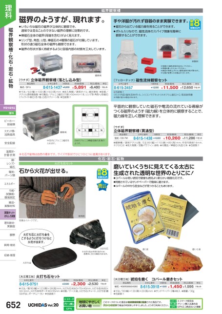磁界観察槽磁界のようすが、現れます。●いろいろな磁石の磁界が立体的に観察でき、通常では見ることのできない磁界の理解に効果的です。●棒磁石全体の磁界(両端を含む)がよく見えます。●リング型、角型、U型、棒磁石の4種類の磁石が付属しています。形状の違う磁石全体の磁界も観察できます。●磁界の形状が長く持続するように容器内部の材質を工夫しています。[ウチダ]立体磁界観察槽(落とし込み型)商品種別型式/DF-Sお申込番号M価税抜8-615-1437¥6,200税抜価格¥5,891観察例税込価格¥6,480単位1セット手や洋服が汚れず容器のまま実験できます。●磁石から出ている磁力線を見ることができます。●ボトル入りなので、磁性流体のスパイク現象を簡単に観察することができます。実験例※容器から磁性流体を出さないでください。※容器を振ったりしないでください。※商品の特性上ボトルに磁性流体の粒が残ります。※仕様が変更になる場合がございます。[フェローテック]磁性流体観察セットお申込番号8-615-3457M価税抜¥12,000税抜価格¥11,500税込価格単位¥12,6501セット●寸法/60(幅)×100(奥)×60(高)mm●封入物質/透明オイル、線状鉄粉●容器/アクリル透明樹脂製●付属品/アルニコ磁石(7(径)×50mm)×1本、リング型・角型・U型磁石(フェライト磁石)各1個、白色スクリーン板●包装数:1●包装数:1〈セット内容〉磁性流体ボトル、シリコンマグネット(ネオジウム磁石)×2、取扱説明書※外観が変わる場合があります。平面的に観察していた磁石や電流の流れている導線がつくる磁界のようす(磁力線)を立体的に観察することで、磁力線を正しく理解できます。観察例中空内にアルニコ磁石を入れます。2本のアルニコ棒磁石線の反発のようす。[ウチダ]立体磁界観察槽(貫通型)商品種別型式/DD-7Mお申込番号M価税抜8-615-1438¥10,800税抜価格¥10,260税込価格単位¥11,2861セット●観察槽/透明アクリル製、寸法:80(幅)×110(奥)×80(高)mm、中空円筒径14mm、ネジふた付●封入物質/流動パラフィン、鉄粉●付属品/棒磁石(丸型)2本●包装数:1※化石や鉱物は自然の標本です。サイズや形状でひとつひとつに差異があります。化石・岩石・鉱物磨いていくうちに見えてくる太古に生成された透明な世界のとりこに!●コパールは若い琥珀で硬度も琥珀より柔らかい樹脂化石です。●同梱されているサンドペーパーで簡単に磨けます。●コパールの中から昆虫などが見つかることもあります。火打ち石セット石から火花が出せる。写真はイメージです。使用例火打ち石に火打ち金をこするように打ちつけると火花が出ます。火打ち石※火打ち石は天然の石のため、使用中に欠ける場合があります。磨く前磨いた後火打ち金火打ち石セット[大江理工社]お申込番号8-615-0751M価税抜¥2,500税抜価格¥2,300税込価格¥2,530単位1セット●寸法/箱:90幅)×133奥)×38高)mm、火打ち石:約60×70×40mm、火打ち金:約80×30×3mm、火打ち金用ポーチ:80×95mm●材質/ケース:紙、火打ち石:チャート、火打ち金:鋼(はがね)、ポーチ:レーヨン●包装数:1[大江理工社]琥珀を磨くコパール磨きセット商品種別型式/4589580604380お申込番号M価税抜税抜価格税込価格8-615-3918¥1,500¥1,450¥1,595単位1セット●寸法/90(幅)×130(奥)×20(高)mm●サンドペーパー3種4枚入●質量/30g●包装数:1652Vol.20地球にやさしくお買い物このマークのついた商品は地球環境保護に配慮された商品です。グリーンの文字で商品の判別をしやすくしました。どうぞご利用ください。エコマーク認定品グリーン購入法適合品GPNエコ商品ねっと掲載理科磁界観察槽・化石・岩石・鉱物学習支援用品理科ビーカー・ビーカー・容器類容器類スタンド類・加熱器具加熱器安全配慮安全配温度計・温度計計量・計測鏡・鏡・レンズ・レンズ・磁石磁石電気・電気・パーツ類パーツ類エネルギーエネルギーろ紙・ろ紙・試験紙・試験紙環境測定環境測薬品・薬品・実験材料実験材実験キット・おもしろ実験理科教材・実験器実験器観察観察飼育・栽培飼育・栽培収納・管理