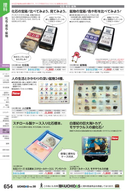 ※化石や鉱物は自然の標本です。サイズや形状でひとつひとつに差異があります。化石・岩石・鉱物化石の宝箱!比べてみよう、見てみよう。鉱物の宝箱!色や形を比べてみよう!アンモナイトやサメの歯、恐竜の骨化石など人気の化石を詰め込んだお得な一品です。サイズが小さいもの、欠けている化石を入れています。●石英・紫水晶・ホタル石・メノウなど人気も知名度も高い鉱物の結晶やカケラがいっぱい詰まったお得な小箱。●わかりやすい鉱物ガイド付き。鉱物についての詳しい説明はパッケージの二次元コードから!化石についての詳しい説明はパッケージの二次元コードから!※本品はサイズの小さいものや欠けているものなどを使用するので標本や展示用に使用されるものとは異なります。また裏面の説明書に記載されているものすべてが入っていない場合がございます。あらかじめご了承ください。何が入っているかおたのしみ![大江理工社]化石箱※本品は天然の鉱物を割っているものがあり、鋭利な箇所がある場合がございます。お取り扱いには十分ご注意ください。また裏面の説明書や鉱物ガイドに記載されている鉱物すべてが入っていない場合がございます。あらかじめご了承ください。[大江理工社]鉱物箱商品種別型式/4589580603994商品種別型式/4589580602270お申込番号M価税抜税抜価格税込価格8-615-3785オープン¥1,300¥1,430単位1セットお申込番号M価税抜税抜価格税込価格8-615-3786¥1,100¥1,000¥1,100単位1セット●寸法/箱:35幅)×70(奥)×25(厚)mm●質量/60g●包装数:1●寸法/箱:35幅)×70奥)×25厚)mm●質量/70g●包装数:1人の生活とかかわりの深い鉱物24種。●知名度の高い美しい鉱物や人間の生活に密着した鉱物が24種入った組標本です。●各鉱物をイラスト入りで解説。[大江理工社]商品種別人と鉱物お申込番号型式/45895806011988-619-4112オープンM価税抜税抜価格税込価格¥2,200¥2,420単位1セット●寸法/260(幅)×185奥)×20(高)mm●質量/220g●材質/鉱物、紙、塩化ビニル●包装数:1スチロール製ケース入り化石標本。ケースには化石標本の産地、年代が記載してあります。白亜紀の巨大海トカゲ、モササウルスの歯化石!映画でも有名な白亜紀後期の巨大海生爬虫類、モササウルスの歯化石です!保管に便利なケース付き。理科化石・岩石・鉱物学習支援用品理科ビーカー・ビーカー・容器類容器類スタンド類・加熱器具加熱器安全配慮安全配温度計・温度計計量・計測鏡・鏡・レンズ・レンズ・磁石磁石電気・電気・パーツ類パーツ類エネルギーエネルギーろ紙・ろ紙・試験紙・試験紙環境測定環境測薬品・薬品・実験材料実験材実験キット・おもしろ実験理科教材・実験器実験器観察観察飼育・栽培飼育・栽培収納・管理[大江理工社]化石シリーズ化石標本(スチロールケース入)アンモナイトお申込番号8-615-2446M価税抜¥2,000税抜価格¥1,800税込価格¥1,980単位1個[大江理工社]スチロールケース入モササウルスの歯商品種別お申込番号型式/45895806009798-619-4113¥2,000M価税抜税抜価格税込価格¥1,800¥1,980単位1個●寸法/ケース:60(幅)×95(奥)×20高)mm、標本本体:35〜40最大径)mm●質量/30〜110gケース含)●ケース材質/ポリスチレン●包装数:1●寸法/ケース:95幅)×65(奥)×20高)mm●質量/55g(ケース含)●ケース材質/紙、プラスチック●包装数:1654Vol.20この他にも別冊に理科関連用品を掲載しております。