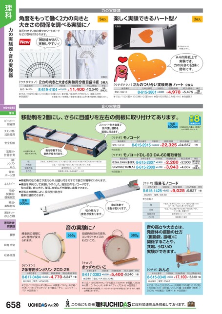 角度をもって働く2力の向きと大きさの関係を調べる実驗に!磁石付きで、鉄の棒やホワイトボードなどに取り付けられます。補助線があり、実験しやすい!力の実験器5枚入楽しく実験できるハート型!2枚入実験例※ばねはかりは付属しません。A4の用紙上で実験でき、力の向きの記録に便利です。実験例[ウチダテクノ]商品種別型式/R42362力の向きと大きさ実験用分度目盛り板5枚入お申込番号8-619-4104M価税抜¥12,000税抜価格税込価格¥11,400¥12,540単位1組(5枚入)●寸法/約297(幅)×210(奥)×3(厚)mm●材質/発泡ポリプロピレン●磁石付き●包装数:1※鉄製スタンドを使用して実験する場合には吊り棒の磁性をご確認ください。[ウチダテクノ]2カのつり合い実験用板ハート2枚入商品種別型式/R4210税込価格¥5,475●寸法/150(幅)×130(奥)×2(厚)mm●取り付け用たこ糸付(4m)●包装数:18-615-3801¥6,000¥4,978お申込番号税抜価格M価税抜単位1組(2枚入)音の実験器移動駒を2個にし、さらに目盛りを左右の側板に取り付けてあります。ストッパー付き歯車で弦の張り調節を確実に行えます。弦長600mm※在庫切れの場合、納期がかかる場合があります。※外観が変わる場合があります。駒を移動すると音色が変わります。弦共鳴箱弦張方法その他2弦式、弦長600mm、ピアノ線0.2(径)mm・0.4(径)×900(長)mm×各2本寸法/130(幅)×670(奥)×75(高)mm、木製歯車使用(ストッパー付)移動駒×2個、部品収納ケース付●移動駒で弦の長さが変えられ、目盛り付きですので長さが簡単にわかります。●構造を単純にして実験しやすくした、簡易型のモノコードです。弦の振動、音の大小、強弱、高低などが簡単に実験できます。●逆転止め機構により、弦の張り具合を簡単に調節できます。弦長600mm[ウチダ]モノコード商品種別型式/DL-60●包装数:1お申込番号M価税抜税抜価格8-615-2915¥23,500¥22,325¥24,557税込価格単位1台[ウチダ]モノコードDL-60・DA-60用取替弦商品種別お申込番号M価税抜0.2mm、0.4mm(各2本入)8-615-2807¥2,4000.2mm(10本入)8-615-2808¥4,150税抜価格¥2,280¥3,943税込価格¥2,508¥4,337単位1組(各2本(計4本)入)1組(10本入)●包装数:1[ウチダ]簡易モノコードお申込番号M価税抜税抜価格税込価格8-615-1425¥9,500¥9,025¥9,927単位1台駒の移動で音色が変わります。弦の張力で音色が変わります。商品種別型式/DA-60●包装数:1弦本体弦張方法その他1弦式、弦長600mm、ピアノ線0.2(径)mm・0.4(径)×900(長)mm×各2本寸法/60(幅)×640(奥)×50(高)mm、アルミ製、目盛り付歯車使用(ストッパー付)移動駒×1個付締金具の調整により音程が変えられます。音の実験に!565g伝統的な日本の音を、コンパクトサイズのわだいこで。380g音の高さや大きさは、発音体の振動の仕方(振動数、振幅)に関係することや、共鳴、うなりの実験ができます。理科力の実験器・音の実験器学習支援用品理科ビーカー・ビーカー・容器類容器類スタンド類・加熱器具加熱器安全配慮安全配温度計・温度計計量・計測鏡・鏡・レンズ・レンズ・磁石磁石電気・電気・パーツ類パーツ類エネルギーエネルギーろ紙・ろ紙・試験紙・試験紙環境測定環境測薬品・薬品・実験材料実験材実験キット・おもしろ実験し理科教材・実験器観察観察飼育・栽培飼育・栽培収納・管理[ゼンオン]Z体育用タンボリンZCD-25お申込番号M価税抜税抜価格税込価格単位8-617-0484¥5,300¥4,770¥5,2471個商品種別型式/4764910●寸法/250(径)×45(高)mm●質量/565g●材質/枠:木、ヘッド:プラスチック●付属品/チューニングキー、バチ●包装数:1[ナカノ]きっずわだいこお申込番号M価税抜税抜価格税込価格8-617-0383¥6,000¥5,400¥5,940単位1個商品種別型式/KP-390/JD/RE●寸法/180径)mm、バチの長さ:180mm●質量/380g●材質/ラバーウッド、本革●スティック2本付●包装数:1※革は自然素材を使用しているためムラなどがある場合もございますが、使用上問題ございません。[ウチダ]おんさお申込番号M価税抜税抜価格税込価格単位8-615-0346¥18,000¥17,100¥18,8101台商品種別型式/DW-P●寸法/おんさ:約200mm、共鳴箱:100(幅)×210奥)×70(高)mm●材質/おんさ:鋼●振動数(標準)/380Hz●付属品/打棒×1本●包装数:1658Vol.20この他にも別冊に理科関連用品を掲載しております。