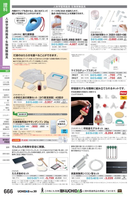 内側のランプを点けると、目に光が入って瞳孔が収縮することがわかります。ケース内に氷水・お湯を入れて、温点・冷点があることを実験できます。人体学習用器具・生物実験器具自分の目の瞳孔を観察できます。[上野科学社]瞳孔観察器お申込番号M価税抜税抜価格税込価格単位8-615-0578オープン¥10,165¥11,1811個商品種別型式/UE-15●寸法/150幅)×60(奥)×70(高)mm●質量/350g●材質/硬質樹脂●付属品/テスト用電池(単三乾電池×2個)●包装数:1※納期がかかる場合があります。使用例※実験の際は先端を目などに当てないように十分注意してください。また使用後は保護キャップを取り付けてください。[ウチダテクノ]皮膚の温点・冷点探し実験器(熱導子)6個組お申込番号M価税抜税抜価格税込価格8-615-2820¥4,850¥4,607¥5,067単位1セット(6個組)商品種別型式/R5024●収納ケース付●包装数:1だ液のはたらきを調べることができます。※製造工程上気泡が入る場合があります。×36×36使用例×12[ウチダテクノ]だ液の働き実験セット36回分(6回分×6組)お申込番号M価税抜税抜価格税込価格8-615-4306¥2,800¥2,660¥2,926単位1セット(36回分入)商品種別型式/R-5036●包装数:1〈セット内容〉マイクロチューブ1.5mL:12個×6、個装綿棒:6本×6、プラスチックスポイト:2本×6、可溶性でんぷん:10g、でんぷん用スプーン:1本※ヨウ素液は別途ご用意ください。●ヨウ素溶液とデンプンを使っただ液のはたらきを調べる実験が簡単に行えます。●水やだ液に溶けやすいデンプンを使用しています。※セット内の代用デンプンは、ベネジクト液の実験には使用できません。中学校での実験には不向きです。×8×8×10×4[ウチダテクノ]小学校だ液の実験セット(ヨウ素溶液版)40回分商品種別型式/R5038お申込番号M価税抜8-615-4499¥4,300税抜価格¥3,957税込価格¥4,352単位1セット(40回分入)マイクロチューブスタンド3本立て使用例8本立て商品種別お申込番号税抜価格単位型式/S53953本立て8本立て●寸法/3本立て:80(幅)×50(奥)×50(高)mm、8本立て:105(幅)×50(奥)×50(高)mm●1.5mLマイクロチューブ用●包装数:18-615-46818-615-4682¥700¥750型式/S5396¥8001台税込価格¥770¥825M価税抜¥750呼吸器モデルを簡単に組み立てられるキットです。呼吸器運動を視覚的に理解することができます。×9×3×63組入●小学校6年生向け●包装数:1〈セット内容〉代用デンプン入りチャック付ポリ袋×80袋、綿棒×80本、ストロー×40本、ヨウ素溶液ボトル×10本、ケース詰め替え用だ液実験用溶けやすいデンプン20g×3×3×3×6×6×1理科人体学習用器具・生物実験器具学習支援用品理科ビーカー・ビーカー・容器類容器類スタンド類・加熱器具加熱器安全配慮安全配温度計・温度計計量・計測鏡・鏡・レンズ・レンズ・磁石磁石電気・電気・パーツ類パーツ類エネルギーエネルギーろ紙・ろ紙・試験紙・試験紙環境測定環境測薬品・薬品・実験材料実験材実験キット・おもしろ実験し理科教材・実験器飼育・栽培飼育・栽培収納・管理[ウチダテクノ]だ液実験用溶けやすいデンプン20gお申込番号8-615-3494M価税抜¥950商品種別型式/R5030税抜価格¥900税込価格¥990単位1本●容量/20g●成分/代用デンプン●包装数:1※湿気を避け、冷暗所に保存してください。※だ液実験用溶けやすいデンプンには、若干の糖類が含まれるためベネジクト液に反応します。中学校での実験には不向きです。容量20gLOOKP.158中学校の実験で使える実験用デンプンを掲載しております。観察観察でんぷんの有無を安全に実験。光合成によって葉にできたでんぷんを、たたき染めの方法でろ紙に写し取り、ヨウ素でんぷん反応ででんぷんの有無を確認します。従来の熱アルコール法よりも、簡単に安全に実験ができます。小学校実験向き。使用例組立時×3[ウチダテクノ]呼吸器モデルキット3組入商品種別型式/R4269お申込番号8-619-4106M価税抜¥8,700税抜価格¥8,264税込価格¥9,090単位1セット(3組入)●包装数:1〈セット内容〉ペットボトル(底面くり抜き加工済)×3本、穴あきゴム栓×9個、ストレート管×3本、Y管×3本、風船×6個、球形つまみ(樹脂球、取り付けビス、ポリワッシャー(裏表用))×3式、ゴムシート×6枚、両面テープ×1個、収納ケース植物の葉の茎に合った内径のシリコン管をつなぎワセリンを塗った葉と塗っていない葉の蒸散を比べてみよう。[ウチダ]たたき染めセット商品種別型式/PT-4お申込番号M価税抜8-615-0571¥6,100使用例ろ紙葉税抜価格¥5,759税込価格¥6,334単位1セット蒸散実験用シリコン管セット商品種別型式/S-3439お申込番号M価税抜8-615-4616¥3,500使用例税抜価格¥3,228税込価格¥3,550単位1組(5セット)●寸法/ベース板:195幅)×120奥)×5厚)mm、上面板:180(幅)×110奥)×3(厚)mm●材質/ベース板:アクリル、上面板:ビニール●一辺固定式●包装数:1〈セット内容〉ベース板、上面板、防音ゴム板(厚さ2mm)×1枚、丸型ろ紙(直径125mm)×10枚、木槌×1個●1組(5セット)●包装数:1〈セット内容〉シリコン管(内径×外径)4×6mm/約3cm、2×4mm/約3cm、1×2mm/約30cm、注射器×1本666Vol.20この他にも別冊に理科関連用品を掲載しております。