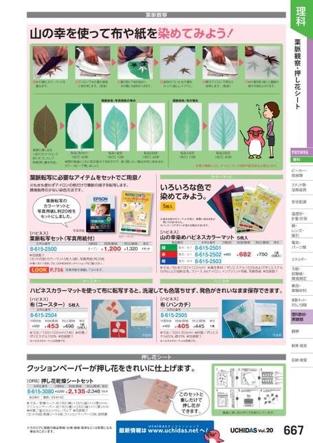 理科葉脈観察・押し花シート学習支援用品理科ビーカー・ビーカー・容器類器スタンド類・加熱器具熱安全配慮全温度計・度・計量・計測鏡・鏡・レンズ・レンズ・磁石石電気・電気・パーツ類パーツ類エネルギーエネルギーろ紙・ろ紙・試験紙・験・環境測定境薬品・薬品・実験材料験実験キット・おもしろ実験理科教材・実験器観察察飼育・栽培飼育・栽培収納・管理山の幸を使って布や紙を染めてみよう!葉脈観察●木の葉にカラーマットを重ねます。❷アイロンで木の葉の表面に色を写します。(防染)●葉の形に下地が染まり、木の葉にも染料がつきます。●染料のついた木の葉をひっくり返しレイアウト。●再びアイロンで押さえ染色します。(転染)●木の葉を取り除くと葉脈の様子が染め上がります。葉脈染色:写真用紙の場合葉脈染色:布の場合実際の葉っぱを180℃のアイロンで約1分プレスして即席押し葉を作成。防染(色付け)180℃40秒転染1回目180℃10秒転染2回目180℃40秒時間の経過とともに色が褪せてきますので、長く残したい場合は布に染めるか、カラーコピーで残しましょう。葉脈転写に必要なアイテムをセットでご用意!火も水も使わずアイロンの熱だけで葉脈の様子を転写します。環境負荷の少ない染色方法です。葉脈転写のカラーマットと写真用紙L判20枚をセットにしました。[ハピネス]葉脈転写セット(写真用紙付)写真用紙お申込番号8-615-2500カラーマット税抜価格¥1,200税込価格¥1,320単位1セットM価税抜オープン●包装数:1〈セット内容〉カラーマット5枚入(緑)、写真用紙L判20枚※使い方につきましては、UCHIDASオンラインショップをご覧ください。UCHIDASvol.20P.756写真用紙を掲載しております。P.756写真用紙を掲載しております。転染1回目180℃10秒転染2回目180℃40秒※葉の種類により、アイロンプレス時間や転写具合は異なります。カラーマットいろいろな色で染めてみよう。5枚入※染める前のカラーマットの色と、実際に染まる色は同じではありません。※パッケージデザインが変わる場合があります。[ハピネス]山の幸染めハピネスカラーマット5枚入商品種別お申込番号M価税抜税抜価格税込価格単位型式/A-1型式/B-1緑赤紺●寸法/B6判(182×123mm)●適合素材/ポリエステル100%およびポリエステル50%以上の混紡生地、フリース、66ナイロン、インクジェット用紙、写真用紙●包装数:18-615-25018-615-25028-615-2503¥682¥750(5枚入)型式/B-3¥8001袋コースターハンカチハピネスカラーマットを使って布に転写すると、洗濯しても色落ちせず、発色がきれいなまま保存できます。[ハピネス]布(コースター)5枚入お申込番号8-615-2504[ハピネス]布(ハンカチ)お申込番号8-615-2505M価税抜¥500税抜価格¥453税込価格¥498(5枚入)●寸法/100×100mm(1枚)●材質/ポリエステル100%●包装数:1※ハピネスカラーマットは別売です。単位1袋M価税抜¥450税抜価格¥405税込価格¥445単位1枚●寸法/350×350mm●材質/ポリエステル65%、綿35%●包装数:1※ハピネスカラーマットは別売です。作品例押し花シート作品例クッションペーパーが押し花をきれいに仕上げます。[ORS]押し花乾燥シートセットお申込番号M価税抜税抜価格税込価格単位8-615-3080¥2,200¥2,135¥2,3481セット商品種別型式/03-6142●寸法/乾燥シート:約180(横)×265(縦)×1(厚)mm、クッションペーパー:約180(横)×260(縦)×1(厚)mm●材質/塩化カルシウム、パルプ●包装数:1〈セット内容〉乾燥シート6枚、クッションペーパー10枚、説明書※カタログに掲載の商品情報(仕様・価格・税率など)は変更になる場合がございます。最新情報はこのセットと重しだけで押し花ができます。裏面に押し花の作り方を紹介しています。UCHIDASww.uchidas.netwへ!Vol.20667
