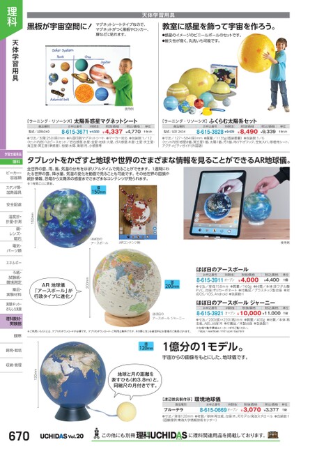 黒板が宇宙空間に!マグネットシートタイプなので、マグネットがつく黒板やロッカー、扉などに貼れます。教室に惑星を飾って宇宙を作ろう。●惑星のイメージのビニールボールのセットです。●耐久性が高く、丸洗いも可能です。天体学習用具使用例[ラーニング・リソーシズ]太陽系惑星マグネットシート[ラーニング・リソーシズ]ふくらむ太陽系セット商品種別型式/LER6040お申込番号M価税抜8-615-3671¥4,568税抜価格¥4,337税込価格¥4,770単位1セット商品種別型式/LER2434お申込番号M価税抜8-615-3828¥9,429税抜価格¥8,490税込価格¥9,339単位1セット●寸法/太陽:250径)mm●片面印刷マグネットシート●マーカー対応●包装数:1/12〈セット内容〉12ピースセット/岩石惑星:水星・金星・地球・火星、ガス惑星:木星・土星・天王星・海王星・冥王星(準惑星)、恒星:太陽、衛星:月、小惑星帯●寸法/127〜584径)mm●質量/1135g(個装重量)●包装数:1/6〈セット内容〉惑星8個、冥王星1個、太陽1個、月1個、吊り下げフック、空気入れ、修理用シート、アクティビティガイド(外国語)タブレットをかざすと地球や世界のさまざまな情報を見ることができるAR地球儀。全世界の雲、雨、風、気温の分布をほぼリアルタイムで見ることができます。1週間にわたる世界の雲、降水量、気温の変化を動画で見ることも可能です。その他世界の国旗や統計情報、恐竜から太陽系の惑星までさまざまなコンテンツが見られます。※1時間ごとに更新。径150mm[渡辺教具製作所]環境地球儀商品種別お申込番号M価税抜税抜価格ブルーテラ●寸法/球径120mm●材質/球体:再生紙、台座:木、月モデル:発泡スチロール●包装数:1〈画像提供:東海大学情報技術センター〉8-615-0669オープン¥3,070税込価格¥3,377単位1台使用例税込価格¥4,400単位1個ほぼ日のアースボールお申込番号M価税抜8-615-3911オープン税抜価格¥4,000●寸法/球径150mm●質量/160g●材質/本体:非フタル酸PVC、台座:ポリカーボネート●付属品/プラスチック製台座●対応OS/iOS、Android●包装数:1ほぼ日のアースボールジャーニーお申込番号M価税抜税抜価格8-615-3921オープン¥10,000¥11,000税込価格単位1台●寸法/200(径)×230高)mm●質量/400g●材質/本体:再生紙、ABS、台座:木●付属品/木製台座●包装数:1※仕様や動作環境はメーカーHPをご覧ください。https://earthball.1101.com/top.html径200mmほぼ日のアースボールジャーニー200mmAR地球儀「アースボール」が行政タイプに進化!※ご利用いただくには、アプリのダウンロードが必要です。アプリのダウンロード・ご利用は無料ですが、その際に生じる通信料はお客様のご負担となります。ほぼ日のアースボールARコンテンツ例150mm径120mm1億分の1モデル。宇宙からの画像をもとにした、地球儀です。地球と月の距離を表すひも(約3.8m)と、同縮尺の月付きです。120mm理科天体学習用具学習支援用品理科ビーカー・ビーカー・容器類容器類スタンド類・加熱器具加熱器安全配慮安全配温度計・温度計計量・計測鏡・鏡・レンズ・レンズ・磁石磁石電気・電気・パーツ類パーツ類エネルギーエネルギーろ紙・ろ紙・試験紙・試験紙環境測定環境測薬品・薬品・実験材料実験材実験キット・おもしろ実験し理科教材・実験器観察観察飼育・栽培飼育・栽培収納・管理670Vol.20この他にも別冊に理科関連用品を掲載しております。