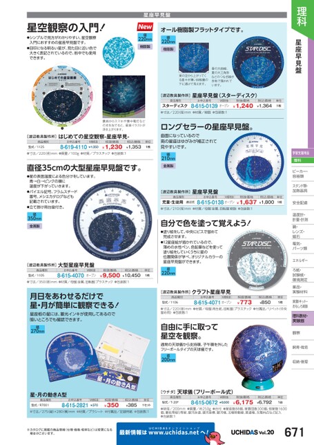 理科星座早見盤学習支援用品理科ビーカー・ビーカー・容器類器スタンド類・加熱器具熱安全配慮全温度計・度・計量・計測鏡・鏡・レンズ・レンズ・磁石石電気・電気・パーツ類パーツ類エネルギーエネルギーろ紙・ろ紙・試験紙・験・環境測定境薬品・薬品・実験材料験実験キット・おもしろ実験理科教材・実験器観察察飼育・栽培飼育・栽培収納・管理●寸法/350(径)mm●材質/母盤:金属、回転盤:プラスチック●包装数:1月日をあわせるだけで星・月が簡単に観察できる!星座板の星には、蓄光インキが使用してあるので暗いところでも確認できます。径270mm星・月の動きA型商品種別型式/R7001お申込番号8-615-2821M価税抜¥370税抜価格¥350税込価格¥385単位1セット●寸法/275(縦)×280(横)mm●材質/プラシート●付属品/記録用紙●包装数:1[渡辺教具製作所]クラフト星座早見商品種別型式/1106お申込番号M価税抜8-615-4071オープン税抜価格¥773税込価格¥850単位1枚●寸法/220(径)mm●材質/母盤:再生紙、回転盤:プラスチック●付属品/リベット(中央留め用)●包装数:1自由に手に取って星空を観察。通常の天球儀から支持環、子午環を外したフリーボールタイプの天球儀です。径200mm[ウチダ]天球儀(フリーボール式)商品種別型式/T-20Fお申込番号8-615-0672M価税抜¥6,500税抜価格¥6,175税込価格¥6,792単位1台●球径/200mm●質量/約250g●台付●星座数88個、星雲団数300個、恒星数1600個、最低等級5等星、銀河赤道、銀河座標、銀河極、北極移動線、黄道極、太陽向点など記入●包装数:1※カタログに掲載の商品情報(仕様・価格・税率など)は変更になる場合がございます。最新情報はUCHIDASww.uchidas.netwへ!Vol.20671星空観察の入門!●シンプルで見方がわかりやすい、星空観察入門におすすめの星座早見盤です。●目印になる明るい星が、見た目に近い色で大きく表記されているので、街中でも使用できます。星座早見盤径220mm樹脂製オール樹脂製フラットタイプです。径220mm樹脂製東の空から上がってくる星々が薄い回転盤の下に透けて見えます。春の大曲線、夏の大三角形などのつなぎ線が赤色で描かれています。裏面からスマホや懐中電灯などの光を当てると、星座イラストが浮き上がります。[渡辺教具製作所]はじめての星空観察-星座早見-商品種別型式/1125お申込番号8-619-4110M価税抜¥1,350税抜価格¥1,230税込価格¥1,353単位1枚●寸法/220(径)mm●質量/100g●材質/プラスチック●包装数:1直径35cmの大型星座早見盤です。●星の表面温度による色分けをしています。青→白→ピンクの順に温度が下がっていきます。●バイエル記号、フラムスチード番号、メシエカタログなども記載されています。●立て掛け用台座付き。径350mm金属製[渡辺教具製作所]大型星座早見盤商品種別型式/1105お申込番号8-615-4070M価税抜オープン税抜価格¥9,500税込価格¥10,450単位1枚径220mm[渡辺教具製作所]星座早見盤(スターディスク)商品種別お申込番号M価税抜スターディスク●寸法/220(径)mm●材質/樹脂●包装数:18-615-0139オープン税抜価格¥1,240税込価格¥1,364単位1枚ロングセラーの星座早見盤。曲面になっているので南の星座はゆがみが補正されて見やすいです。径210mm金属製[渡辺教具製作所]星座早見盤商品種別お申込番号M価税抜税抜価格児童・生徒用●寸法/210(径)mm●材質/母盤:金属、回転盤:樹脂●包装数:18-615-0138オープン¥1,637渡辺式税込価格¥1,800単位1枚自分で色を塗って覚えよう!●塗り絵をして、中央にビスで留めて完成させます。●12星座絵が描かれているので、薄めの水性ペン、色鉛筆などを使って塗り絵をしていくうちに星の位置関係が学べ、オリジナルカラーの星座早見盤ができます。