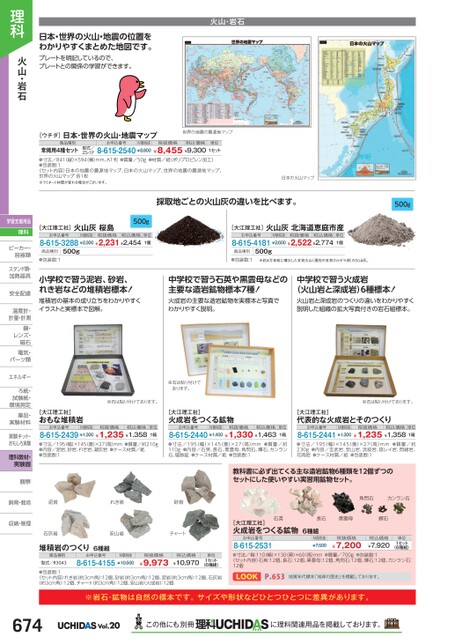 火山・岩石日本・世界の火山・地震の位置をわかりやすくまとめた地図です。プレートを明記しているので、プレートとの関係の学習ができます。[ウチダ]日本・世界の火山・地震マップ世界の地震の震源地マップ商品種別お申込番号M価税抜税抜価格税込価格単位型式/ZS-1P8-615-2540¥8,900¥8,455¥9,3001セット常掲用4種セット●寸法/841(縦)×594(横)mm、A1判●質量/50g●材質/紙(ポリプロピレン加工)●包装数:1〈セット内容〉日本の地震の震源地マップ、日本の火山マップ、世界の地震の震源地マップ、世界の火山マップ各1枚※ラミネート材質が変わる場合がございます。日本の火山マップ採取地ごとの火山灰の違いを比べます。500g[大江理工社]火山灰桜島お申込番号M価税抜税抜価格税込価格8-615-3288¥2,300¥2,231¥2,454単位1個500g500g商品種別●包装数:1[大江理工社]火山灰北海道恵庭市産お申込番号M価税抜税抜価格税込価格8-615-4181¥2,600¥2,522¥2,774単位1個500g商品種別●包装数:1※約4万年前に噴火した支笏火山(現在の支笏カルデラ湖)の火山灰。小学校で習う泥岩、砂岩、れき岩などの堆積岩標本!堆積岩の基本の成り立ちをわかりやすくイラストと実標本で図解。中学校で習う石英や黒雲母などの主要な造岩鉱物標本7種!火成岩の主要な造岩鉱物を実標本と写真でわかりやすく説明。中学校で習う火成岩(火山岩と深成岩)6種標本!火山岩と深成岩のつくりの違いをわかりやすく説明した組織の拡大写真付きの岩石組標本。※石は貼り付けてあります。※石は貼り付けてあります。※石は貼り付けてあります。[大江理工社]おもな堆積岩お申込番号M価税抜税抜価格税込価格8-615-2439¥1,300¥1,235¥1,358[大江理工社]火成岩をつくる鉱物お申込番号M価税抜税抜価格税込価格8-615-2440¥1,400¥1,330¥1,463単位1箱単位1箱[大江理工社]代表的な火成岩とそのつくりお申込番号M価税抜税抜価格税込価格単位8-615-2441¥1,300¥1,235¥1,3581箱●寸法/195(幅)×145(奥)×27高)mm●質量/約210g●内容/泥岩、砂岩、れき岩、凝灰岩●ケース材質/紙●包装数:1●寸法/195(幅)×145(奥)×27(高)mm●質量/約110g●内容/石英、長石、黒雲母、角閃石、輝石、カンラン石、磁鉄鉱●ケース材質/紙●包装数:1●寸法/195(幅)×145(奥)×27(高)mm●質量/約230g●内容/玄武岩、安山岩、流紋岩、斑レイ岩、閃緑岩、花崗岩●ケース材質/紙●包装数:1理科火山・岩石学習支援用品理科ビーカー・ビーカー・容器類容器類スタンド類・加熱器具加熱器安全配慮安全配温度計・温度計計量・計測鏡・鏡・レンズ・レンズ・磁石磁石電気・電気・パーツ類パーツ類エネルギーエネルギーろ紙・ろ紙・試験紙・試験紙環境測定環境測薬品・薬品・実験材料実験材実験キット・おもしろ実験し理科教材・実験器観察観察飼育・栽培飼育・栽培泥岩れき岩砂岩収納・管理石灰岩安山岩チャート堆積岩のつくり6種組商品種別型式/R3043お申込番号M価税抜8-615-4155¥10,500税抜価格¥9,973税込価格¥10,970単位1セット(6種組)●包装数:1〈セット内容〉れき岩(約3cm角)12個、砂岩(約3cm角)12個、泥岩(約3cm角)12個、石灰岩(約3cm角):12個、チャート(約3cm角)12個、安山岩(火成岩)12個教科書に必ず出てくる主な造岩鉱物6種類を12個ずつのセットにした使いやすい実習用鉱物セット。角閃石カンラン石石英[大江理工社]火成岩をつくる鉱物6種組お申込番号8-615-2531長石M価税抜¥7,500黒雲母輝石税抜価格¥7,200税込価格¥7,920単位1セット(6種組)●寸法/箱:110(幅)×130(奥)×60(高)mm●質量/700g●包装数:1〈セット内容〉石英:12個、長石:12個、黒雲母:12個、角閃石:12個、輝石:12個、カンラン石:12個LOOKP.177地質年代標本「地球の歴史」を掲載しております。※岩石・鉱物は自然の標本です。サイズや形状などひとつひとつに差異があります。674Vol.20この他にも別冊に理科関連用品を掲載しております。