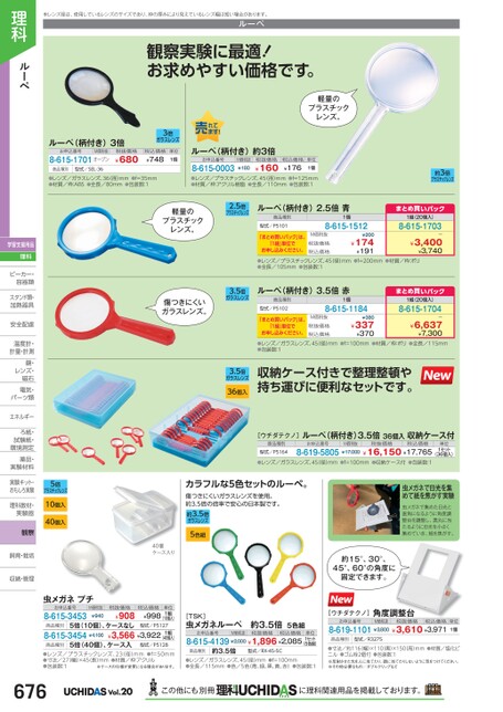 ※レンズ径は、使用しているレンズのサイズであり、枠の厚みにより見えているレンズ幅は短い場合があります。ルーペ観察実験に最適!お求めやすい価格です。3倍ガラスレンズ税込価格¥748単位1個ルーペ(柄付き)約3倍お申込番号8-615-0003M価税抜¥180税抜価格¥160軽量のプラスチックレンズ。税込価格¥176単位1個ルーペ(柄付き)3倍お申込番号M価税抜8-615-1701オープン税抜価格¥680商品種別型式/SEL-36●レンズ/ガラスレンズ、36(径)mm●f=35mm●材質/枠:ABS●全長/80mm●包装数:1●レンズ/プラスチックレンズ、45径)mm●f=125mm●材質/枠:アクリル樹脂●全長/110mm●包装数:1ルーペ(柄付き)2.5倍青商品種別型式/P5101「まとめ買いパック」は、「1組」単位でお申し込みください。M価税抜税抜価格税込価格1個8-615-1512¥200¥174¥1912.5倍プラスチックレンズ軽量のプラスチックレンズ。3.5倍ガラスレンズ傷つきにくいガラスレンズ。約3倍プラスチックレンズまとめ買いパック1組(20個入)8-615-1703ー¥3,400¥3,740●レンズ/プラスチックレンズ、45(径)mm●f=200mm●材質/枠:ポリ●全長/105mm●包装数:1ルーペ(柄付き)3.5倍赤商品種別型式/P5102「まとめ買いパック」は、「1組」単位でお申し込みください。M価税抜税抜価格税込価格1個8-615-1184¥380¥337¥370まとめ買いパック1組(20個入)8-615-1704ー¥6,637¥7,300●レンズ/ガラスレンズ、45(径)mm●f=100mm●材質/枠:ポリ●全長/115mm●包装数:13.5倍ガラスレンズ36個入収納ケース付きで整理整頓や持ち運びに便利なセットです。[ウチダテクノ]商品種別型式/P5164ルーペ(柄付き)3.5倍36個入収納ケース付お申込番号8-619-5805¥17,000¥16,150¥17,765M価税抜税抜価格税込価格単位1セット(36個入)●レンズ/ガラスレンズ、45(径)mm●f=100mm●収納ケース付●包装数:15倍プラスチックレンズ10個入40個入カラフルな5色セットのルーペ。傷つきにくいガラスレンズを使用。約3.5倍の倍率で安心の日本製です。約3.5倍ガラスレンズ5色組40個ケース入り虫メガネで日光を集めて紙を焦がす実験虫メガネで集めた日光と直角になるように角度調整台を調整し、黒丸に当たるように日光を小さく集めていき、紙を焦がす。約15°、30°、45°、60°の角度に固定できます。虫メガネプチお申込番号M価税抜¥9408-615-3453¥9085倍(10個)、ケースなし商品種別税抜価格税込価格¥998単位1組(10個入)型式/P51278-615-3454¥4,100¥3,566¥3,9221組(40個入)商品種別5倍(40個)、ケース入型式/P5128●レンズ/プラスチックレンズ、23(径)mm●f=50mm●寸法/27(幅)×45(長)mm●材質/枠:アクリル●包装数:1※ケースの仕様が変更になる場合があります。[TSK]虫メガネルーペ約3.5倍5色組お申込番号M価税抜税抜価格税込価格単位8-615-4139¥2,000¥1,896¥2,0851セット(5色組)商品種別約3.5倍型式/RX-45-5C●レンズ/ガラスレンズ、45(径)mm●f=100mm●全長/115mm●色/5色(青、緑、黒、黄、赤)●包装数:1[ウチダテクノ]角度調整台お申込番号8-619-1101¥3,800¥3,610¥3,971M価税抜税抜価格税込価格単位1個商品種別型式/R3275●寸法/約116(幅)×110奥)×150(高)mm●材質/塩化ビニル●ゴム栓2個付●包装数:1※反射させた光を人に当てたり、顔に当てたりしないように気をつけてください。※その他必要なもの/ダブルクリップなど676Vol.20この他にも別冊に理科関連用品を掲載しております。理科ルーペ学習支援用品理科ビーカー・ビーカー・容器類容器類スタンド類・加熱器具加熱器安全配慮安全配温度計・温度計計量・計測鏡・鏡・レンズ・レンズ・磁石磁石電気・電気・パーツ類パーツ類エネルギーエネルギーろ紙・ろ紙・試験紙・試験紙環境測定環境測薬品・薬品・実験材料実験材実験キット・おもしろ実験し理科教材・実験器実験器観察飼育・栽培飼育・栽培収納・管理