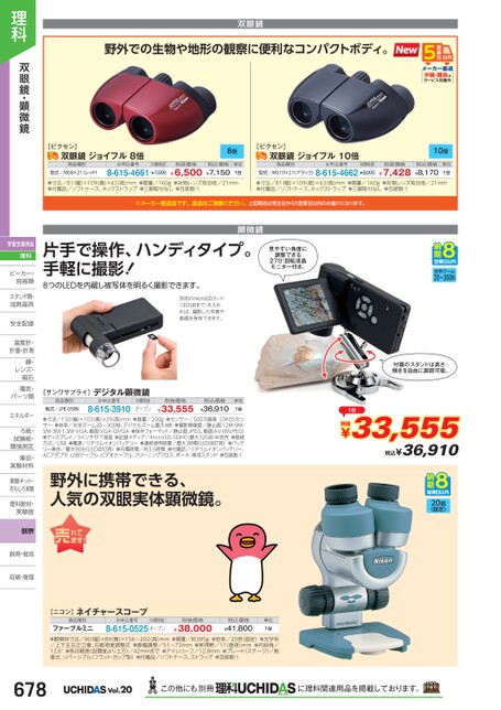 双眼鏡野外での生物や地形の観察に便利なコンパクトボディ。沖縄・離島はサービス対象外10倍税抜価格¥7,428税込価格¥8,170単位1台8倍税抜価格¥6,500税込価格¥7,150単位1台[ビクセン]双眼鏡ジョイフル10倍商品種別お申込番号M価税抜型式/MS10×21(ブラック)8-615-4662¥8,000[ビクセン]双眼鏡ジョイフル8倍商品種別型式/MS8×21(レッド)お申込番号M価税抜8-615-4661¥7,000●寸法/81(幅)×109(奥)×43(高)mm●質量/160g●対物レンズ有効径/21mm●付属品/ソフトケース、ネックストラップ●三脚取付なし●包装数:1●寸法/81(幅)×109(奥)×43(高)mm●質量/160g●対物レンズ有効径/21mm●付属品/ソフトケース、ネックストラップ●三脚取付なし●包装数:1※メーカー直送品です。返品はご容赦ください。上記商品は受注日から5営業日以内のお届けになります。顕微鏡片手で操作、ハンディタイプ。手軽に撮影!8つのLEDを内蔵し被写体を明るく撮影できます。別売のmicroSDカード(32GBまで)を入れれば、撮影した写真や動画を保存できます。見やすい角度に調整できる270°回転液晶モニター付き。光学ズーム20〜300倍付属のスタンドは高さ・傾きを自由に調節可能。[サンワサプライ]デジタル顕微鏡商品種別型式/LPE-05BKお申込番号8-615-3910M価税抜オープン税抜価格¥33,555税込価格¥36,910単位1台●寸法/130(幅)×103(奥)×29(高)mm●質量/200g●センサー/500万画素CMOSセンサー●倍率/光学ズーム20〜300倍、デジタルズーム最大4倍●撮影解像度/静止画:12M・9M・5M・3M・1.3M・VGA、動画:VGA・QVGA●保存フォーマット/静止画:JPEG、動画:AVI(MJPEG)●ディスプレイ/3インチTFT液晶●記録メディア/microSD、SDHC(最大32GB)※別売●接続方式/USB●電源/リチウムイオンバッテリー●連続使用時間/最大3時間(LED消灯時)●バッテリー寿命/最大90分(LED点灯時)●充電時間/約3.5時間●付属品/リチウムイオンバッテリー、ACアダプタ、USBケーブル、ビデオケーブル、クリーニングクロス、ポーチ、専用スタンド●包装数:1野外に携帯できる、人気の双眼実体顕微鏡。1台税抜¥33,555税込¥36,91020倍(固定)理科双眼鏡・顕微鏡学習支援用品理科ビーカー・ビーカー・容器類容器類スタンド類・加熱器具加熱器安全配慮安全配温度計・温度計計量・計測鏡・鏡・レンズ・レンズ・磁石磁石電気・電気・パーツ類パーツ類エネルギーエネルギーろ紙・ろ紙・試験紙・試験紙環境測定環境測薬品・薬品・実験材料実験材実験キット・おもしろ実験し理科教材・実験器実験器観察飼育・栽培飼育・栽培収納・管理[ニコン]ネイチャースコープ商品種別お申込番号M価税抜税抜価格税込価格8-615-0525オープンファーブルミニ●観察時寸法/90(幅)×89(奥)×156〜202高)mm●質量/約395g●倍率/20倍(固定)●光学系/上下左右正立像、右眼視度調整式●眼幅調整/51〜72mm●実視野/11直径)mm●内斜角/12.6°●焦点範囲(設置面より上方)/42mmまで●アイレリーフ/12.8mm●プレート(ステージ)/脱着式、リバーシブル(フラット・カップ型)●付属品/ソフトケース、ストラップ●包装数:1¥38,000¥41,800単位1台678Vol.20この他にも別冊に理科関連用品を掲載しております。