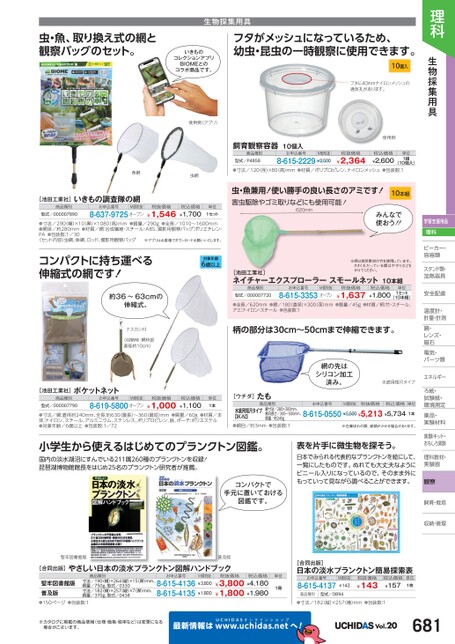 理科生物採集用具学習支援用品理科ビーカー・ビーカー・容器類器スタンド類・加熱器具熱安全配慮全温度計・度・計量・計測鏡・鏡・レンズ・レンズ・磁石石電気・電気・パーツ類パーツ類エネルギーエネルギーろ紙・ろ紙・試験紙・験・環境測定境薬品・薬品・実験材料験実験キット・おもしろ実験理科教材・教実験器実験器観察飼育・栽培飼育・栽培収納・管理生物採集用具虫・魚、取り換え式の網と観察バッグのセット。いきものコレクションアプリBIOMEとのコラボ商品です。使用例(アプリ)フタがメッシュになっているため、幼虫・昆虫の一時観察に使用できます。10個入フタに40mmナイロンメッシュの通気孔があります。使用例税抜価格¥2,364税込価格¥2,600単位1組(10個入)飼育観察容器10個入商品種別型式/P4858お申込番号M価税抜8-615-2229¥2,500魚網虫網●寸法/120(径)×80(高)mm●材質/ポリプロピレン、ナイロンメッシュ●包装数:1いきもの調査隊の網[池田工業社]商品種別型式/000007890お申込番号M価税抜8-637-9725オープン税抜価格¥1,546税込価格¥1,700単位1セット●寸法/290幅)×10(奥)×1080(高)mm●質量/290g●全長/1010〜1600mm●網径/約280mm●材質/網:合成繊維・スチール・ABS、撮影用観察バッグ:ポリエチレン・PA●包装数:1/30〈セット内容)虫網、魚網、ロッド、撮影用観察バッグ※アプリはお客様でダウンロードお願いいたします。虫・魚兼用!使い勝手の良い長さのアミです!害虫駆除やゴミ取りなどにも使用可能!10本組620mmみんなで使おう!!コンパクトに持ち運べる伸縮式の網です!対象年齢6歳以上約36〜63cmの伸縮式。ナスカン付(収納時:網枠部直径約10cm)※柄は自然素材の竹を使用しています。ささくれだっている際はやすりなどをかけてください。[池田工業社]ネイチャーエクスプローラースモールネット10本組商品種別型式/000007720お申込番号M価税抜8-615-3353オープン税抜価格¥1,637税込価格¥1,800(10本組)●全長/620mm●網/180(直径)×300(深)mm●質量/45g●材質/柄:竹・スチール、アミ:ナイロン・スチール●包装数:1単位1セット柄の部分は30cm〜50cmまで伸縮できます。[池田工業社]ポケットネット商品種別型式/000007790お申込番号M価税抜8-619-5800オープン税抜価格¥1,000税込価格¥1,100単位1本●寸法/網:直径約240mm、全長:約630最長)〜360(最短)mm●質量/60g●材質/本体:ナイロン、スチール、アルミニウム、ステンレス、ポリプロピレン、鉄、ポーチ:ポリエステル●対象年齢/6歳以上●包装数:1/72網の先はシリコン加工済み。水底用短尺タイプお申込番号M価税抜税抜価格税込価格単位8-615-0550¥5,500¥5,213¥5,7341本※在庫切れの際、納期がかかる場合があります。[ウチダ]たも商品種別水底用短尺タイプDK-N3●網目/約3mm●包装数:1網寸法/280×300mm、柄の長さ/300〜500mm、質量/約240g小学生から使えるはじめてのプランクトン図鑑。国内の淡水湖沼にすんでいる211属260種のプランクトンを収録!琵琶湖博物館館長をはじめ25名のプランクトン研究者が推薦。コンパクトで手元に置いておける図鑑です。表を片手に微生物を探そう。日本でみられる代表的なプランクトンを絵にして、一覧にしたものです。ぬれても大丈夫なようにビニール入りになっているので、そのまま外にもっていって見ながら調べることができます。堅牢図書館版普及版[合同出版]やさしい日本の淡水プランクトン図解ハンドブック堅牢図書館版普及版●150ページ●包装数:1商品種別お申込番号寸法/190(横)×264(縦)×15(厚)mm、質量/750g、型式/0330寸法/182(横)×257(縦)×7厚)mm、質量/370g、型式/04388-615-41368-615-4135M価税抜¥3,800¥1,800税抜価格税込価格¥3,800¥4,180¥1,800¥1,980単位1冊※カタログに掲載の商品情報(仕様・価格・税率など)は変更になる場合がございます。最新情報はUCHIDASww.uchidas.netw[合同出版]日本の淡水プランクトン簡易探索表お申込番号8-615-4137M価税抜¥143税抜価格¥143税込価格¥157単位1枚商品種別型式/0894●寸法/182縦)×257横)mm●包装数:1へ!Vol.20681