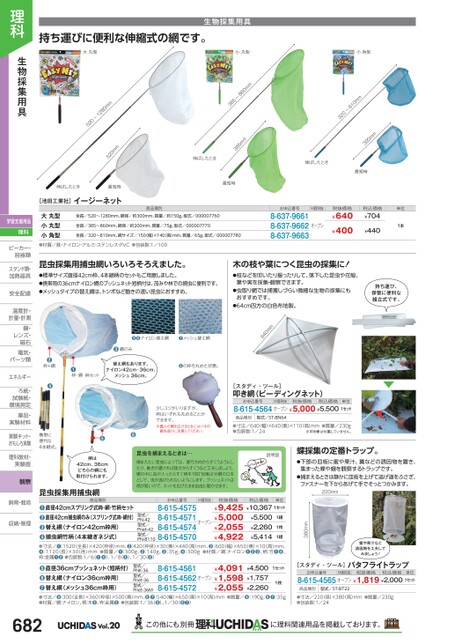 商品種別大丸型小丸型小角型●材質/鉄・ナイロン・アルミ・ステンレス・PVC●包装数:1/100全長/520〜1280mm、網径/約300mm、質量/約150g、型式/000007760全長/385〜860mm、網径/約200mm、質量/75g、型式/000007770全長/320〜810mm、網サイズ/150(幅)×140高)mm、質量/65g、型式/000007780お申込番号8-637-96618-637-96628-637-9663M価税抜オープン税抜価格¥640¥400税込価格¥704¥440単位1本昆虫採集用捕虫網いろいろそろえました。●標準サイズ直径42cm枠、4本継柄のセットもご用意しました。●携帯用の36cmナイロン網のブッシュネット短柄付は、茂みや林での捕虫に便利です。●メッシュタイプの替え網は、トンボなど動きの速い昆虫におすすめ。木の枝や葉につく昆虫の採集に!●枝などを叩いたり振ったりして、落下した昆虫や花殻、葉や実を採集・観察できます。●虫取り網では捕獲しづらい微細な生物の採集にもおすすめです。●64cm四方の白色布地製。持ち運び、保管に便利な組立式です。少しコツがいりますが、枠はいずれも丸めることができます。※畳んだ網を広げるときにはバネの跳ね返りに注意してください。[スタディ・ツール]叩き網(ビーディングネット)お申込番号M価税抜税抜価格税込価格単位8-615-4564オープン¥5,000¥5,5001セット商品種別型式/ST-BN64●寸法/640(幅)×640(奥)×110(高)mm●質量/230g●包装数:1/24※叩き棒は付属していません。昆虫を捕まえるときは…捕まえたい昆虫によっては、進行方向からすくうようにしたり、動きが遅ければ後方からすくうなど工夫しましょう。網の中に虫が入ったらすぐ柄を180°回転させ網の口をとじて、虫が逃げられないようにします。ブッシュネットは柄が短いので、ネットを広げたまま自由に動かせます。説明図蝶採集の定番トラップ。●下部の皿板に蜜や果汁、糞などの誘因物を置き、集まった蝶や蛾を観察するトラップです。●捕まえるときは静かに皿板を上げて逃げ道をふさぎ、ファスナーを下からあげて手でそっとつかみます。220mm携帯に便利な4本継式。●●柄は42cm、36cmどちらの網にも取付けられます。❸●ナイロン替え網❼メッシュ替え網●網のみ640mm替え網もあります。ナイロン42cm・36cm、メッシュ36cm。❺の枠を丸めた状態。・網・柄セット❶枠●枠+網●[スタディ・ツール]バタフライトラップお申込番号M価税抜税抜価格税込価格単位8-615-4565オープン¥1,819¥2,0001セット商品種別型式/ST-BT22蜜や果汁など誘因物を工夫してみましょう!380mmM価税抜オープンお申込番号8-615-45758-615-45718-615-45748-615-4570税抜価格税込価格単位¥9,425¥10,3671セット¥5,000¥2,055¥4,922¥5,500¥2,260¥5,4141組1枚1組直径42cmスプリング式枠・網・竹柄セット直径42cm捕虫網のみ(スプリング式枠・網付)型式/替え網(ナイロン42cm枠用)捕虫網竹柄(4本継ぎネジ式)PN-42型式/Pnet-42型式/PN-B110●●●●昆虫採集用捕虫網商品種別●寸法/●:1520(全長)×420(枠径)mm、●:420(枠径)×30(奥)×440高)mm、❸:600(幅)×650(奥)×10(高)mm、❹:1120(長)×30(径)mm●質量/❶:300g、❷:140g、❸:35g、❹:300g●材質/網:ナイロン●●❸、柄:竹●●、枠:金属●●●包装数:1/6(❶❹)、1/8(●)、1/30(❸)¥4,091¥1,598¥2,055¥4,500¥1,757¥2,2601セット1枚オープン8-615-45618-615-45628-615-4572直径36cmブッシュネット(短柄付)型式/替え網(ナイロン36cm枠用)替え網(メッシュ36cm枠用)PNK-36型式/Pnet-36型式/Pnet-36M●●●●寸法/●:300(全長)×360(枠径)×500奥)mm、❻❼:540(幅)×650(奥)×10(高)mm●質量/❺:190g、❻❼:35g●材質/網:ナイロン、柄:木●、枠:金属●●包装数:1/36(●)、1/30●●)●寸法/220径)×380高)mm●質量/230g●包装数:1/24682Vol.20この他にも別冊に理科関連用品を掲載しております。持ち運びに便利な伸縮式の網です。大丸型生物採集用具小丸型385〜860mm385mm小角型320〜810mm320mm最短時伸ばしたとき最短時伸ばしたとき520〜1280mm520mm伸ばしたとき最短時[池田工業社]イージーネット理科生物採集用具学習支援用品理科ビーカー・ビーカー・容器類容器類スタンド類・加熱器具加熱器安全配慮安全配温度計・温度計計量・計測鏡・鏡・レンズ・レンズ・磁石磁石電気・電気・パーツ類パーツ類エネルギーエネルギーろ紙・ろ紙・試験紙・試験紙環境測定環境測薬品・薬品・実験材料実験材実験キット・おもしろ実験し理科教材・実験器実験器観察飼育・栽培飼育・栽培収納・管理