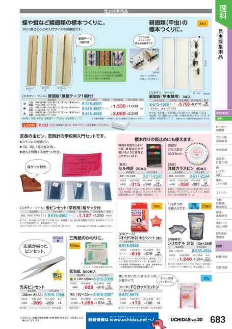 理科昆虫採集用品学習支援用品理科ビーカー・ビーカー・容器類器スタンド類・加熱器具熱安全配慮全温度計・度・計量・計測鏡・鏡・レンズ・レンズ・磁石石電気・電気・パーツ類パーツ類エネルギーエネルギーろ紙・ろ紙・試験紙・験・環境測定境薬品・薬品・実験材料験実験キット・おもしろ実験理科教材・教実験器実験器観察飼育・栽培飼育・栽培収納・管理●寸法/95(幅)×50(奥)×10高)mm●質量/8g●志賀昆蟲普及社製●有頭ステンレスピンの学校用セット●包装数:1/50〈セット内容〉1号、3号、5号ピン×各20本、指サック※針先は鋭いので取り扱いに注意してください。ステンレス製三角紙のかわりに。500枚入先端が尖ったピンセット。大※パッケージが変わる場合があります。薬包紙500枚入商品種別お申込番号大120×120mm8-615-2066M価税抜¥890税抜価格¥828税込価格¥910単位1包(500枚入)特大150×150mm8-615-2067先尖ピンセット商品種別お申込番号125mm尖(AA)8-615-1058M価税抜¥220税抜価格¥209税込価格¥229単位1本M価税抜¥1,500税抜価格税込価格¥1,395¥1,534単位1包(500枚入)●材質/ステンレス(SUS410)●包装数:1●包装数:1※カタログに掲載の商品情報(仕様・価格・税率など)は変更になる場合がございます。最新情報は[白元アース]ニオイがつかないわらべシート5枚入お申込番号8-618-0558税抜価格¥615税込価格¥676M価税抜オープン(5枚入)●寸法(1シート)/600×900mm●材質/フェノトリン製剤、防カビ剤(チモール)●包装数:1/5※有効期間:使用開始後約1年(温度、収納容器およ単位1袋び使用状態などで有効期間は変動します)。[内藤商店]シリカゲル分包10g×25袋商品種別型式/783032お申込番号8-636-4594M価税抜税抜価格税込価格オープン¥1,240¥1,364(25袋入)●寸法(1袋あたり)/7075mm●材質/シリカゲル(ケイ酸ゲル)●包装数:1/30単位1セット使いやすいカット済コットンの少量タイプ。[白十字]FCカットコットンチャック付パッケージ。お申込番号8-637-5679M価税抜¥190税抜価格¥173税込価格¥190単位1袋●寸法/40×40mm(1枚)●内容量/20g●包装数:120gUCHIDASww.uchidas.netwへ!Vol.20683昆虫採集用品蝶や蛾など鱗翅類の標本つくりに。30cm長さの小さめ入門サイズの展翅板です。鞘翅類(甲虫)の標本つくりに。3本入クワガタ虫、タマムシなど甲虫類展脚用です。使用例(虫ピン・まち針は付属しておりません)中大小小:シジミチョウや小型昆虫の展翅用。中:モンシロチョウや中型昆虫の展翅用。大:アゲハ蝶などの展翅用。展翅テープ1組付き。30cm30cm約7cm使用例[スタディ・ツール]展脚板(甲虫類用)3本入お申込番号M価税抜税抜価格税込価格8-615-4569オープン¥5,700¥6,270単位1組(3本入)1本商品種別型式/ST-TK04●寸法/69(幅)×300(長)×20(高)mm●質量/360g●材質/ポリ樹脂(6mm厚)、中敷き発泡スチロール材、木※製作ロットにより表面の白色度は変化がございます。(底板)●包装数:1/12約6cm小約7cm中約10cm大[スタディ・ツール]展翅板(展翅テープ1組付)商品種別寸法/本体:59幅)×300長)×32(高)mm、溝:約5mm、質量/100g、型式/ST-TS05寸法/本体:69幅)×300長)×32(高)mm、溝:約7mm、質量/120g、型式/ST-TS04寸法/本体:99幅)×300長)×32(高)mm、溝:約9mm、質量/160g、型式/ST-TS02小中大●材質/木製●平台●展翅テープ1組付●包装数:1/12お申込番号8-615-45668-615-45678-615-4568M価税抜税抜価格税込価格単位オープン¥1,530¥1,683¥2,000¥2,200※付属の展翅テープが無くなりましたら薄紙などで自作してください。LOOKP.286手作り展翅板に使える、発泡スチロール板を掲載しております。定番の虫ピン。志賀針の学校用入門セットです。●ステンレス有頭ピン。●1号、3号、5号の各20本。●指先を保護する指サック付き。指サック付き。標本作りの仮止めにも使えます。頭部は両面セルロイド製、裏面は文字が書けるように特殊加工されています。頭部がガラス玉の40本セット。[貝印]セル待針20本入商品種別型式/KM-3008お申込番号8-617-2533[貝印]洋裁ガラスピン40本入商品種別型式/KM-3009お申込番号8-617-2534[スタディ・ツール]虫ピンセット(学校用)指サック付商品種別型式/INSECTPINS135お申込番号M価税抜税抜価格税込価格8-615-4563オープン¥1,137¥1,250M価税抜¥350税抜価格¥315税込価格¥346(20本入)●長さ/全長:52mm、針長:42mm●質量/10g●材質/針:鉄(ニッケルメッキ仕上げ)、頭部:酢酸セルロース樹脂●包装数:1/12単位1袋M価税抜¥400税抜価格¥358税込価格¥393(40本入)●長さ/全長:約35mm、針長:約31mm●材質/針:ステンレススチール、頭部:ガラス球●包装数:1/12単位1袋単位1セット5枚入10gずつの小袋入りです。容量1袋10g25袋入