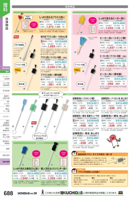 洗浄用品フラスコ洗いビーカー洗いPBT樹脂製。イラスト入りしっかり洗えるフラスコ洗い商品種別型式/S-7040❶M価税抜¥1,350お申込番号8-619-6400税抜価格税込価格¥1,273¥1,400単位1本※20ご使0mL以下のフラスコには用いただけません。●寸法/30〜90(毛径)×60(毛丈)×415(全長)mm●材質/PBT樹脂●包装数:1PBT樹脂製。フラスコの下部をしっかり洗えるブラシです。枝を洗える細管付き!●ナイロン毛製。10本入(●)●豚毛製。●枝付きフラスコ洗い100mL用商品種別❷型式/S7043お申込番号8-619-6406M価税抜税抜価格税込価格¥1,350¥1,283¥1,411単位1本●寸法/約6(毛径)×50(毛丈)×320(全長)mm、細管洗い:約3.5毛径)×15(毛丈)×120全長)mm量100mL用●包装数:1●材質/PBT樹脂●容フラスコ洗い(ナイロン毛製)10本入お申込番号8-615-2831商品種別型式/S4731❸M価税抜¥3,600税抜価格税込価格¥3,422¥3,764(10本入)●寸法/55(毛径)×115毛丈)×345(全長)mm●包装数:1単位1組フラスコ洗い(豚毛製)商品種別型式/S4727❹M価税抜¥400お申込番号8-615-2073税抜価格¥381税込価格¥419単位1本●寸法/55(毛径)×115毛丈)×345(全長)mm●包装数:1イラスト入りしっかり洗えるビーカー洗い商品種別型式/S7034❺M価税抜お申込番号8-615-4694税抜価格税込価格¥1,100¥1,042¥1,146単位1本●●寸法/85(毛径)×130(毛丈)×300(全長)mm●材質/毛材:PBT●包装数:1※スポンジの交換はできません。ビーカー洗い(スポンジ製)商品種別型式/S4734●M価税抜¥1,100お申込番号8-615-1238税抜価格税込価格¥1,037¥1,140単位1本●●寸法/75毛径)×80(毛丈)×210(全長)mm●包装数:1ビーカー洗い(ナイロン毛製)10本入商品種別型式/S4733❼M価税抜お申込番号8-615-2833税抜価格税込価格¥4,900¥4,653¥5,118(10本入)●寸法/75(毛径)×155(毛丈)×475(全長)mm●包装数:1単位1組ビーカー洗い(豚毛製)商品種別型式/S4728❽M価税抜¥620お申込番号8-615-2074税抜価格¥592税込価格¥651単位1本●寸法/75毛径)×155(毛丈)×475(全長)mm●包装数:1ナイロン毛製。10本入(●)●豚毛製。●糸でしばっているため、キズがつきにくい!❾●●⓬●※スポンジの交換はできません。ガラスとこすれる音が軽減!洗浄ブラシ試験管洗い試験管洗い(スポンジ製)試験管洗いナイロン毛糸しばり商品種別型式/S4736❾M価税抜¥390お申込番号8-615-0011税抜価格¥371税込価格¥408単位1本商品種別型式/S7031❿M価税抜¥360お申込番号8-615-4692税抜価格¥339税込価格¥372単位1本●寸法/25(毛径)×60毛丈)×240(全長)mm●材質/スポンジ製●包装数:1●寸法/40(毛径)×90毛丈)×280(全長)mm●材質/毛材:ナイロン毛●包装数:1試験管洗い豚毛保護チューブ付試験管洗い豚毛糸しばり商品種別⓫型式/S7042お申込番号8-619-6405M価税抜¥480税抜価格¥456税込価格¥501単位1本商品種別型式/S7032⓬M価税抜¥360お申込番号8-615-4690税抜価格¥339税込価格¥372単位1本●寸法/40(毛径)×90毛丈)×280(全長)mm●材質/毛材:豚毛●包装数:1●寸法/40(毛径)×90毛丈)×280(全長)mm●材質/毛材:豚毛●包装数:1試験管洗い馬毛糸しばり商品種別型式/S7033●M価税抜¥360お申込番号8-615-4691税抜価格¥339税込価格¥372単位1本●寸法/40(毛径)×90毛丈)×280(全長)mm●材質/毛材:馬毛●包装数:1イラスト入りイラスト入り器具洗浄ブラシサイズの見方・洗い方⓮●しっかり洗える集気びん洗い優しく洗えるメスシリンダー洗いお申込番号8-615-4693商品種別型式/S7036お申込番号8-615-4695商品種別型式/S7035●M価税抜¥1,100税抜価格税込価格¥1,042¥1,146単位1本税抜価格税込価格¥1,322¥1,454単位1本●寸法/60毛幅)×110毛丈)×300全長)mm●材質/毛材:ナイロン毛●包装数:1●寸法/70毛径)×140毛丈)×410全長)mm●材質/毛材:ポリプロピレン●包装数:1※50mL以下のメスシリンダーにはご使用いただけません●M価税抜¥1,400試験管やビーカーの洗浄は、水で内側を洗ってから外側を洗う。試験管は底を割らないように注意する。あらかじめブラシを試験管の底近くまで入れ、ブラシの柄を持つ位置を決めてから洗うと突き破りにくい。全長毛径毛丈ブラシの毛材による違いそれぞれの特徴は下記のとおりです。用途に合わせてお使いください。ナイロン毛耐久性に優れているが、強酸には弱い。※豚毛製ブラシの先端の毛を束ねた部分は馬毛です。豚毛ナイロン毛よりも対薬性に優れる。馬毛よりも毛腰が強い。馬毛ナイロン毛よりも対薬性に優れる。豚毛よりも柔軟性がある。688Vol.20この他にも別冊に理科関連用品を掲載しております。●理科洗浄用品学習支援用品理科ビーカー・ビーカー・容器類容器類スタンド類・加熱器具加熱器安全配慮安全配温度計・温度計計量・計測鏡・鏡・レンズ・レンズ・磁石磁石電気・電気・パーツ類パーツ類エネルギーエネルギーろ紙・ろ紙・試験紙・試験紙環境測定環境測薬品・薬品・実験材料実験材実験キット・おもしろ実験し理科教材・実験器実験器観察観察飼育・栽培飼育・栽培収納・管理