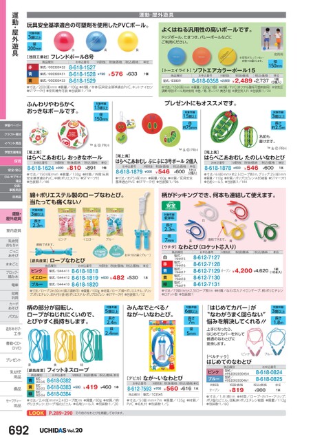 運動・屋外遊具玩具安全基準適合の可塑剤を使用したPVCボール。対象年齢3歳以上径200mm200mm赤青黄[池田工業社]フレンドボール8号商品種別お申込番号M価税抜税抜価格税込価格単位型式/000300431型式/000300432赤青黄●寸法/200(径)mm●質量/100g●材質/本体:玩具安全基準適合PVC、ネット:ナイロン●STマーク付●空気補充可能●包装数:1/188-618-15278-618-15288-618-1529¥576型式/000300433¥633¥7201個よくはねる汎用性の高いボールです。ドッジボール、たまつき、バレーボールなどにご利用ください。150mm※空気が入っていない状態でお届けします。[トーエイライト]ソフトエアカラーボール15商品種別型式/B3809お申込番号8-618-0358M価税抜¥2,800税抜価格税込価格¥2,489¥2,737(3個入)●寸法/150径)mm●質量/200g(1個)●材質/PVC(非フタル酸系可塑剤使用)●空気圧調節:球技ボール用針使用●色/青、オレンジ、黄各1個●要空気入れ●包装数:1/24単位1組使用例径150mmふんわりやわらかくおっきなボールです。対象年齢1.5歳以上径150mmプレゼントにもオススメです。対象年齢1.5歳以上径約75mm対象年齢3歳以上長さ約2.5m名前も書けます。[尾上萬]はらぺこあおむしおっきなボールお申込番号8-618-1624M価税抜¥900税抜価格¥810税込価格¥891単位1個●寸法/150(径)mm●質量/130g●材質/外側:玩具安全基準適合PVC、中綿:ポリエステル●STマーク付●包装数:1/48[尾上萬]はらぺこあおむしぷにぷに3号ボール2個入お申込番号8-618-1879M価税抜¥600税抜価格¥546税込価格¥600単位1セット(2個入)●寸法/約75(径)mm●質量/60g●材質/玩具安全基準適合PVC●STマーク付●包装数:1/96[尾上萬]はらぺこあおむしたのしいなわとびお申込番号8-618-1878M価税抜¥600税抜価格¥546税込価格¥600単位1本●寸法/6(径)mm×約2.5(ロープ長)m、グリップ:25(径)mm●質量/110g●材質/ポリプロピレン・ABS樹脂●STマーク付●名前シール入●包装数:1/144綿+ポリエステル製のロープなわとび。当たっても痛くない!柄がドッキングでき、何本も連結して使えます。対象年齢3歳以上長さ2.3mピンクイエローブルー連結できます。お片付け袋(ブルー)[銀鳥産業]ロープなわとび商品種別お申込番号M価税抜税抜価格税込価格単位型式/044-412型式/044-411ピンクイエローブルー●寸法/ロープ:2m30cm(長さ調節可)●質量/100g●材質/ロープ:綿+ポリエステル、グリップ:ポリエチレン、お片付け袋・紐:ポリエステル・ポリプロピレン●STマーク付●包装数:1/128-618-18188-618-18198-618-1820¥600¥482型式/044-410¥5301本対象年齢低学年長さ2.3m白赤径7mm青連結できます。黄[ウチダ]なわとび(ロケット芯入り)緑単位M価税抜税込価格税抜価格お申込番号商品種別型式/194415型式/194416型式/194417型式/194418型式/194419白赤青黄緑●寸法/7径)mm×2.3(ロープ長)m●材質/なわ:芯入ナイロンテープ、柄:ポリエチレン●ロケット型●包装数:18-612-71278-612-71288-612-71298-612-71308-612-7131オープン¥4,200¥4,620(10本入)1組柄の部分が回転し、ロープがねじれにくいので、とびやすく長持ちします。対象年齢5歳以上長さ2.4m径2.4mmみんなでとべる!なが〜いなわとび。対象年齢6歳以上長さ7m径5mm『はじめてカバー』がなわがうまく回らない悩みを解決してくれる!!対象年齢3歳以上長さ1.8m上手になったら、はじめてカバーを外して普通のなわとびに変身します。青黄[銀鳥産業]フィットネスロープ緑M価税抜税抜価格お申込番号税込価格単位商品種別型式/002-045型式/002-053型式/002-0548-618-03828-618-03838-618-0384青黄緑●寸法/2.4(径)mm×2.4ロープ長)m●質量/80g●材質/柄:ポリエチレン、ロープ:塩化ビニル●名前シール入●包装数:1/20¥419¥460¥5001本[デビカ]なが〜いなわとびお申込番号8-612-7593M価税抜¥700税抜価格¥560税込価格単位¥6161本商品種別型式/103545●寸法/5(径)mm×7m●質量/135g●材質/PVC●名札付●包装数:1/5[ベルテック]はじめてのなわとびピンクピンクブルーM価税抜オープン商品種別型式/4952002030454型式/4952002030461税抜価格¥819ブルーお申込番号8-618-08248-618-0825税込価格¥900単位1本●寸法/1.8(長)m●材質/ロープ・カバー・クリップ:ポリ塩化ビニル、回転体:ポリエチレン樹脂●質量/112g●包装数:1/60運動・屋外遊具学習ペーパークラフト・素材イベント用品学習支援用品保育安全・安心OA・サプライ用品文具・事務用品日用品運動・屋外遊具室内遊具室内遊乳幼児乳児おもちゃごっこごっあそびあそびままごとブロック・ロッ積み木積木電車車知育育玩具具カードカーあそびあそびパズルパル造形あそび・造形あそび・工作工作書籍・CD・籍DVDDVプレゼント乳幼児乳幼児用品用品備品備品セーフティ―用品用品LOOKP.289・290その他のなわとびを掲載しております。692Vol.20