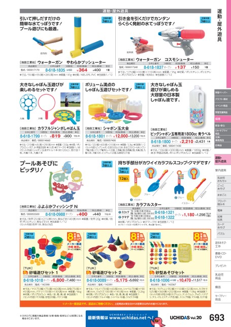 運動・屋外遊具学習ペーパークラフト・素材イベント用品学習支援用品保育安全・安心OA・サプライ用品文具・事務用品日用品運動・屋外遊具室内遊具内乳幼児幼児おもちゃごっここあそびそままごととブロック・積み木み木電車車知育育玩具具カードドあそびそパズルズ造形あそび・造形あそび・工作作書籍・CD・DVDVプレゼントト乳幼児乳幼児用品品備品備品セーフティ―用品用品引いて押しだすだけの簡単な水てっぽうです!プール遊びにも最適。運動・屋外遊具対象年齢3歳以上引き金を引くだけでカンタンらくらく発射の水てっぽうです!対象年齢3歳以上使用例使用例[池田工業社]ウォーターガンやわらかプッシューター商品種別型式/000017170お申込番号8-618-1835M価税抜¥450税抜価格¥364税込価格¥400単位1個●寸法/55幅)×55(奥)×265(高)mm●質量/41g●材質/ABS、EPE、PVC●包装数:1/12[池田工業社]ウォーターガンコスモシューター商品種別型式/000017240お申込番号M価税抜8-618-1837オープン税抜価格¥137税込価格¥150単位1個●寸法/175(幅)×33奥)×110(高)mm●質量/35g●材質/ポリスチレン、ポリエチレン、ポリプロピレン●容量/約80㏄●包装数:1/12大きなしゃぼん玉遊びが楽しめるセットです!対象年齢3歳以上使用例ボリューム満点のしゃぼん玉遊びセットです!対象年齢3歳以上大きなしゃぼん玉遊びが楽しめる大容量の日本製しゃぼん液です。九輪大輪[池田工業社]カラフルジャンボしゃぼん玉お申込番号8-618-1799M価税抜オープン税抜価格¥819税込価格¥900単位1セット[池田工業社]シャボン玉大会お申込番号M価税抜税抜価格税込価格単位8-618-1801オープン¥12,000¥13,2001セット商品種別型式/000014660商品種別型式/000057400●寸法/210(幅)×45(奥)×290(高)mm●質量/250g●材質/ポリプロピレン、PET、水・界面活性剤●1人用●STマーク付●包装数:1/48〈セット内容〉シャボン玉液ボトル:1本(約120㏄)、受け皿:1枚、大輪:1本、九輪:1本●寸法/325幅)×400(奥)×310(高)mm●質量/3.3kg●包装数:1/2〈セット内容〉ビッグシャボン玉液(500cc)5本、吹き口ストロー6本、トランプ輪20個、トランプ輪用トレイ20個、三角輪2個、四角輪2個、丸輪2個、九輪10本、大輪10本、ビッグトレイ20個、収納用カゴ1個[池田工業社]ビッグシャボン玉専用液1800㏄青ラベルお申込番号8-618-1800M価税抜オープン税抜価格税込価格¥2,210¥2,431単位1本商品種別型式/000411430●寸法/106(径)×300(高)mm●質量/1890g●材質/液:水・界面活性剤、ボトル:ポリプロピレン●包装数:1/12持ち手部分がカワイイカラフルスコップ・クマデです!220mm●ブルーイエロー商品種別お申込番号M価税抜税抜価格税込価格単位寸法/240(幅)×35奥)×95(高)mm、質量/28g(1個あたり)、型式/0000104108-618-1321オープン¥1,180¥1,2981セット質量/30g(1個あたり)、型式/0000104208-618-1322寸法/90(幅)×45奥)×220(高)mm、(12個入)スコップクマデ●●●材質/ポリプロピレン●STマーク付●包装数:1/12※ブルー・イエローの2色アソートです。色は選べません。対象年齢3歳以上12個入240mmブルー●イエロー[池田工業社]カラフルスタープールあそびにピッタリ!対象年齢3歳以上[池田工業社]ぷよぷかフィッシングN商品種別型式/000055500お申込番号M価税抜8-618-0988オープン税抜価格¥400税込価格¥440単位1セット●寸法/釣竿:25(径)×215(長)mm、魚など:約140長)mm●質量/釣竿:20g●材質/釣竿:ポリエチレン、魚など:EVA●包装数:1/12〈セット内容〉釣竿1本、魚など6匹対象年齢2歳以上対象年齢2歳以上対象年齢2歳以上沖縄・離島はサービス対象外沖縄・離島はサービス対象外沖縄・離島はサービス対象外[TUK]砂場遊びセット1[TUK]砂場遊びセット2[TUK]砂型あそびセットお申込番号M価税抜税抜価格税込価格単位8-618-1018オープン¥6,800¥7,4801セットお申込番号M価税抜税抜価格税込価格単位8-618-0089オープン¥5,175¥5,6921セットお申込番号M価税抜税抜価格税込価格単位8-618-1006¥11,00¥10,470¥11,5171セット商品種別型式/142390商品種別型式/142391商品種別型式/142367●寸法/マス:75幅)×75奥)×60(高)mm、砂型:75(径)×45(高)mm、バケツ:170径)×130(高)mm●質量/6kg●材質/ポリプロピレン●色/赤、青、黄、緑●包装数:1〈セット内容〉マス8個、砂型20個、バケツ4個●寸法/フルイ:170径)×43高)mm、シャベル:70幅)×190(奥)mm、ジョウゴ:100(径)×145(高)mm●質量/2.2kg●材質/ポリプロピレン●色/赤、青、黄、緑●包装数:1〈セット内容〉フルイ4個、シャベル16個、ジョウゴ4個●寸法/カブトムシ:95(幅)×110(奥)×32高)mm、カゴ外寸:525(幅)×360(奥)×252高)mm●質量/1.8kg●包装数:1〈セット内容〉砂型24個(カブトムシ、テントウムシ、チョウ、ハマグリ、タコ、イカ、ヒトデ、ハチ各3個)、スコップ8個、マス4個、カゴ1個※メーカー直送品です。返品はご容赦ください。上記商品は受注日から8営業日以内のお届けになります。※カタログに掲載の商品情報(仕様・価格・税率など)は変更になる場合がございます。最新情報はUCHIDASww.uchidas.netwへ!Vol.20693