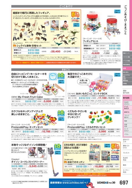 ごっこあそび・ままごと学習ペーパークラフト・素材イベント用品学習支援用品保育安全・安心OA・サプライ用品文具・事務用品日用品運動・動・屋外遊具外室内遊具乳幼児幼児おもちゃごっこあそびままごとブロック・積み木み木電車車知育育玩具具カードドあそびそパズルズ造形あそび・造形あそび・工作作書籍・CD・DVDVプレゼントト乳幼児乳幼児用品品備品備品セーフティ―用品用品対象年齢3歳以上単位1セット恐竜セット対象年齢6歳以上家畜動物セットお申込番号8-618-14868-618-1485m50m約[ラーニング・リソーシズ]フィギュアセット商品種別恐竜セット家畜動物セット型式/LER-0811型式/LER-0810M価税抜オープン税抜価格¥6,620税込価格¥7,282単位1セット(60個入)●ケース寸法/125(幅)×125(奥)×133(高)mm●材質/PVC●CEマーク付●包装数:1/6〈セット内容〉恐竜セット:ティラノザウルスレックス、ステゴサウルスなど、家畜動物セット:鳥、豚、牛、山羊など全10種各6個※この商品は輸入品です。在庫切れの場合は、納期がかかる場合がございます。※ケースの仕様は予告なく変更になる場合がございます。沖縄・離島はサービス対象外対象年齢3歳以上28cm9.5cmmm76約ごっこあそび使用例使用例14cm恐竜セット動物セット例(一部変更になる場合があります)17.2cmmc2.4cm9[シュライヒ]シュライヒ動物・恐竜セット商品種別お申込番号M価税抜税抜価格税込価格動物セット恐竜セット●材質/本体:非フタル酸系PVC、収納袋:綿●包装数:1〈セット内容〉動物セット:ライオン、キリン、カンガルー、シマウマ、ゾウなど全17種25体、収納袋入り8-618-18558-618-1856¥28,400¥28,400¥31,240恐竜セット:ティラノサウルス、スピノサウルス、ギガノトサウルスなど全10種各1体、収納袋入り単位1セット※メーカー直送品です。返品はご容赦ください。上記商品は受注日から8営業日以内のお届けになります。細部まで精巧に再現したフィギュア。シュライヒのフィギュアはいずれも細部にまで気を配り、心を込めた手作業でひとつずつ色付けしているので、どれも世界にひとつしかないものばかりです。自由にトッピング!ホールケーキを切り分けて楽しくままごと。●ケーキ本体はクリームケーキとチョコケーキの2WAY仕様。●自由にケーキにトッピングする楽しさや、ケーキをサクッと切る本格的な感触で子どもを夢中にさせます。チョコケーキ面ままごと集団でのごっこあそびに大活躍です!お買い物かご付き。対象年齢3歳以上[GENI]MyFreshFruitCake商品種別型式/826133お申込番号8-618-1757M価税抜¥5,000税抜価格¥5,000クリームケーキ面税込価格¥5,500単位1セット●CEマーク付●寸法/205幅)×195(奥)×62(高)mm●質量/730g●材質/天然木、ナイロン●包装数:1/16〈セット内容〉ケーキ本体×1、ナイフ×1、ブルーベリー×2、キウイ×3、パイン×3、いちご×4、クリーム×6、ろうそく×6カラフルなキッチンアイテムで楽しいおままごと。[ラーニング・リソーシズ]Pretend&Playキッチンセット商品種別型式/LER-9157お申込番号8-618-1483M価税抜オープン税抜価格税込価格¥10,766¥11,842対象年齢3歳以上単位1セット[コンセル]おかいものごっこコンテナBOX商品種別型式/CC1980お申込番号8-618-1512M価税抜¥19,000税抜価格税込価格¥17,100¥18,810●ケース寸法/450(幅)×360奥)×250高)mm●質量/2.4kg●材質/ポリプロピレン、ポリエチレン●包装数:1〈セット内容〉買い物かご×12(ピンク)、ハンバーガー、フライドポテト、フライドチキン、ソーセージ、マカロン、ソフトクリーム、ドーナッツ、アイスキャンデー、ドリンク、ケチャップ×各12※色柄は変更になる場合がございます。ご了承ください。くだもの・やさいを半分に切ってクッキング![ラーニング・リソーシズ]Pretend&Playくだものやさいセット商品種別型式/LER-7287お申込番号8-618-1484M価税抜オープン税抜価格¥5,990対象年齢3歳以上税込価格¥6,589単位1セット●CEマーク付●包装数:1/4〈セット内容〉ポット、カップ、ボウル、皿、調理器具、ティーポット、ざる、ピッチャー、クッキーカッター、ローラー、ジューサー、鍋など、キッチンアイテム合計73個入※この商品は輸入品です。在庫切れの場合は、納期がかかる場合がございます。●CEマーク付●材質//HIPS、ポリプロピレン、ナイロン●包装数:1/12〈セット内容〉いちご・オレンジ・プラム・洋ナシ・にんじん・とうもろこし・トマト・ピーマン・レタス・パイナップル・包丁・まな板各1個合計23個入※この商品は輸入品です。在庫切れの場合は、納期がかかる場合がございます。本物そっくりなダイソンの掃除機!小さな紙やポリビーズを吸い込んで、捨てることもできます。丈夫な木製で、まるで本物の家具のような質感!シンプルでたくさんの食器類が39点も付いているキッチンセットです。対象年齢3歳以上対象年齢3歳以上沖縄・離島はサービス対象外[Casdon]ダイソンコードレストイクリーナー使用例お申込番号8-618-1695オープン¥5,545¥6,0991セットM価税抜税抜価格税込価格単位商品種別型式/68750●寸法/約170幅)×150(奥)×800(高)mm●質量/1kg●材質/