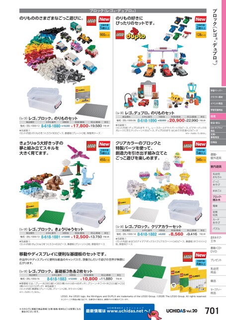 ブロック(レゴⓇ・デュプロⓇ)学習ペーパークラフト・素材イベント用品学習支援用品保育安全・安心OA・サプライ用品文具・事務用品日用品運動・動・屋外遊具外室内遊具乳幼児幼児おもちゃごっここあそびそままごととブロック・積み木電車車知育育玩具具カードドあそびそパズルズ造形あそび・造形あそび・工作作書籍・CD・DVDVプレゼントト乳幼児乳幼児用品品備品備品セーフティ―用品用品のりもののさまざまなごっこ遊びに。ブロック(レゴⓇ・デュプロⓇ)のりもの好きにぴったりのセットです。対象年齢5歳以上900ピース対象年齢2歳以上128ピース[レゴ]レゴブロックのりものセット商品種別型式/ZEL-1000-12お申込番号8-618-1880¥19,300¥17,800¥19,580M価税抜税抜価格税込価格単位1セット●包装数:1〈セット内容〉のりものをつくろう×900ピース、基礎板(グレー)×2枚、保管用ケース[レゴ]レゴデュプロのりものセット商品種別型式/ZEL-1000-06お申込番号8-618-1890¥22,800¥20,900¥22,990M価税抜税抜価格税込価格単位1セット●包装数:1〈セット内容〉デュプロのまちF1®レースカーとドライバー×70ピース、ピクサードックのガレージにきたマックィーン×35ピース、デュプロのまちはじめての空港×23ピース※ケースは付いていません。きょうりゅう大好きっ子の夢と組み立てスキルを大きく育てます。クリアカラーのブロックと特製パーツを使って、創造力を引き出す組み立てとごっこ遊びを楽しめます。対象年齢5歳以上450ピース対象年齢5歳以上340ピース[レゴ]レゴブロックきょうりゅうセット商品種別型式/ZEL-1000-13お申込番号8-618-1881¥13,600¥12,500¥13,750M価税抜税抜価格税込価格単位1セット●包装数:1〈セット内容〉きょうりゅうをつくろう×450ピース、基礎板(グリーン)×2枚、保管用ケース[レゴ]レゴブロッククリアカラーセット商品種別型式/ZEL-1000-14お申込番号8-618-1882M価税抜¥9,300税抜価格¥8,560税込価格¥9,416単位1セット●包装数:1〈セット内容〉まほうのアイデアボックス<クリアカラー>×340ピース、基礎板(ホワイト)×2枚、保管用ケース移動やディスプレイに便利な基礎板のセットです。作品作りやディスプレイに便利な創造のキャンバスで、想像力しだいで遊びの世界が無限に広がります。対象年齢4歳以上[レゴ]レゴブロック基礎板3色各2枚セット商品種別型式/ZEL-1000-16お申込番号8-618-1883M価税抜¥12,000税抜価格¥10,800税込価格¥11,880単位1セット●基礎板寸法/グレー:約380縦)×380(横)mm(48×48ポッチ)、グリーン・ホワイト:約250(縦)×250(横)mm(32×32ポッチ)●包装数:1〈セット内容〉基礎板(グレー×2枚、グリーン×2枚、ホワイト×2枚)※ケースは付いていません。LEGO,theLEGOlogo,theMinifigureandDUPLOaretrademarksoftheLEGOGroup.©2026TheLEGOGroup.Allrightsreserved.※このページの商品は輸入品です。在庫切れの場合は、納期がかかる場合がございます。※カタログに掲載の商品情報(仕様・価格・税率など)は変更になる場合がございます。最新情報はUCHIDASww.uchidas.netwへ!Vol.20701