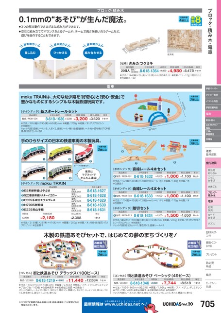 ブロック・積み木・電車学習ペーパークラフト・素材イベント用品学習支援用品保育安全・安心OA・サプライ用品文具・事務用品日用品運動・動・屋外遊具外室内遊具乳幼児幼児おもちゃごっここあそびそままごととブロック・積み木電車知育育玩具具カードドあそびそパズルズ造形あそび・造形あそび・工作作書籍・CD・DVDVプレゼントト乳幼児乳幼児用品品備品備品セーフティ―用品用品木製の鉄道あそびセットで、はじめての夢のまちづくりを!対象年齢3歳以上対象年齢3歳以上[コンセル]街と鉄道あそびデラックス(100ピース)商品種別型式/L03380お申込番号M価税抜8-618-1219¥13,000税抜価格¥11,440税込価格¥12,584単位1セット●寸法/1020×945mm(組立時)●質量/2.86kg●材質/ブナ、イジュ、ポリエチレン●ブロック数/100個●食品検査済●お客様組立商品●包装数:1〈セット内容〉レール×30、橋×1、支柱×2、電柱×5、標識×5、木×12、トレイン×8、車×4、バス×2、救急車×2、踏切×1、人×6、家×22[コンセル]街と鉄道あそびベーシック(49ピース)商品種別型式/L03400お申込番号8-618-1346M価税抜¥8,800税抜価格¥7,744税込価格¥8,518単位1セット●寸法/1030×660mm(組立時)●質量/1.92kg●材質/ブナ、イジュ、ポリエチレン●ブロック数/49個●食品検査済●お客様組立商品●包装数:1〈セット内容〉レール×21、橋×3、支柱×2、トレイン×6、人×3、木×4、標識×4、家×6※カタログに掲載の商品情報(仕様・価格・税率など)は変更になる場合がございます。最新情報はUCHIDASww.uchidas.netwへ!Vol.20705[松崎]きみたつクミキ商品種別お申込番号M価税抜税抜価格税込価格単位kmt005-18-618-1364¥4,98020個入型式/●寸法/144(幅)×36(奥)×12高)mm(1個あたり)●質量/15〜17g(1個あたり)●包装数:1/20¥4,980¥5,4781セット対象年齢4歳以上使用例12mmmm441m36m基本動作1差し込む基本動作2ひっかける基本動作3組み合わせるブロック・積み木0.1mmの“あそび”が生んだ魔法。●3つの基本動作でさまざまな組み方ができます。●交互に組み立ててバランスをとるゲームや、チームで高さを競い合うゲームなど、遊びを自作することもできます。mokuTRAINは、大切な幼少期を「好奇心」と「安心・安全」で豊かなものにするシンプルな木製鉄道玩具です。電車[ポポンデッタ]新スタートレールセット商品種別型式/MOK-504お申込番号M価税抜8-618-1636¥3,200税抜価格¥3,200税込価格¥3,520単位1セット●寸法/295(幅)×190(奥)×60(高)mm●質量/700g●材質/木・ポリプロピレン●包装数:1〈セット内容〉曲線レール×8、人形×2、直線レール・青い鉄橋(直線レール付)信号機・STOP標識・駅・時計台・木×各1手のひらサイズの日本の鉄道車両の木製玩具。cm0約6対象年齢3歳以上●対象年齢3歳以上mc44約対象年齢3歳以上●●[ポポンデッタ]直線レール4本セット商品種別お申込番号税抜価格8-618-1632型式/MOK-701●●寸法/152(幅)×40(奥)×12高)mm(レール1本)●質量/140g●材質/木●包装数:1¥1,000税込価格¥1,100M価税抜¥1,000[ポポンデッタ]曲線レール4本セット商品種別お申込番号税抜価格8-618-1633型式/MOK-703●●寸法/110(幅)×40(奥)×12高)mm(レール1本)●質量/170g●材質/木●包装数:1¥1,000税込価格¥1,100M価税抜¥1,000[ポポンデッタ]踏切セット商品種別お申込番号単位1セット単位1セット単位8-618-1634型式/MOK-713●●寸法/踏切セット:108(幅)×40(奥)×12高)mm●質量/200g●材質/木・ポリプロピレン・ポリエチレン●包装数:1〈セット内容〉踏切セット×1、警告灯×2、直線レール×1¥1,5001セットM価税抜¥1,500税抜価格税込価格¥1,650❶❹❷❺❸※レールは別売です。車両はマグネットでかんたん連結!型式/MOK-001型式/MOK-003型式/MOK-009型式/MOK-028型式/MOK-029税込価格¥2,398お申込番号8-618-16278-618-16288-618-16298-618-16308-618-1631単位1セット[ポポンデッタ]mokuTRAIN商品種別E5系新幹線はやぶさ923形新幹線ドクターイエローE259系成田エクスプレスN700S新幹線E235系山手線●●●●●M価税抜¥2,180税抜価格¥2,180●寸法/215(幅)×25(奥)×47(高)mm●質量/200g●材質/木・ABS・鉄・磁石・ポリプロピレン●包装数:1