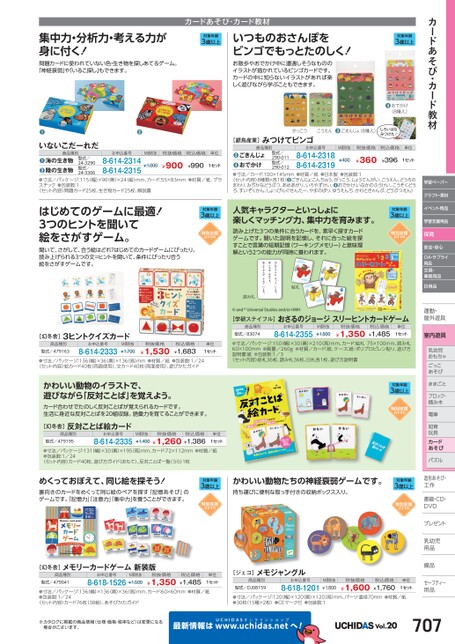 カードあそび・カード教材学習ペーパークラフト・素材イベント用品学習支援用品保育安全・安心OA・サプライ用品文具・事務用品日用品運動・動・屋外遊具外室内遊具乳幼児幼児おもちゃごっここあそびそままごととブロック・積み木み木電車車知育育玩具具カードあそびパズルズ造形あそび・造形あそび・工作作書籍・CD・DVDVプレゼントト乳幼児乳幼児用品品備品備品セーフティ―用品用品[幻冬舎]メモリーカードゲーム新装版商品種別型式/479041お申込番号8-618-1526M価税抜¥1,500税抜価格¥1,350税込価格¥1,485単位1セット●寸法/パッケージ:136(幅)×136(奥)×36(高)mm、カード:60×60mm●材質/紙●包装数:1/24〈セット内容〉カード76枚(38組)、あそびかたガイド※カタログに掲載の商品情報(仕様・価格・税率など)は変更になる場合がございます。最新情報は[ジェコ]メモジャングル商品種別型式/DJ08159お申込番号8-618-1201M価税抜¥1,600税抜価格¥1,600税込価格¥1,760単位1セット●寸法/パッケージ:120幅)×120奥)×120高)mm、パーツ:直径70mm●材質/紙●30枚(15種×2枚)●CEマーク付●包装数:1UCHIDASww.uchidas.netwへ!Vol.20707カードあそび・カード教材対象年齢3歳以上いつものおさんぽをビンゴでもっとたのしく!お散歩やおでかけ中に遭遇しそうなもののイラストが描かれているビンゴカードです。カードの中に知らないイラストがあれば楽しく遊びながら学ぶこともできます。対象年齢3歳以上❹おでかけ(8種入)がっこうこうえん●ごきんじょ(8種入)しろいはなみつけた![銀鳥産業]みつけてビンゴ商品種別お申込番号8-614-23188-614-2319M価税抜税抜価格税込価格単位¥400¥360¥3961セット型式/290-011型式/290-012ごきんじょおでかけ●●M価税抜税抜価格税込価格単位¥1,000¥900¥9901セット●寸法/パッケージ:115(幅)×90奥)×24(縦)mm、カード:55×83mm●材質/紙、プラスチック●包装数:1〈セット内容〉問題カード25枚、生き物カード25枚、解説書●寸法/カード:100×145mm●材質/紙●日本製●包装数:1〈セット内容〉8種類×各1枚(●ごきんじょ:こんちゅう、がっこう、しょうてんがい、こうえん、どうろのまわり、みぢかなどうぶつ、あめあがり、いろやずけい、●おでかけ:いなかのふうけい、こうそくどうろ、すいぞくかん、しょっぴんぐせんたー、やまのぼり、ゆうえんち、かわときゃんぷ、どうぶつえん)はじめてのゲームに最適!3つのヒントを聞いて絵をさがすゲーム。聞いて、さがして、合う絵はどれ?はじめてのカードゲームにぴったり。読み上げられる3つの文=ヒントを聞いて、条件にぴったり合う絵をさがすゲームです。対象年齢3歳以上人気キャラクターといっしょに楽しくマッチング力、集中力を育みます。対象年齢3歳以上読み上げた3つの条件に合うカードを、素早く探すカードゲームです。聞いた説明を記憶し、それに合った絵を探すことで言葉の短期記憶(ワーキングメモリー)と意味理解という2つの能力が同時に養われます。絵札読み札[幻冬舎]3ヒントクイズカード商品種別型式/479163お申込番号8-614-2333M価税抜¥1,700税抜価格¥1,530税込価格¥1,683単位1セット●寸法/パッケージ:136(幅)×36(奥)×136(高)mm●材質/紙●包装数:1/24〈セット内容〉絵カード40枚(両面使用)、文カード40枚(両面使用)、遊びかたガイドかわいい動物のイラストで、遊びながら「反対ことば」を覚えよう。[学研ステイフル]おさるのジョージスリーヒントカードゲーム商品種別型式/83074お申込番号8-614-2355M価税抜¥1,500税抜価格¥1,350税込価格¥1,485単位1セット●寸法/パッケージ:150(幅)×30(奥)×210高)mm、カード:絵札75×100mm、読み札60×100mm●質量/260g●材質/カード:紙、ケース:紙・ポリプロピレン貼り、遊び方説明書:紙●包装数:1/3〈セット内容〉絵札36枚、読み札36枚、白札各1枚、遊び方説明書対象年齢3歳以上カード合わせでたのしく反対ことばが覚えられるカードです。生活に身近な反対ことばを20組収録。語彙力を育てることができます。[幻冬舎]反対ことば絵カード商品種別型式/479195お申込番号8-614-2335M価税抜税抜価格税込価格¥1,400¥1,260¥1,386単位1セット●寸法/パッケージ:131幅)×30奥)×195高)mm、カード:72×112mm●材質/紙●包装数:1/24〈セット内容〉カード40枚、遊び方ガイド(おもて)、反対ことば一覧(うら)1枚めくっておぼえて、同じ絵を探そう!裏向きのカードをめくって同じ絵のペアを探す「記憶あそび」のゲームです。「記憶力」注意力」集中力」を養うことができます。対象年齢3歳以上かわいい動物たちの神経衰弱ゲームです。持ち運びに便利な取っ手付きの収納ボックス入り。対象年齢3歳以上集中力・分析力・考える力が身に付く!問題カードに使われていない色・生き物を探しあてるゲーム。「神経衰弱」や「いるこ探し」もできます。●●お申込番号8-614-23148-614-2315商品種別型式/24-3290型式/24-3306海の生き物陸の生き物●●いないこだーれだ