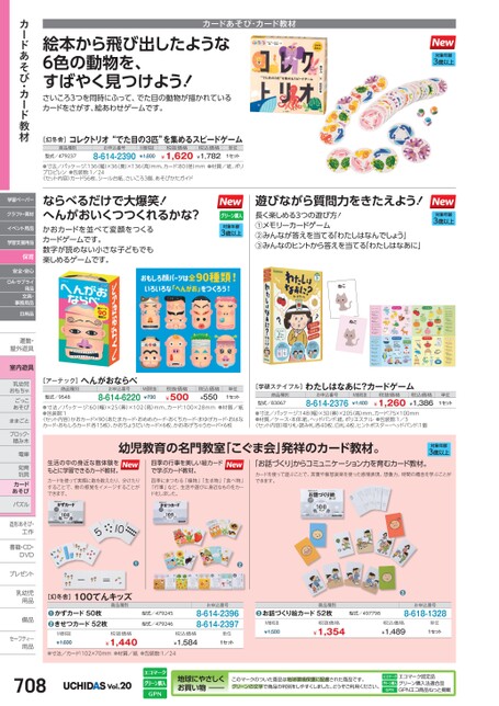 カードあそび・カード教材絵本から飛び出したような6色の動物を、すばやく見つけよう!さいころ3つを同時にふって、でた目の動物が描かれているカードをさがす、絵あわせゲームです。対象年齢3歳以上[幻冬舎]コレクトリオ“でた目の3匹”を集めるスピードゲーム商品種別型式/479237お申込番号8-614-2390M価税抜¥1,800税抜価格¥1,620税込価格¥1,782単位1セット●寸法/パッケージ:136幅)×36(奥)×136(高)mm、カード:80径)mm●材質/紙、ポリプロピレン●包装数:1/24〈セット内容〉カード56枚、シール台紙、さいころ3個、あそびかたガイドならべるだけで大爆笑!へんがおいくつつくれるかな?かおカードを並べて変顔をつくるカードゲームです。数字が読めない小さな子どもでも楽しめるゲームです。遊びながら質問力をきたえよう!長く楽しめる3つの遊び方!①メモリーカードゲーム②みんなが答えを当てる「わたしはなんでしょう」③みんなのヒントから答えを当てる「わたしはなあに」対象年齢3歳以上対象年齢3歳以上へんがおならべ[アーテック]商品種別型式/9548お申込番号8-614-6220M価税抜¥730税抜価格¥500税込価格¥550単位1セット●寸法/パッケージ:60(幅)×25(奥)×102(高)mm、カード:100×28mm●材質/紙●包装数:1〈セット内容〉かおカード×90(あたまカード・おめめカード・おくちカード・まゆげカード・おはなカード・おもしろカード:各15枚)、かおちょうだいカード×6枚、かおあげちゃうカード×6枚[学研ステイフル]わたしはなあに?カードゲーム商品種別型式/83067お申込番号8-614-2376M価税抜¥1,400税抜価格¥1,260税込価格¥1,386単位1セット●寸法/パッケージ:148幅)×30奥)×205高)mm、カード:75×100mm●材質/ケース・本体:紙、ヘッドバンド:紙、ポリエステル●包装数:1/3〈セット内容〉取り札・読み札:各40枚、白札:4枚、ヒントポスター・ヘッドバンド:1個幼児教育の名門教室「こぐま会」発祥のカード教材。対象年齢3歳以上「お話づくり」からコミュニケーション力を育むカード教材。カードを使って遊ぶことで、言葉や喜怒哀楽を使った感情表現、想像力、時間の概念を学ぶことができます。お話づくり絵カード52枚商品種別●型式/497798M価税抜¥1,500税抜価格¥1,354●お申込番号8-618-1328税込価格¥1,489単位1セット生活の中の身近な数体験をもとに学習できるカード教材。カードを使って実際に数を数えたり、分けたりすることで、数の感覚をイメージすることができます。四季の行事を美しい絵カードで学ぶカード教材。四季にまつわる「植物」「生き物」「食べ物」「行事」など、生活や遊びに身近なものをカード化しました。●●型式/479245型式/479246お申込番号8-614-23968-614-2397[幻冬舎]100てんキッズ商品種別かずカード50枚きせつカード52枚●●M価税抜¥1,600税抜価格¥1,440税込価格¥1,584単位1セット●寸法/カード:102×70mm●材質/紙●包装数:1/24カードあそび・カード教材学習ペーパークラフト・素材イベント用品学習支援用品保育安全・安心OA・サプライ用品文具・事務用品日用品運動・運屋外遊具屋外遊室内遊具乳幼児乳児おもちゃごっこごっあそびあそびままごとブロック・ロッ積み木積木電車車知育育玩具具カードあそびパズルパル造形あそび・造形あそび・工作工作書籍・CD・籍DVDDVプレゼント乳幼児乳幼児用品用品備品備品セーフティ―用品用品708Vol.20地球にやさしくお買い物このマークのついた商品は地球環境保護に配慮された商品です。グリーンの文字で商品の判別をしやすくしました。どうぞご利用ください。エコマーク認定品グリーン購入法適合品GPNエコ商品ねっと掲載