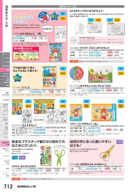 おえかきの時間やプレゼントにもぴったり!!ウチダスキャラクター「ピペット」のぬり絵が付いたおえかきちょうです。ぬり絵付き![ウチダ]おえかきちょう1冊お申込番号M価税抜8-618-0905オープン税抜価格¥119税込価格¥130単位1冊商品種別60枚●寸法/247(縦)×175(横)×9厚)mm●60枚+ぬり絵1枚付●材質/表紙:コート紙、中紙:中質紙●包装数:1/10まとめ買いパック※1組単位申込。商品種別60枚(1冊)お申込番号8-618-0910税抜価格税込価格¥1,000¥1,1001組(10冊入)単位造形あそび・工作B560枚A4・B4サイズのじゆうがちょう!リング部分も紙素材のため、使い終わったらそのまま処分することができるので環境にも配慮した商品です。A420枚B420枚角が丸くて安全!HI!MYZOOとは「Asceneofnature(自然の1コマ)」をテーマにイメージ表現したテキスタイルパターングラフィックスブランドです。HI!MYZOOは売上金の一部を公益財団法人日本自然保護協会に寄付し、豊かな自然環境を守る取り組みを支援しています。[エヒメ紙工]HI!MYZOOじゆうがちょう商品種別お申込番号M価税抜税抜価格単位型式/HIMY-A4A4判B4判●寸法/A4:206縦)×292(横)mm、B4:254縦)×359横)mm●材質/画用紙●包装数:18-614-2337オープン8-614-2338¥400¥464型式/HIMY-B41冊税込価格¥440¥510P.61HI!MYZOOおりがみを掲載しております。下の絵が透けて見え、なんでも写して書ける!B530枚B424枚ダブルリング綴じ[トーヨー]うつしえ商品種別型式/220101お申込番号8-618-0465M価税抜¥200税抜価格¥158税込価格¥173単位1冊●寸法/257(縦)×174(横)×2(厚)mm●材質/チャンピオンコピー●包装数:1/20[ゴークラ]じゆうがちょうB4花とみつばち商品種別お申込番号税抜価格型式/J-018-618-086524枚●寸法/253縦)×358(横)×8(厚)mm●材質/紙●24枚+ぬり絵1枚付●製本/ダブルリング綴じ●包装数:1/60¥255税込価格¥280単位1冊M価税抜¥330B580枚B440枚B570枚/3冊入B430枚/3冊入ぬりえ付き。[キョクトウ]おえかきちょう商品種別お申込番号M価税抜税抜価格寸法/252縦)×179(横)×9.5厚)mm、質量/245g、型式/Y461寸法/250縦)×350(横)×5.5厚)mm、質量/260g、型式/Y761B5B4●材質/表紙:グロスコート紙、中紙:薄口画紙60g/m28-618-09498-618-0948オープン¥173税込価格単位¥1901冊[協和紙工]らくがきちょう3冊入商品種別お申込番号M価税抜税抜価格税込価格39-103B570枚(1冊)型式/B430枚(1冊)型式/●寸法/B5:247(縦)×175(横)×22(厚)mm、B4:247縦)×350横)×13厚)mm●紙厚/0.09mm●材質/紙●包装数:1/308-618-1715オープン¥2828-618-1716¥31039-104単位1組(3冊入)●ぬりえ付(1枚)●包装数:1/5/60安全なプラスチック製だから初めてのはさみにぴったり。はさみの開閉が自然に身につくスプリング付き●全体が樹脂でできた紙専用のはさみです。●れんしゅうシート5枚入り。対象年齢2歳以上右手用[銀鳥産業]あんぜんはさみお申込番号商品種別型式/044-402税込価格¥370●全長/137mm●刃渡り/57mm●質量/44g●材質/ポリスチレン樹脂●包装数:1/108-618-1822¥337M価税抜¥400税抜価格単位1本幼児の手にあった使いやすいはさみ!切り終わったとき刃先で紙をはさむので、続けて切ることができます。右手用[ウカイ利器]幼児用はさみかみきりくん商品種別お申込番号税抜価格型式/SS101Fくま●全長/110mm●刃渡り/43mm●右手用●質量/21g●材質/刃:ステンレス、柄:ABS樹脂●名札付●包装数:1/108-618-0184¥400税込価格¥440単位1本M価税抜¥500造形あそび・工作学習ペーパークラフト・素材イベント用品学習支援用品保育安全・安心OA・サプライ用品文具・事務用品日用品運動・運屋外遊具屋外遊室内遊具室内遊乳幼児乳児おもちゃごっこごっあそびあそびままごとブロック・ロッ積み木積木電車車知育育玩具具カードカーあそびあそびパズルパル造形あそび・工作書籍・CD・籍DVDDVプレゼント乳幼児乳幼児用品用品備品備品セーフティ―用品用品P.500はみだしてもいいぬりえを掲載しております。712Vol.20