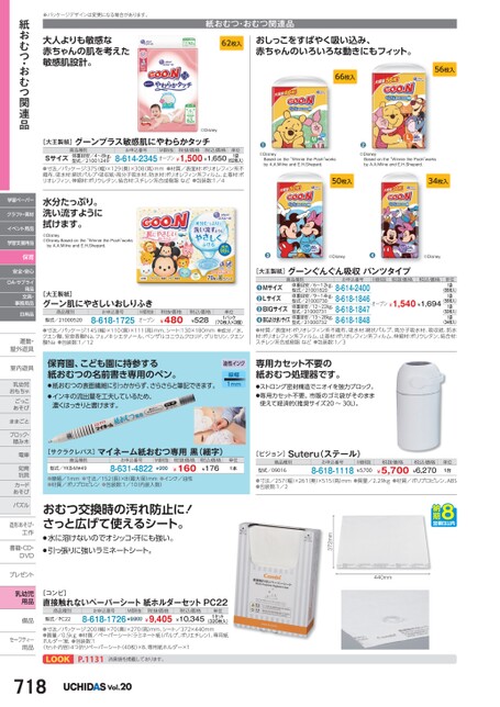 ©Disney税込価格単位1袋(66枚入)(56枚入)(50枚入)1袋1袋1袋オープン¥1,540¥1,694(34枚入)●材質/表面材:ポリオレフィン系不織布、吸水材:綿状パルプ、高分子吸水材、吸収紙、防水材:ポリオレフィン系フィルム、止着材:ポリオレフィン系フィルム、伸縮材:ポリウレタン、結合材:スチレン系合成樹脂など●包装数:1/3[大王製紙]グーンぐんぐん吸収パンツタイプM価税抜税抜価格お申込番号8-614-24008-618-18468-618-18478-618-1848商品種別体重目安/6〜12kg、型式/21001820体重目安/9〜14kg、型式/21000730体重目安/12〜22kg、型式/21000731体重目安/13〜28kg、型式/21000732MサイズLサイズBIGサイズBIGより大きいサイズ●●●●※パッケージデザインは変更になる場合があります。大人よりも敏感な赤ちゃんの肌を考えた敏感肌設計。紙おむつ・おむつ関連品62枚入おしっこをすばやく吸い込み、赤ちゃんのいろいろな動きにもフィット。66枚入56枚入©Disney[大王製紙]グーンプラス敏感肌にやわらかタッチ商品種別お申込番号M価税抜税抜価格税込価格体重目安/4〜8kg、型式/21001249Sサイズ(62枚入)●寸法/パッケージ:375(幅)×129(奥)×308高)mm●材質/表面材:ポリオレフィン系不織布、吸水材:綿状パルプ・吸収紙・高分子吸水材、防水材:ポリオレフィン系フィルム、止着材:ポリオレフィン、伸縮材:ポリウレタン、結合材:スチレン系合成樹脂など●包装数:1/48-614-2345オープン¥1,500¥1,650単位1袋●●©DisneyBasedthebyA.A.Milneon"WinnieandE.H.Shepard.thePooh"works©DisneyBasedthebyA.A.Milneon"WinnieandE.H.Shepard.thePooh"works50枚入34枚入水分たっぷり。洗い流すように拭けます。©Disney©Disney.BasedbyA.A.Milnethe"WinnieonandE.H.Shepard.thePooh"works●©Disney●●寸法/257(幅)×261(奥)×515(高)mm●質量/2.29kg●材質/ポリプロピレン、ABS●包装数:1/2440mm372mm[ピジョン]Suteru(ステール)商品種別型式/09016お申込番号8-618-1118M価税抜¥5,700税抜価格¥5,700税込価格¥6,270単位1台[サクラクレパス]マイネーム紙おむつ専用黒(細字)商品種別型式/YKB-M#49お申込番号8-631-4822M価税抜¥200税抜価格¥160税込価格¥176単位1本●線幅/1mm●寸法/152(長)×8(最大径)mm●インク/油性●材質/ポリプロピレン●包装数:1/10(内装入数)おむつ交換時の汚れ防止に!さっと広げて使えるシート。●水に溶けないのでオシッコ・汗にも強い。●引っ張りに強いラミネートシート。[コンビ]直接触れないペーパーシート紙ホルダーセットPC22商品種別型式/PC22お申込番号M価税抜税抜価格8-618-1726¥9,900¥9,405税込価格¥10,345単位1セット(320枚入)●寸法/パッケージ:200(幅)×70(奥)×270(高)mm、シート/372×440mm●質量/0.5kg●材質/ペーパーシート:ラミネート紙(パルプ、ポリエチレン)、専用紙ホルダー:紙●包装数:1〈セット内容〉4つ折りペーパーシート(40枚)×8、専用紙ホルダー×1P.1131消臭袋を掲載しております。保育園、こども園に持参する紙おむつの名前書き専用のペン。●紙おむつの表面繊維に引っかからず、さらさらと筆記できます。●インキの流出量を工夫しているため、濃くはっきりと書けます。油性インク線幅1mm専用カセット不要の紙おむつ処理器です。●ストロング密封構造でニオイを強力ブロック。●専用カセット不要。市販のゴミ袋がそのまま使えて経済的(推奨サイズ20〜30L)。[大王製紙]グーン肌にやさしいおしりふき商品種別型式/21000520お申込番号8-618-1725M価税抜オープン税抜価格¥480税込価格¥528(70枚入×3個)●寸法/パッケージ:145(幅)×110(奥)×111(高)mm、シート:130×180mm●成分/水、クエン酸、安息香酸Na、フェノキシエタノール、ベンザルコニウムクロリド、グリセリン、クエン酸Na●包装数:1/12単位1パック紙おむつ・おむつ関連品学習ペーパークラフト・素材イベント用品学習支援用品保育安全・安心OA・サプライ用品文具・事務用品日用品運動・運屋外遊具屋外遊室内遊具室内遊乳幼児乳児おもちゃごっこごっあそびあそびままごとブロック・ロッ積み木積木電車車知育育玩具具カードカーあそびあそびパズルパル造形あそび・造形あそび・工作工作書籍・CD・籍DVDDVプレゼント乳幼児用品備品備品セーフティ―用品用品718Vol.20