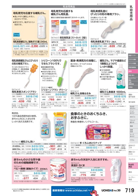 学習ペーパークラフト・素材イベント用品学習支援用品保育安全・安心OA・サプライ用品文具・事務用品日用品運動・動・屋外遊具外室内遊具内乳幼児幼児おもちゃごっここあそびそままごととブロック・積み木み木電車車知育育玩具具カードドあそびそパズルズ造形あそび・造形あそび・工作作書籍・CD・DVDVプレゼントト乳幼児用品備品備品セーフティ―用品用品[ピジョン]哺乳びん消毒はさみ商品種別型式/1026809お申込番号8-618-1577M価税抜¥880税抜価格¥835税込価格¥918単位1本●寸法/112(幅)×48(奥)×330(高)mm●包装数:1/5[ピジョン]哺乳びん除菌液1000mL商品種別型式/1022191お申込番号8-618-1576M価税抜税抜価格税込価格オープン¥1,130¥1,243単位1本●内容量/1000mL●包装数:1/6※次亜塩素酸ナトリウム1W/V%、および添加物としてph調整剤を含有。食事のときのおくちふき、お手ふきに。無着色・無香料・ノンアルコール。[ピジョン]手・くちふきとりナップ商品種別型式/10440お申込番号8-618-1013M価税抜オープン税抜価格¥400税込価格¥440単位1パック(70枚×2個入)●寸法/シート:130×190mm●質量/470g●材質/水、PG、ポリリシノレイン酸ポリグリセリル-5、エチルパラベン、プロピルパラベン、安息香酸Na、クエン酸、クエン酸Na●包装数:1/16赤ちゃんの沐浴や入浴におすすめ。[ピジョン]湯温計白くま商品種別型式/15101お申込番号8-618-0495税抜価格M価税抜¥800¥775税込価格¥852●寸法/77幅)×46奥)×193高)mm●表示温度範囲/10〜60℃●材質/スチロール樹脂●包装数:1/5単位1個UCHIDASww.uchidas.netwへ!Vol.20719乳幼児用品乳幼児用品母乳育児を応援する哺乳びん用乳首。※パッケージデザインは変更になる場合があります。母乳実感乳首にぴったりの形の専用ブラシ。哺乳の3原則「吸着・吸啜・嚥下」をサポートします。対象年齢3カ月以上対象年齢6カ月以上きめ細かいウレタン製スポンジで、デリケートな乳首を傷つけません。MサイズLサイズ[ピジョン]母乳実感乳首(スリーカット)2個入MサイズLサイズ商品種別型式/1026768型式/1026769お申込番号8-618-15728-618-1573M価税抜¥1,700税抜価格¥1,609税込価格¥1,769単位1箱(2個入)●寸法/50(幅)×50(奥)×45(高)mm●質量/16g●材質/シリコンゴム●包装数:1/10[ピジョン]母乳実感乳首ブラシ2本入お申込番号8-618-1741M価税抜¥660商品種別型式/1026811税抜価格¥639税込価格¥702単位1袋(2本入)●寸法/84(幅)×30(奥)×188(高)mm●質量/31g●ピジョン母乳実感乳首、マグマグニップル専用●耐熱温度/ブラシ:80℃、柄:120℃●包装数:1/10母乳育児を応援する哺乳びん。●洗いやすく調乳しやすい、広口タイプです。●持ちやすく、転がりにくい形状です。対象年齢3カ月以上[ピジョン]母乳実感哺乳びん(耐熱ガラス製)240mLお申込番号M価税抜税抜価格税込価格単位8-618-1571¥2,500¥2,390¥2,6291本商品種別型式/1026733●寸法/61(幅)×61(奥)×203(高)mm●質量/226g●材質/本体:ガラス、乳首:シリコンゴム、キャップ:ポリプロピレン●付属品/乳首(スリーカットMサイズ)付●包装数:1/5母乳実感哺乳びんにぴったりの形の専用ブラシ。シリコーン100%でできたブラシです。でこぼこ形状のブラシが密着して、母乳実感哺乳びんの底・肩口もスッキリきれいにします。●食洗機使用可能、煮沸も大丈夫です。水切れが良くすぐに●乾くので衛生的です。●やわらかいシリコーンブラシなのでキズつきません。薬液・煮沸両方の消毒に。長さがあり、すべらずつかめる消毒はさみです。哺乳びん、マグや食器など1時間以上つけてしっかり除菌。●1日1回溶液をつくれば、24時間使用できます。●すすぎ不要で衛生的に保管できます。[ピジョン]母乳実感スポンジブラシ商品種別型式/1026810お申込番号8-618-1740M価税抜¥660税抜価格¥639税込価格¥702単位1本●寸法/115(幅)×50(奥)×371(高)mm●質量/54g●耐熱温度/ブラシ:80℃、柄:120℃●包装数:1/8無添加、100%食品用原料成分使用。赤ちゃんの口に入るものをしっかり洗える洗剤です。[エジソン販売]シリコーンブラシグリーン商品種別型式/20-0842お申込番号8-618-0937M価税抜¥900税抜価格¥765税込価格¥841単位1本●寸法/50(幅)×50(奥)×325(高)mm●質量/70g●材質/ブラシ:シリコーン、柄:ポリプロピレン●耐熱温度/140℃●包装数:1/10ボトル詰め替え[ピジョン]哺乳びん洗い商品種別お申込番号M価税抜税抜価格型式/1025984ボトル800mL詰め替え700mL●内容量/ボトル:800mL、詰め替え:700mL●中性●界面活性剤(10%ポリオキシエチレンソルビタン脂肪酸エステル)、金属封鎖剤、安定化剤●包装数:1/10(ボトル)、1/12詰め替え)8-618-1574オープン8-618-1575¥901¥737型式/10259851袋単位1本税込価格¥991¥810赤ちゃんの小さな耳や鼻のための細軸綿棒です。[ピジョン]ベビー綿棒(細軸タイプ)200本入商品種別型式/15116お申込番号8-618-1008M価税抜オープン税抜価格¥577税込価格¥634単位1ケース(200本入)●寸法/64径)×84高)mm●包装数:1/10※カタログに掲載の商品情報(仕様・価格・税率など)は変更になる場合がございます。最新情報は