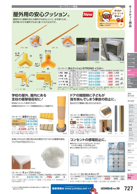 セーフティー用品学習ペーパークラフト・素材イベント用品学習支援用品保育安全・安心OA・サプライ用品文具・事務用品日用品運動・動・屋外遊具外室内遊具内乳幼児幼児おもちゃごっここあそびそままごととブロック・積み木み木電車車知育育玩具具カードドあそびそパズルズ造形あそび・造形あそび・工作作書籍・CD・DVDVプレゼントト乳幼児乳幼児用品品備品備品セーフティ―用品セーフティー用品屋外用の安心クッション。屋根がなく直陽のあたる場所でも劣化しにくく、水を弾くため、雨が降りかかる場所でも水に浸っても大丈夫です。LOOK!子どもの安全・安心を守ろう!次のページからも安全・安心を掲載しております。L字型極細L字型細使用例使用例コーナー用みつあしコーナー用極細コーナー用細学校の屋外、屋内にある支柱の衝撃吸収材に!●自由にカットして使用できます。●複雑な形状のコーナーの衝撃吸収材として最適です。[カーボーイ]安心クッションSTRONGイエロー商品種別M価税抜¥1,100お申込番号税抜価格税込価格単位寸法/18幅)×900(奥)×15(高)×4(厚)mm、質量/110g、型式/M-AC187寸法/24幅)×900(奥)×15(高)×6(厚)mm、質量/240g、型式/M-AC188寸法/13(幅)×10(高)×3厚)×25(あし長)mm、質量/3g、型式/ACSP-01寸法/18幅)×37奥)×15(高)×4(厚)mm、質量/7g、型式/ACSP-06寸法/24幅)×50奥)×22(高)×6(厚)mm、質量/22g、型式/ACSP-11L字型極細L字型細コーナー用みつあしコーナー用極細コーナー用細●材質/本体:PVC、粘着テープ:アクリル系(強粘着)●入り数/1本(L字型極細・細)、4個(コーナー用みつあし)、2個(コーナー用極細・細)●包装数:1/30L字型)、1/60(コーナー用)¥990¥1,089¥1,100¥1,210¥605¥605¥4958-614-23658-614-23668-614-23678-614-23688-614-2369¥550¥550¥450オープン¥1,2001本1袋1袋(4個入)(2個入)ドアの開閉時に子どもが指を挟んでしまう事故の防止に。貼るだけで簡単に取り付けられます。[カーボーイ]波型クッション商品種別イエローベージュお申込番号8-618-00968-618-1693イエロー白茶[カーボーイ]ゆびストッパー商品種別型式/BS43型式/BS44お申込番号8-618-17858-618-1786税抜価格¥2,520M価税抜オープン●寸法/600(幅)×900(長)×9(厚)mm●材質/EVA樹脂●質量/460g●包装数:1/10税込価格¥2,772単位1枚ベージュ使用例非常にやわらかく弾力性のある素材でぶつかりの衝撃を吸収。クリアなので目立ちにくい。単位税込価格税抜価格¥1,260¥1,386M価税抜¥1,400●寸法/215(幅)×15(奥)×400(長)mm●質量/240g●材質/軟質PVC●専用両面テープ付●包装数:1/20(2本入)1セット使用例白茶コンセントの感電防止に。●使わないコンセント口をふさぎ、子どものいたずらや事故、ケガを予防します。●大人は簡単に取り外すことができます。29mm29mm21mm23mm使用例使用例チューブクッション[カーボーイ]商品種別型式/BS01お申込番号8-618-1784M価税抜¥850税抜価格¥765税込価格¥841単位1個●寸法/50幅)×5(奥)×1200長)mm●質量/170g●材質/PVC●専用両面テープ付属●包装数:1/60コンセントキャップ[カーボーイ]商品種別型式/BS60お申込番号M価税抜8-618-1787オープン税抜価格¥620税込価格¥682単位1セット(15個入)●寸法/29(幅)×21奥)×23(高)mm●質量/29g●材質/ABS●包装数:1/60※カタログに掲載の商品情報(仕様・価格・税率など)は変更になる場合がございます。最新情報はUCHIDASww.uchidas.netwへ!Vol.20727