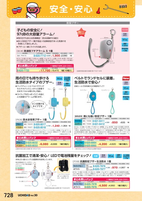 抗菌防滴IPX385dB連続20分コイン型電池(CR2032)×1個[アスカ]抗菌防犯ブザー生活防水1個商品種別お申込番号M価税抜税抜価格税込価格単位型式/GE071ABN型式/8-620-7976GE071AWN8-620-7977ライトブルーホワイト●寸法/35幅)×24(奥)×45高)mm●質量/27g●アラーム音量/85dB●連続再生時間/20分●紐の長さ/100mm●電池タイプ/コイン型リチウム電池×1個(CR2032または同規格のもの)●付属品/テスト用電池(コイン型リチウム電池×1個)、名札シート●包装数:1/10¥970¥1,067¥1,3001個商品種別まとめ買いパックライトブルーホワイト8-620-79788-620-7979お申込番号※1組単位申込。税抜価格税込価格単位¥4,500¥4,9501組(5個入)安全・安心防犯ブザーライト付防滴IPX597dB連続120分単四乾電池×2個83mmライトスイッチ50mm子どもの安全に!97dBの大容量アラーム!●雨の日でも安心な防滴構造!(防水試験IPX5適合)●多くの防犯ブザー(電子部品)の故障原因であった雨濡れを防滴にして強化しました。●ブザーと一緒にライトが点滅します。[ヨシオ]防滴型プチアラームS1個商品種別型式/PAW-35お申込番号M価税抜税抜価格税込価格8-620-7712¥2,300¥1,900¥2,090LEDライト(白)単位1個●寸法/50幅)×83奥)×14(厚)mm●質量/61g●アラーム音量/97dB●材質/本体:ABS●防水試験IPX5適合●電池タイプ/単四乾電池×2個●紐の長さ/200mm(二つ折り)●付属品/テスト用電池(単四乾電池×2個)●連続再生時間/120分●包装数:1/150まとめ買いパック8-620-7733お申込番号※1組単位申込。税抜価格税込価格¥17,700¥19,470単位1組(10個入)全国防犯協会連合会推奨第17H211※号防滴IPX595dB連続66分単四乾電池×2個ベルトでランドセルに装着。生活防水で安心!反射シールで対向車からの視認性アップ!ライトブルーミントグリーン40mm70mm[銀鳥産業]雨にも強い防犯ブザー1個商品種別お申込番号M価税抜税抜価格税込価格単位型式/193005型式/1930048-621-64118-621-6412ライトブルーミントグリーン●寸法/40(幅)×35(奥)×70(高)mm●質量/61g●材質/本体:ABS樹脂、金具:鉄、反射シール:PVC、ランドセルベルト・ストラップ:ポリエステル●音量/95dB(前方1mより測定)●連続再生時間/66分●電池タイプ/単四乾電池×2個●付属品/テスト電池(単四乾電池×2個)●防水機能/生活防水IPX5●防犯ブザースイッチ/ブザーピン●ストラップ/ナスカン付きストラップ●反射シール/広角高輝度反射材●包装数:1/6¥850¥935¥1,2001個雨の日でも持ち歩ける生活防水タイプのブザー。●フックチェーンとベルトでランドセルやカバンにしっかりと装着できます(ベルトは取り外し可能)。ブルーイエロー90dB防滴IPX3アルカリ電池単四乾電池×2個連続120分[デビカ]防水非常用ブザー1個商品種別お申込番号M価税抜税抜価格税込価格単位型式/7035708-620-80178-620-8018ブルーイエロー●寸法/42幅)×30奥)×67高)mm(ストラップ・チェーン・ベルト除く)●質量/57g●アラーム音量/90dB●連続再生時間/120分●紐の長さ/150mm●電池タイプ/単四アルカリ電池×2個●付属品/ベルト●生活防水(IPX3)●包装数:1/5※電池は別売です。¥1,240¥1,364型式/703571¥1,7001個42mm67mmピンは抜けるタイプです。使用例●ストラップを引っぱってピンを抜くと大音量のアラームが鳴ります。商品種別まとめ買いパックブルーイエロー8-620-80328-620-8033お申込番号※1組単位申込。税抜価格税込価格単位¥6,080¥6,6881組(5個入)商品種別まとめ買いパック8-620-8064ライトブルーミントグリーン8-620-8065お申込番号※1組単位申込。税抜価格税込価格単位¥4,200¥4,6201組(5個入)全国防犯協会連合会推奨第19R247※号一般社団法人日本文化用品安全試験所検査済抗菌加工で清潔・安心!LEDで電池残量をチェック!ベルトでランドセルの肩ベルトに固定できます。※取り外し可ベルト35mmホワイト全国防犯協会連合会推奨第17H203※号45mm電池残量確認ボタン引っ張りリングライトブルー728Vol.20本体と引っ張りリングに抗菌素材を採用しています。電池残量確認ボタンを押すと、LEDライトの色で電池残量がわかります。緑:電池残量あり赤:電池残量なしLEDライト(※照明用ではありません。)