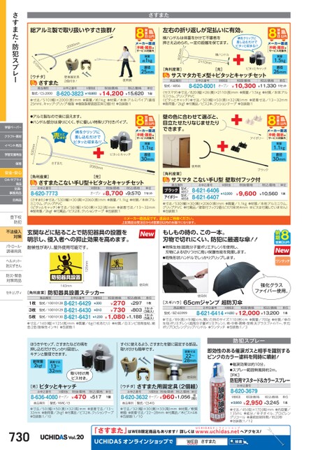 沖縄・離島はサービス対象外質量1.5kg直径26mm[角利産業]サスマタカモメ型+ピタッとキャッチセット[光]ピタッとキャッチ商品種別型式/4856お申込番号8-620-8001M価税抜オープン税抜価格税込価格¥10,300¥11,330単位1セット〈サスマタ〉●寸法/820幅)×26(奥)×2110長)mm●質量/1.5kg●材質/本体:アルミニウム、グリップ:PVC〈ピタッとキャッチ〉●寸法/50(幅)×50(奧)×32(高)mm●装着寸法/13〜32mm●耐荷重/2kgf●付属品/ビス2本、クッションテープ●包装数:1左右の折り返しが足払いに有効。横ハンドルは体重をかけて不審者を押さえ込められ、一定の距離を保てます。柄をクリップに差し込むだけでピタッと収まる!!横ハンドル2110mm820mmさすまた壁の色に合わせて選ぶと、目立たせたりなじませたりできます。使用例[角利産業]アイボリー沖縄・離島はサービス対象外質量1.1kg直径30mmブラックmm0002壁面固定具2個付き!使用例沖縄・離島はサービス対象外質量約1kg直径25mmお申込番号M価税抜税抜価格8-620-3823¥18,900¥14,200¥15,620税込価格単位1台●寸法/510(幅)×2000(長)mm●質量/約1kg●材質/本体:アルミパイプ(直径25mm)、キャップ・グリップ:樹脂●樹脂製壁面固定具(2個)付●包装数:1●アルミ製なので楽に扱えます。●ハンドル部分は滑りにくく、手に優しい特殊リブ付きパイプ。柄をクリップに差し込むだけでピタッと収まる!!さすまた2060mm沖縄・離島はサービス対象外質量1.1kg直径30mmピタッとキャッチ530mm[ウチダ]さすまた商品種別型式/CS-2000510mm総アルミ製で取り扱いやすさ抜群![角利産業]お申込番号8-620-7773さすまたこない手U型+ピタッとキャッチセット[光]M価税抜オープン税抜価格¥8,700税込価格¥9,570単位1セット〈さすまた〉●寸法/530(幅)×30(奥)×2060長)mm●質量/1.1kg●材質/本体:アルミニウム、グリップ:PVC〈ピタッとキャッチ〉●寸法/50(幅)×50(奧)×32(高)mm●装着寸法/13〜32mm●耐荷重/2kgf●付属品/ビス2本、クッションテープ●包装数:1サスマタこない手U型壁取付フック付商品種別お申込番号M価税抜税抜価格税込価格単位型式/4857型式/48588-621-64068-621-6407ブラックアイボリー●寸法/530(幅)×30(奥)×2060長)mm●質量/1.1kg●材質/本体:アルミニウム、グリップ:PVC●付属品/壁取付フック2個(ビス穴径:約4mm※ビスは付属していません)●包装数:1¥9,600¥10,560¥12,0001本※メーカー直送品です。返品はご容赦ください。上記商品は受注日から8営業日以内のお届けになります。もしもの時の、この一本。刃物で切れにくい、防犯に最適な傘!!●特殊生地(超高分子量ポリエチレン)を使用し、刃物による切りつけに高い保護性能を発揮します。●特殊形状ハンドルでしっかりグリップします。ワンタッチ強化グラスファイバー使用。使用例65cmジャンプ超防刃傘[スギハラ]商品種別型式/BZ-65999お申込番号M価税抜税抜価格8-621-6414¥14,800¥12,000¥13,200税込価格単位1本●寸法/89(長)×9(幅)cm、開いた時のサイズ:110(径)cm●質量/700g●材質/傘の生地:ポリエチレン(超高分子量ポリエチレン)、骨・中骨・親骨・受骨:太グラスファイバー、手元:ポリプロピレングリップハンドル●ワンタッチ●包装数:1/3140mm使用例125mm玄関などに貼ることで防犯器具の設置を明示し、侵入者への抑止効果を高めます。耐候性があり、屋外使用可能です。[角利産業]防犯器具設置ステッカー商品種別税抜価格お申込番号M価税抜¥300型式/100101288-621-6429型式/100101298-621-6430型式/100101308-621-64311枚3枚5枚(5枚入)●寸法/140(幅)×125(高)mm●質量/6g(1枚あたり)●材質/白エンビ溶剤強粘、刷色:2色(耐候性インキ)●包装数:1税込価格¥297¥803¥1,080¥1,188¥270¥730(3枚入)単位1枚¥1,2001セット1セット¥810さすまた・防犯スプレー学習ペーパークラフト・素材イベント用品学習支援用品保育安全・安心OA・サプライ用品文具・事務用品日用品登下校登下校防犯防犯不法侵入対策パトロール・パトロール・誘導用具誘導用具ヘルメット・防災ずきん防災・緊急対策用品対策用セキュリティほうきやモップ、さすまたなどの柄を押し込むだけでしっかり固定し、キチンと整理できます。耐荷重2kgf装着寸法13〜32mm取り付け用ビス付き。すぐに使えるよう、さすまたを壁に固定する部品。取り付けも簡単です。装着寸法22〜28mm使用例[光]ピタッとキャッチお申込番号M価税抜8-636-4080オープン税抜価格¥470税込価格¥517単位1個[ウチダ]さすまた用固定具(2個組)お申込番号M価税抜税抜価格税込価格8-620-3632オープン¥960¥1,056単位1袋(2個入)商品種別型式/KMC-13商品種別型式/CS-KG防犯スプレー即効性のある催涙ガスと相手を識別するピンクのカラー塗料を同時に噴射!●催涙効果は約10分。●スプレー範囲無風時約2m。[FK]防犯用マスタード&カラースプレーお申込番号8-620-3679M価税抜税抜価格税込価格¥3,950¥2,950¥3,245単位1本●寸法/50(幅)×50(奧)×32(高)mm●装着寸法/13〜32mm●耐荷重/2kgf●付属品/ビス2本、クッションテープ●包装数:1/10●寸法/32(幅)×30奥)×33(高)mm●材質/軟質樹脂●装着寸法/22〜28mm●付属品/木ビス×4本●包装数:1/10●寸法/45(径)×170(高)mm●内容量/135mL●成分/辛子オイル、プロピレングリ
