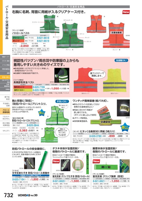 右胸に名刺、背面に用紙が入るクリアケース付き。パトロール・交通安全用品クリアケース裏IDフォルダー付表[サンエス技研]パトロールベスト商品種別グリーンオレンジ型式/TY-32G型式/TY-32Rお申込番号8-621-66188-621-6619面ファスナー税抜価格税込価格¥3,135¥2,850M価税抜オープン●寸法/600(着丈)×640身幅)mm●質量/245g●材質/ポリエステル、ラッセル織りメッシュ生地、周囲反射バイアス付、反射材:50mm幅(プリズム)●包装数:1※洗濯機不可。濡れタオルを絞っての拭き取り対応となります。単位1枚ポケットチャックポケット使用例グリーン表オレンジ裏視認性バツグン!雨合羽や防寒服の上からも着用しやすい大きめのサイズです。●高視認規格(JIST8127クラス2)に準拠した、高視認性安全ベストです。●洗濯機での家庭洗濯が可能です。洗濯機OK!面ファスナーで開閉します。[ミドリ安全]高視認性安全ベスト商品種別お申込番号M価税抜蛍光オレンジ蛍光イエロー●フリーサイズ●寸法/640着丈)×1300(身幅)mmポリエステル、反射材:UE8110●包装数:1/108-620-77998-620-7800使用例税抜価格税込価格単位¥1,050¥1,050¥1,1551枚●質量/130g●材質/トリコット蛍光オレンジ蛍光イエロー胸と背面に「防犯」・「防犯パトロール」プリント入り。背中には透明ポケットが付いているので、学校名やPTAといった名称を入れることが可能です。手洗いOK!表:3ポケットあり![富士手袋工業]防犯パトロールベストプリント入商品種別型式/8167お申込番号8-620-3844M価税抜オープン税抜価格税込価格¥2,383¥2,621単位1枚裏●寸法/570(着丈)×800〜1400胴まわり)mm調整可能●質量/約190g●材質/反射テープ:PVC、メッシュ:ポリエステル100%●胸ポケット:95(幅)×115(高)×20(マチ)mm●胴ポケット:130(幅)×130(高)mm●包装数:1/10表背面には透明ポケットが付いてます。内寸:250(幅)×70(高)mmワンタッチ簡単装着(板バネ式)。●車などのライトを反射して光る!夜間の交通事故防止に!●用途に合わせて用紙が差し替えできる。(ポケットに差し込んで使用)●JPマーク取得品。●実用新案登録済。[ヨシオ]ピタッくる腕章90(用紙:3枚入り)商品種別型式/PK-WH9お申込番号8-620-3780M価税抜¥980税抜価格¥899使用例税込価格¥988単位1枚●寸法/ホルダー:410(長)×90(幅)mm、ピタッくる:400(長)×50幅)mm、用紙サイズ:142(長)×89(幅)mm●質量/55g●材質/ホルダー・反射材:PVC、リストバンド:鉄●包装数:1/100防犯パトロールの安全確保に。たすきの文字は「防犯パトロール実施中」になります。前面・背面の2カ所に文字が入っています。タスキ本体が全面反射!夜間のパトロールに最適です。安全ピンに比べて着脱が簡単なフィッシュクリップ・面ファスナー付き。腕章本体が全面反射!夜間のパトロールに最適です。安全ピンに比べて着脱が簡単なフィッシュクリップ・面ファスナー付き。パトロール・交通安全用品学習ペーパークラフト・素材イベント用品学習支援用品保育安全・安心OA・サプライ用品文具・事務用品日用品登下校登下校防犯防犯不法侵入不法侵対策対策パトロール・誘導用具ヘルメット・防災ずきん防災・緊急対策用品対策用セキュリティ夜反射[ナカネ]文字反射たすき防犯パトロール実施中在庫無次第終了商品お申込番号M価税抜8-620-7184オープン税抜価格税込価格¥1,800¥1,980単位1本商品種別型式/D1315●寸法/90(幅)×750(長)mm●質量/50g●材質/ターポリン●フリーサイズ●色/蛍光グリーン●裏面に滑り止め付き●包装数:1732Vol.20使用例フィッシュクリップ[サンエス技研]蛍光反射クリップたすき(防犯パトロール)[サンエス技研]蛍光反射クリップ腕章(防犯)お申込番号M価税抜税抜価格税込価格8-621-6620オープン¥1,500¥1,650単位1本お申込番号M価税抜税抜価格税込価格8-621-6621オープン¥1,050¥1,155単位1枚商品種別型式/TA-8A商品種別型式/WA-5B●寸法/90(幅)×1500(長)mm●質量/115g●材質/プリズム反射材●フリーサイズ●色/蛍光グリーン●包装数:1●寸法/90幅)×400長)mm●質量/35g●材質/プリズム反射材●色/蛍光グリーン●包装数:1使用例