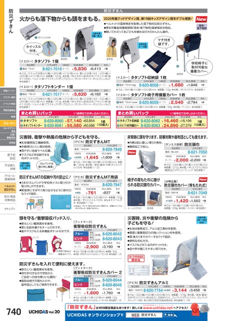 火からも落下物からも頭をまもる。●折りたたみ時ホイッスル付き。対象年齢5歳〜成人タタソフト1個[イエロー]商品種別型式/TS-01使用例●使用例お申込番号M価税抜税抜価格税込価格¥6,413単位1個¥5,8308-621-7016オープン●●寸法/たたんだ状態:62(幅)×289(奥)×210(高)mm、開いた状態:160〜220(幅)×289(奥)×412(高)mm●質量/420g●材質/防災ずきん部:防炎布(アキレス(株)製AT-1000)、ヘルメット部:プラスチック(ポリプロピレン、ポリカーボネート、ポリエチレンなど)●包装数:1[イエロー]商品種別タタソフトキンダー1個8-621-7017オープン●●寸法/たたんだ状態:62(幅)×289(奥)×210(高)mm、開いた状態:160〜220(幅)×289(奥)×262(高)mm●質量/372g●材質/防災ずきん部:防炎布(アキレス(株)製AT-1000)、ヘルメット部:プラスチック(ポリプロピレン、ポリカーボネート、ポリエチレンなど)●包装数:1¥5,620税込価格¥6,182型式/TSK-01お申込番号税抜価格単位1個M価税抜防災ずきん2025年度グッドデザイン賞、第19回キッズデザイン賞をダブル受賞!●ヘルメットの国家検定を取得した落下物対応防災ずきん。●厚生労働省保護帽規格「飛来・落下物用」国家検定合格品。●開いてかぶってあごひもを締めるだけのかんたん操作。飛来・落下物用マチ付き袋です。対象年齢2〜5歳❸●学校椅子に取付可能な備蓄カバー。●使用例[イエロー]商品種別タタソフト収納袋1枚お申込番号M価税抜税抜価格税込価格¥1,848単位1枚型式/TS-01-bag8-620-8058オープン●●寸法/265(幅)×5(奥)×325(高)mm●質量/22g●材質/ポリエステル●包装数:1[イエロー]商品種別タタソフト椅子用備蓄カバー1枚¥1,680型式/TS-01-cover●●寸法/430(幅)×10(奥)×350(高)mm●質量/90g●材質/ナイロン●包装数:18-620-8059オープン¥2,540税込価格¥2,794お申込番号税抜価格単位1枚M価税抜※1組単位申込。お申込番号税込価格¥16,460¥18,106¥24,890¥27,379単位1組(10枚入)お申込番号8-620-80628-620-8063商品種別タタソフト収納袋タタソフト椅子用備蓄カバー●●まとめ買いパック※1組単位申込。お申込番号税込価格¥57,140¥62,854¥55,080¥60,588単位1組(10個入)お申込番号8-620-80608-620-8061商品種別タタソフトタタソフトキンダー●●まとめ買いパック非常時に頭を守ります。防寒対策や座布団としても使えます。●内側は肌に優しい柔らか素材。●難燃加工で安心。[サンエス技研]防災頭巾商品種別型式/BS-233お申込番号8-621-7050税抜価格税込価格¥2,000¥2,200M価税抜オープン●寸法/340(幅)×30(奥)×430(高)mm●質量/277g●材質/ポリエステル300D単位1個(難燃加工)PVCコーティング●包装数:1椅子の背もたれに掛けられる防災頭巾カバー。[大明企画]防災頭巾カバー(背もたれ式)商品種別型式/90018お申込番号8-621-7049M価税抜税抜価格税込価格¥1,650¥1,420¥1,562単位1個ネームタグ付き使用例●寸法/360(幅)×10奥)×400高)mm●質量/200g●材質/ナイロン●包装数:1対象年齢小学1〜6年生(目安)災害時、炎や衝撃の危険から子どもを守る!●生地は耐熱加工、アルミ加工素材を使用。●頭部に衝撃吸収力の強いクッション材を使用。●肩・後えりまでカバーするワイド設計。●便利な名札付き。●マスクなどが入る内ポケット付き。●音や声が聞こえやすい耳穴付き。[デビカ]防災ずきんアルミ商品種別お申込番号M価税抜型式/1435158-620-7754¥4,200税抜価格¥3,144税込価格¥3,458単位1個●寸法/260(幅)×50(奥)×450(高)mm●質量/378g●材質/表地・裏地・芯材:ポリエステル(防炎加工)、反射材:PVC、ゴムバンド:ポリエステル、ゴムバンドストッパー:ABS●(公財)日本防炎協会認定品●包装数:1/40●燃えにくい難燃素材を使用。●持ち手付きなので学校からご自宅への持ち帰りにも便利!●普段は椅子の背もたれや、座布団としてもご使用できます。740ブルーVol.20「防災ずきん」はWEB限定商品もあります!詳しくはwUCHIDASUCHIDASオンラインショップで防災ww.uchidas.netへアクセス!災害時、衝撃や熱風の危険から子どもを守る。●生地:難燃加工繊維使用。●中綿:燃えにくい素材使用。●見やすい名前ラベル位置。●マスクなどを収納できる内ポケット付き。対象年齢小学1〜6年生(目安)ゴムバンドは取り外し簡単![デビカ]防災ずきんMT商品種別型式/143530お申込番号8-620-7945M価税抜¥2,200税抜価格¥1,645税込価格¥1,809単位1個●寸法/300(幅)×60(奥)×430(高)mm●質量/360g●材質/表地・裏地・中綿:ポリエステル100%●包装数:1/20防災ずきんMTの収納や汚れ防止に!●3本のゴムバンドで学校用イスに取り付け・取り外しができます。●緊急時にすばやく取り出せるように袋の口もワイド設計。[デビカ]防災ずきんMT用袋商品種別型式/143534M価税抜¥950税抜価格¥761お申込番号8-620-7947税込価格¥837単位1個●寸法/450(幅)×320(高)mm●質量/83g●材質/ポリエステル100%●なまえラベル付き●包装数:1/50※本品は、デビカ「防災ずきんMT」専用です。同様のサイズ以外のずきんは、収納できません。頭を守る!衝撃吸収パッド入り。●燃えにくい難燃素材を使用。●表に名前を書けるネーム付きです。●笛やマスクも入る多機能ポケット付きです。ピンクブルー※実際の製品は縫製済