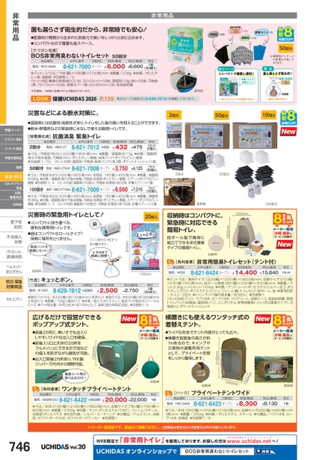 非常用品菌も漏らさず衛生的だから、非常時でも安心!●医療向け開発から生まれた防臭力で臭いをしっかりと封じ込めます。●コンパクトなので備蓄も省スペース。[クリロン化成]BOS非常用臭わないトイレセット50回分商品種別型式/BOS-0646お申込番号M価税抜8-621-7000オープン税抜価格¥6,000税込価格¥6,600(50組入)●パッケージ寸法/198(幅)×108(奥)×214(高)mm●質量/2.3kg●材質/ポリエチレン袋、凝固剤●包装数:1/4〈セット内容〉驚異の防臭袋BOS(白、35×50cm)×50枚、凝固剤(10g/袋)×50袋、汚物袋(黒、70×70cm)×50枚、便器カバー(青、65×80cm)×2枚、取扱説明書単位1箱50回分※凝固剤パッケージの変更を予定しております。※災害時、一時的に在庫がなくなる場合がございます。使用例保健UCHIDAS2026P.139臭わないゴミ袋BOS(8-638-3316)を掲載しております。災害などによる断水対策に。●凝固剤には抗菌性・消臭性があり、トイレをした後の臭いを抑えることができます。●断水・停電時などの緊急時に水なしで使える簡易トイレです。2回分50回分100回分[旭電機化成]抗菌消臭緊急トイレ商品種別お申込番号単位1セットM価税抜¥500税抜価格¥432税込価格¥475型式/ABO-278-621-7012型式/ABO-2750A2回分(2個入)●寸法/汚物袋(約45L)650(幅)×800(高)mm●質量/凝固剤:約7.5g●材質/凝固剤:高分子吸水樹脂、汚物袋(45L):ポリエチレン樹脂、結束バンド:ポリプロピレン樹脂●包装数:1/50〈セット内容〉凝固剤・汚物袋・結束バンド×各2個、ポケットティッシュ×1個1セット50回分(50個入)●寸法/汚物袋(約45L):650(幅)×800高)mm、処理袋:180(幅)×450高)mm●質量/凝固剤:約380g●材質/凝固剤:高分子吸水樹脂、汚物袋・処理袋:ポリエチレン樹脂、スプーン:ポリプロピレン樹脂●包装数:1/4〈セット内容〉凝固剤×50回分、汚物袋・処理袋×各50枚、計量スプーン×1個100回分(100個入)●寸法/汚物袋(約45L):650(幅)×800高)mm、処理袋:180(幅)×450高)mm●質量/凝固剤:約380g●材質/凝固剤:高分子吸水樹脂、汚物袋・処理袋:ポリエチレン樹脂、スプーン:ポリプロピレン樹脂●包装数:1/3〈セット内容〉凝固剤×100回分、汚物袋・処理袋×各100枚、計量スプーン×2個型式/ABO-27100A8-621-7009オープン8-621-7008オープン¥3,750¥6,560¥7,216¥4,1251セット2回分50回分使用例100回分1200mm沖縄・離島はサービス対象外1800mm収納時はコンパクトに、緊急時に対応できる簡易トイレ。段ボール製で簡単に組立てできる洋式便座タイプの簡易トイレ。収納時[角利産業]商品種別型式/4958非常用簡易トイレセット(テント付)お申込番号M価税抜8-621-6424オープン税抜価格¥14,400税込価格¥15,840単位1セット●テント寸法/使用サイズ:1200(幅)×1200奥)×1800高)mm、収納サイズ:570(幅)×570(奥)×55(高)mm、段ボール便座:385(幅)×330奥)×355(高)mm●質量/テント:2.2kg、トイレセット:1.65kg●材質/テント・シート:ポリエステルシルバー加工・ポリエチレンクロス・ポリエステルメッシュ、フレーム:鋼、トイレセット:段ボール、他●使用目安/大人2〜3日分●トイレパック1個の吸水量/約500cc●包装数:1〈セット内容〉テント、ペグ×8本、ロープ×4本、フロアシート、収納ケース、取扱説明書、緊急トイレパック(排便袋、凝固剤)×12、ユニポンチョ、非常用簡易トイレ(洋式便座タイプ)、汚物袋×2、ポケットティッシュ×420枚入120mm200mmミシン目から1枚ずつ切り離せます。ヒモ付きで簡単に密閉!袋●コンパクトに持ち運べる、便利な携帯用トイレです。●袋はコンパクトなロールタイプ!保管に場所をとりません。吸収パッドを底面にセット!使用例災害時の緊急用トイレとして![竹虎]キュッとポン®商品種別型式/81382お申込番号8-620-7812M価税抜¥2,800税抜価格¥2,500税込価格¥2,750(20枚入)●吸収パッド寸法/約240幅)×約130(縦)mm(1枚あたり)●袋の寸法/約650幅)×約380縦)mm(1枚あたり)●質量/700g1箱あたり)●材質/袋・ヒモ:ポリエチレン、吸収パッド:吸収ポリマー・セルローズ●パッド吸水量/約450mL※1回150mLとして、排尿3回分を吸収(目安)●包装数:1/6単位1箱非常用品学習ペーパークラフト・素材イベント用品学習支援用品保育安全・安心OA・サプライ用品文具・事務用品日用品登下校登下校防犯防犯不法侵入不法侵対策対策パトロール・パトロール・誘導用具誘導用具ヘルメット・防災ずきん防災・緊急対策用品対策用セキュリティ沖縄・離島はサービス対象外使用例税込価格¥9,130単位1台横置きにも使えるワンタッチ式の着替えテント。2100mm●ワイドな形状でテント内部がとっても広々。●横置き設営後の高さが約1mあるので、キャンプや災害時の避難所用テントとして、プライベート空間をしっかり確保します。沖縄・離島はサービス対象外mm0501収納時1050mm[ハック]商品種別型式/HAC3468プライベートテントワイドお申込番号M価税抜8-621-6423オープン税抜価格¥8,300収納時単位1台2100mm電源コード用の取り込み口付!2100mm広げるだけで設営ができるポップアップ式テント。1800mm●前後2カ所に、車いすでも出入りしやすいワイドな出入口を確保。●前後入り口と天井の3カ所をフルメッシュにできるので虫などの侵入を防
