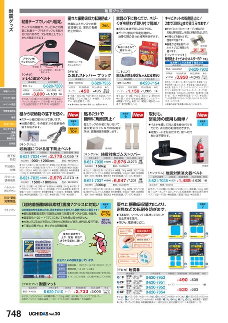 長さははさみで簡単カット。接着剤など不要。差し込むだけ![デビカ]たおれストッパーブラック[ニトムズ]家具転倒防止安定板ふんばる君90商品種別型式/703835お申込番号8-620-7955商品種別型式/M5880お申込番号8-620-7154単位税抜価格¥450税込価格¥495M価税抜オープン●寸法/100(幅)×69(奥)×14.5(高)mm●質量/72g(2個入)●材質/エラストマー●包装数:1/10※家具の後ろに壁が無い場所では、使用できません。(2個入)1セット単位1本税込価格税抜価格¥1,150¥1,265M価税抜オープン●寸法/44(幅)×900(長)×10(厚)mm●材質/非移行性合成樹脂エラストマー●質量/290g●取り付け範囲/幅900mmまで●包装数:1/40キャビネットの転倒防止に!2本で300kgまで支えられます!●キャビネット・ロッカー・オープン棚などの天板と壁を固定し、転倒と移動を防止します。●什器などを動かさずに固定が可能です。●接着方法は接着パッドと木ネジの2種類から選べます。使用例[リンテック21]転倒防止キャビネットホルダーBP1本入在庫無次第終了商品お申込番号商品種別型式/LH-801BP8-620-7902単位1セットM価税抜¥3,950税抜価格税込価格¥3,950¥4,345(1本入)●寸法/113(幅)×106(奥)×15(高)mm●質量/65g●壁間隔/最大100mm●耐震度/震度6強相当●材質/樹脂ベース:ポリカーボネートアロイ、ベルト:ポリプロピレン●対応什器/キャビネット、ロッカー、オープン棚●対象物重量/300kg以下(2本使用時)●設置目安/対象物1台につき2本●使用環境温度/0〜40℃●包装数:1〈セット内容〉接着パッド付きベース×2個、ベルト×1本、木ネジ×2本、アルコールパッド×1枚※壁面の状態で耐荷重が変わることがあります。耐震グッズ粘着テープでしっかり固定。テーブルの棚板や、テレビなどの機器に粘着テープ付きバックルを貼り付けられるので、ズレを防止してしっかりと固定できます。優れた振動吸収力転倒防止!地震によるタンスや本棚・食器棚など、家具の転倒防止対策に。2個入家具の下に敷くだけ、ネジ・くぎを使わず取り付け簡単!●長尺には継ぎ足し対応でOK。●ガッチリ家具の安定を確保し、地震の際の思わぬ被害を防ぎます。耐震グッズブラウン管テレビもOK。使用例※テレビと棚板を一緒に巻いて固定します。[ウチダ]テレビ固定ベルト商品種別型式/B-2お申込番号8-620-7203M価税抜¥4,000税抜価格税込価格¥3,800¥4,180単位1本●寸法/40(幅)mm×4長)m●付属品/バックル(粘着テープ付)4個●1本でテレビ1台固定可能(たすきがけ)●包装数:1棚から収納物の落下を防ぐ。●スチール棚に取り付けて使います。●地震の際に、その揺れから収納物の落下を防ぎます。使用例貼るだけで簡単に転倒防止!壁とラックの天板に貼り付けて、震災時のラックなどの転倒を防ぎ、避難経路を確保します。耐震度6耐震度6耐用年数10年取付も、緊急時の使用も簡単!●ベルトを通して消火器を巻き付けるだけで、消火器の転倒を防ぎます。●粘着シートを貼るだけで、壁への穴あけは不要です。耐震度7[キングジム]収納棚につける落下防止ベルトお申込番号M価税抜税抜価格税込価格8-621-7034¥2,800¥2,778¥3,055単位1本商品種別900〜1200mm型式/RB1200N●寸法/52(幅)×12(奥)×49長)mm●質量/86g●材質/ポリプロピレン、ポリカーボネート、ABS樹脂、等方性マグネット、アクリル系接着剤●取付可能幅/900〜1200mm●取付方法/粘着パッド●耐震度/震度6相当●対象物重量/100㎏/本●使用温度範囲/0℃〜40℃●耐用年数/10年●包装数:18-621-7035¥3,000¥2,976¥3,2731本商品種別1500〜1800mm型式/RB1800N●寸法/52(幅)×16.2奥)×47.6(長)mm●質量/167g●材質/ポリプロピレン、ポリカーボネート、ABS樹脂、アクリル系接着剤●取付可能幅/1500〜1800mm●対象物重量/100㎏/本●耐震度/震度6相当●使用温度範囲/0℃〜40℃●耐用年数/10年●包装数:1使用例[キングジム]地震対策ゴムストッパーお申込番号M価税抜税抜価格税込価格8-621-7036¥3,000¥2,976¥3,273単位1組(2本)商品種別160kg型式/GS160-W●寸法/110(幅)×25(奥)×260高)mm●質量/141g●材質/ABSアロイ樹脂、NBR+PVCゴム、アクリル系接着剤●対象物重量/160㎏以下●壁、対象物間隔/最大100mm●耐震度/震度6相当●使用環境温度/0℃〜40℃●包装数:11組8-621-7037¥6,600¥6,547¥7,201(2本)商品種別300kg型式/GS300-W使用例[キングジム]お申込番号地震対策消火器ベルトM価税抜税抜価格税込価格8-621-7038¥1,500¥1,488¥1,636単位1個商品種別型式/SH610●寸法/120(幅)×25(奥)×290高)mm●質量/182g●材質/ABSアロイ樹脂、NBR+PVCゴム、アクリル系接着剤●対象物重量/300㎏以下●壁、対象物間隔/最大100mm●耐震度/震度6相当●使用環境温度/0℃〜40℃●包装数:1●寸法/550(幅)×8奥)×75(高)mm●質量/62g●材質/スチール、ナイロン、アクリル系接着剤●対応消火器サイズ/6型〜10型●耐震度/震度7相当●包装数:1優れた振動吸収能力により、家具などの転倒を防ぎます。耐震度7●日本製で、シックハウス基準に対応した安全素材を使用。●花びん、電話機などに。❶1P❸4P❷2P●6Pお申込番号8-620-79538-620-79518-620-79528-620-7954M価税抜税抜価格税込価格単位オープン¥490¥539¥530¥5831個商品種別耐荷重/36kg1枚)、型式/703831耐荷重/32k