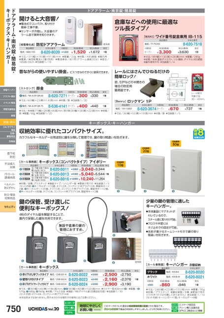 開けると大音響!●電池式でコンパクト、取り付け簡単・工事不要。●センサーが作動し、大音量のアラーム音で異常を知らせます。ドアアラーム・南京錠・簡易錠倉庫などへの使用に最適なツル長タイプ![旭電機化成]防犯ドアアラーム商品種別型式/ABA-105お申込番号8-620-8039M価税抜¥1,600税抜価格¥1,520税込価格¥1,672使用例単位1個●寸法/37(幅)×19(奥)×91(高)mm●質量/24g●材質/ABS樹脂●屋内用●電源/単四乾電池×2個(別売)●電池寿命/約1年(アラーム連続30分)●音圧/100dB/30cm●包装数:1/10昔ながらの使いやすい掛金。ビスつきなのですぐに使用できます。[ストロング]掛金商品種別型式/NK-A-SP-GR-60●●寸法/60(幅)×23(奥)×1.4高)mm●材質/鉄●包装数:1/308-620-7271オープン¥300お申込番号M価税抜税抜価格税込価格¥330単位1個型式/NK-A-SP-GR-75●●寸法/本体側:77(幅)×28奥)×8(高)mm、受け側:28(幅)×28(奥)×22(高)mm●材質/鉄●質量/60g●包装数:1/208-636-4141オープン¥400¥4401個[WAKI]ワイド番号錠倉庫用IB-115商品種別型式/7175355お申込番号8-620-7518税抜価格¥3,300M価税抜オープン●寸法/88(幅)×130(長)×28(奥)mm●質量/280g●材質/本体:亜鉛ダイカスト、ツル:鋼鉄、ダイヤル:ABS樹脂●屋外使用不可●包装数:1/4税込価格¥3,630単位1個レールにはさんでひねるだけの簡単ロック!窓、引戸などの半開きの場合の防犯用簡易錠です。11192945[Benry]ロックマン1P商品種別型式/19113001お申込番号M価税抜8-620-3674オープン3655税抜価格¥670●寸法/36(幅)×55(奥)×19(高)mm●材質/鉄●包装数:1/5レール取付可能寸法:30〜43mm。税込価格¥737単位1個収納効率に優れたコンパクトサイズ。カラフルなキーホルダーは用途別に鍵を分類して管理でき、鍵の取り間違いを防ぎます。キーボックス・キーハンガー収納鍵数80個収納鍵数20個収納鍵数10個●●●少量の鍵の管理に適したキーハンガー。●本体裏面にマグネットが付いているので、スチール面に取り付け可能。●クロスや木壁にはネジ止めでの固定が可能。●名前が書けるネームシート付きで鍵の取り間違いを防ぎます。お申込番号M価税抜税抜価格税込価格単位1個10個収納20個収納80個収納寸法/179(幅)×50奥)×173高)mm、質量/626g、型式/CKB-C10-I寸法/170(幅)×58奥)×250高)mm、質量/1kg、型式/CKB-C20-I寸法/225(幅)×80奥)×310高)mm、質量/2.kg、型式/CKB-80-I¥3,800¥3,040¥3,3448-620-8011¥6,300¥5,040¥5,5448-620-80138-620-8016¥12,800¥10,240¥11,264●●●材質/金属、プラスチック●施錠タイプ/シリンダー錠●壁掛け用穴付●包装数:1/5〈セット内容〉❸キーホルダー×10個、ネジ×3本、コンクリート用プラグ×3本、開錠用キー×2個、❹キーホルダー×20個、ネジ×3本、コンクリート用プラグ×3本、開錠用キー×2個、❺キーホルダー×80個、ネジ×3本、コンクリート用プラグ×3本、開錠用キー×2個●商品種別[カール事務器]キーボックス(コンパクトタイプ)アイボリー●●●使用例単位1個[カール事務器]キーハンガー8個収納ブラックホワイトM価税抜¥950商品種別型式/KH-8-K型式/KH-8-Wお申込番号8-620-80208-620-8021税抜価格¥860税込価格¥946単位1個お申込番号8-620-80228-620-80238-620-8024M価税抜¥3,000¥2,400¥3,500税抜価格¥2,500¥2,160¥2,900税込価格¥2,750¥2,376¥3,190型式/CKB-S01-K型式/CKB-S02-K型式/CKB-S03-K吊り下げU字フックタイプ壁取り付けタイプ吊り下げワイヤーフックタイプ❻❼●[カール事務器]キーボックス商品種別●寸法/❻:90(幅)×40(奥)×186(高)mm、❼❽:90(幅)×40(奥)×120高)mm●ワイヤー長400mm(❽)●質量/❻:570g、❼:480g、❽:560g●材質/アルミ合金●施錠/4桁ダイヤル錠(任意設定可能)●包装数:1/30〈セット内容〉ネジ×4本、コンクリート用プラグ×4本※完全防水ではありません。雨や水のかかる場所での使用にはご注意ください。●寸法/248(幅)×23(奥)×103(高)mm●質量/95g●材質/プラスチック●鍵収納数/8個●壁掛け用ネジ穴付き(ネジは付属しておりません)●包装数:1/10〈セット内容〉キーハンガー×1個、キーホルダー×8個750Vol.20地球にやさしくお買い物このマークのついた商品は地球環境保護に配慮された商品です。グリーンの文字で商品の判別をしやすくしました。どうぞご利用ください。エコマーク認定品グリーン購入法適合品GPNエコ商品ねっと掲載鍵の保管、受け渡しに便利なキーボックス!4桁のダイヤル錠を解錠することで、庫内で保管した鍵を共用できます。施設や倉庫の鍵の管理におすすめ。●●●●●ドアアラーム・南京錠・簡易錠・キーボックス・キーハンガー学習ペーパークラフト・素材イベント用品学習支援用品保育安全・安心OA・サプライ用品文具・事務用品日用品登下校登下校防犯防犯不法侵入不法侵対策対策パトロール・パトロール・誘導用具誘導用具ヘルメット・防災ずきん防災・緊急対策用品対策用セキュリティ