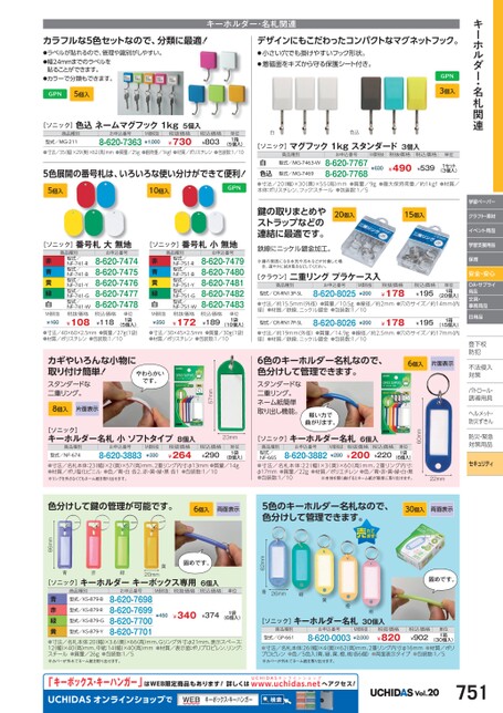 キーホルダー・名札関連学習ペーパークラフト・素材イベント用品学習支援用品保育安全・安心OA・サプライ用品文具・事務用品日用品登下校下防犯犯不法侵入法対策策パトロール・パトロール・誘導用具誘導用具ヘルメット・防災ずきん防災・緊急対策用品策セキュリティキーホルダー・名札関連カラフルな5色セットなので、分類に最適!●ラベルが貼れるので、管理や識別がしやすい。●幅24mmまでのラベルを貼ることができます。●カラーで分類もできます。デザインにもこだわったコンパクトなマグネットフック。●小さい穴でも掛けやすいフック形状。●着磁面をキズから守る保護シート付き。5個入3個入白色込[ソニック]マグフック1kgスタンダード3個入商品種別お申込番号M価税抜税抜価格税込価格単位型式/MG-7463-W白色込●寸法/20(幅)×30(奥)×55(高)mm●質量/9g●最大保持荷重/約1kgf●材質/本体:ポリスチレン、フック:スチール●包装数:1/58-620-77678-620-7768¥490型式/MG-7469¥539(3個入)1セット¥63020個入15個入鍵の取りまとめやストラップなどの連結に最適です。鉄線にニッケル鍍金加工。※錆の原因になる水気や汚れなどが付着した場合、速やかに拭き取るなどしてください。[クラウン]二重リングプラケース入商品種別お申込番号8-620-8025M価税抜¥200税抜価格¥178型式/CR-RN13P-SL(20個入)●寸法/約15.5mm(外径)●質量/10.5g●線径/約2mm●穴のサイズ/約14mm(内径)●材質/鉄線、ニッケル鍍金●包装数:1/10税込価格¥195単位1箱型式/CR-RN17P-SL(15個入)●寸法/約19mm(外径)●質量/14.9g●線径/約2.5mm●穴のサイズ/約17mm(内径)●材質/鉄線、ニッケル鍍金●包装数:1/108-620-8026¥200¥178¥1951箱6個入片面表示6色のキーホルダー名札なので、色分けして管理できます。スタンダードな二重リング。ネーム紙簡単取り出し機能。軽い力で曲がります。22mm60mm[ソニック]キーホルダー名札6個入商品種別型式/NF-665お申込番号8-620-3882M価税抜¥280税抜価格¥200税込価格¥220(6個入)●寸法/名札本体:22(幅)×3(奥)×60(高)mm、2重リング内寸:φ17mm●質量/22g●材質/ポリエチレン●色/青・赤・黄・緑・白・黒●包装数:1/10※本体を軽く曲げるとネーム紙が簡単に取り出せます。単位1袋[ソニック]色込ネームマグフック1kg5個入商品種別型式/MG-211お申込番号8-620-7363M価税抜¥1,000税抜価格¥730税込価格¥803単位1箱(5個入)●寸法/35(幅)×29奥)×62(高)mm●質量/25g●耐荷重/1kgf●材質/ポリスチレン●包装数:1/105色展開の番号札は、いろいろな使い分けができて便利!5個入10個入[ソニック]番号札大無地[ソニック]番号札小無地商品種別赤青黄緑白M価税抜¥160型式/NF-741-R型式/NF-741-B型式/NF-741-Y型式/NF-741-G型式/NF-741-W税抜価格¥108お申込番号8-620-74748-620-74758-620-74768-620-74778-620-7478税込価格¥118単位1袋商品種別赤青黄緑白M価税抜¥250型式/NF-751-R型式/NF-751-B型式/NF-751-Y型式/NF-751-G型式/NF-751-W税抜価格¥172お申込番号8-620-74798-620-74808-620-74818-620-74828-620-7483税込価格¥189単位1袋(5個入)●寸法/40×60×2.5mm●質量/27g(1袋)●材質/ポリスチレン●包装数:1/10(10個入)●寸法/30×45×2.5mm●質量/30g1袋)●材質/ポリスチレン●包装数:1/1023mm税込価格¥290単位1袋(8個入)57mmカギやいろんな小物に取り付け簡単!スタンダードな二重リング。やわらかいです。8個入片面表示[ソニック]キーホルダー名札小ソフトタイプ8個入商品種別型式/NF-674お申込番号8-620-3883M価税抜¥330税抜価格¥264●寸法/名札本体:23幅)×2奥)×57高)mm、2重リング内寸:φ13mm●質量/14g●材質/ポリ塩化ビニル●色/青・白各2、赤・黄・緑・黒各1●包装数:1/10※リングを外さなくてもネーム紙を取り出せます。色分けして鍵の管理が可能です。6個入両面表示5色のキーホルダー名札なので、色分けして管理できます。30個入両面表示66mm青赤緑20mm[ソニック]キーホルダーキーボックス専用6個入商品種別型式/KS-879-Bお申込番号M価税抜税抜価格税込価格単位型式/KS-879-R型式/KS-879-G8-620-76988-620-76998-620-77008-620-7701青赤緑黄●寸法/名札本体:20幅)×3.6(奥)×66高)mm、Gリング外寸:φ21mm、表示スペース:12(幅)×40高)mm、中紙:14幅)×40(高)mm●材質/表示面:ポリプロピレン、リング:スチール●質量/26g●包装数:1/5※カバーが外れてネーム紙を取り出せます。¥340型式/KS-879-Y¥374(6個入)¥4501袋固めです。青26mm緑黄橙[ソニック]キーホルダー名札30個入桃商品種別型式/GP-661お申込番号8-620-0003M価税抜¥2,000税抜価格¥820税込価格¥902単位1箱(30個入)●寸法/名札本体:26(幅)×4(奥)×62(高)mm、2重リング内寸:φ16mm●材質/ポリプロピレン●色/5色入(青、緑、黄、橙、桃:各6個)●両面表示タイプ●包装数:1/5※カバーが外れてネーム紙を取り出せます。62mm黄固めです。「キーボックス・キーハンガー」はWEB限定商品もあります!詳しくはwUCHUCHIDASオンラインショップで・IDASww.uchidas.netへアクセス!Vol.20751