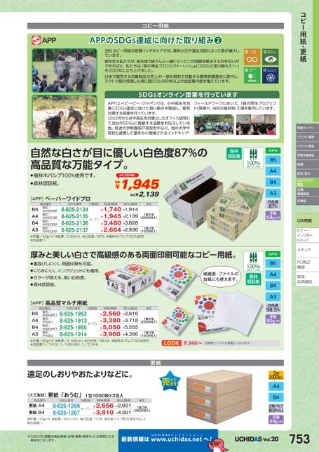 コピー用紙・更紙学習ペーパークラフト・素材イベント用品学習支援用品保育安全・安心OA・サプライ用品文具・事務用品日用品OA用紙トナー・トナー・インクカーインクカートリッジメディアィアPC周辺辺機器器家具・具・共用備品用コピー用紙APPのSDGs達成に向けた取り組み❷当社コピー用紙の故郷インドネシアでは、森林火災や違法伐採によって森が減少しています。紙を作る私たちが、紙を使う皆さんと一緒になってこの問題を解決するお手伝いができればと、私たちは「森の再生プロジェクト〜いっしょにSDGsに取り組もう!〜」を2020年に立ち上げました。日本で販売する対象製品の売上の一部を現地で活動する環境保護基金に寄付し、スマトラ島の荒廃した森に既に56,000本以上の自生種の苗を植えています。SDGsオンライン授業を行っていますAPP(エイピーピー)ジャパンでは、小中高生を対象にSDGs達成に向けた取り組みを解説し、意見交換する授業を行っています。2023年からは中高生を対象としたオフィス訪問にて当社のSDGsに貢献する活動をお伝えしている他、筑波大学附属坂戸高校を中心に、他の大学や高校と連携して夏休みに開催されるインドネシア・フィールドワークにおいて、「森の再生プロジェクト」現場や、当社の植林地・工場を案内しています。自然な白さが目に優しい白色度87%の高品質な万能タイプ。森林認証紙●植林木パルプ100%使用です。●森林認証紙。A4(2500枚)税抜¥1,945税込¥2,139単位[APP]ペーパーワイドプロM価税抜税込価格税抜価格お申込番号商品種別型式/WP004PEP型式/WP001PEP型式/WP003PEP型式/WP002PEPB5A4B4A3●坪量/68g/㎡●紙厚/0.09mm●白色度/87%●植林木パルプ100%使用●包装数:1¥1,740¥1,914¥1,945¥2,139¥3,480¥3,828¥2,664¥2,9308-625-21348-625-21358-625-21368-625-2137オープン1箱・5包(2500枚入)1箱・3包(1500枚入)厚みと美しい白さで高級感のある両面印刷可能なコピー用紙。成績表・ファイルの台紙にも使えます。森林認証紙LOOKP.946〜成績表ファイルを掲載しております。●裏抜けしにくく、両面印刷も可能。●にじみにくく、インクジェットにも適用。●カラーが映える、高い白色度。●森林認証紙。[APP]高品質マルチ用紙M価税抜税抜価格お申込番号商品種別型式/HQ004PET型式/PTK001型式/HQ003PET型式/PTK0028-625-19538-625-19138-625-19558-625-1914B5A4B4A3●坪量/80g/㎡●紙厚/0.106mm●白色度/98.5%●植林木パルプ100%使用●包装数:1/3(A3)、1/5(B5・B4)、1/22(A4)¥2,560¥3,380¥5,050¥3,960税込価格¥2,816¥3,718¥5,555¥4,356オープン単位1箱・5包(2500枚入)1箱・3包(1500枚入)遠足のしおりやおたよりなどに。更紙[大王製紙]更紙「おうむ」1包1000枚×3包入商品種別お申込番号M価税抜税抜価格8-625-1266オープン8-625-1267更紙A4更紙B4●坪量/49g/㎡●紙厚/約0.1mm●白色度/53%●古紙パルプ配合率80%以上●包装数:1¥2,656¥3,9101箱・3包(3000枚入)税込価格¥2,921¥4,301単位B5A4B4A3白色度87%坪量68g/㎡B5A4B4A3白色度98.5%坪量80g/㎡3包3000枚入A4B4古紙パルプ80%以上坪量49g/㎡※カタログに掲載の商品情報(仕様・価格・税率など)は変更になる場合がございます。最新情報はUCHIDASww.uchidas.netwへ!Vol.20753