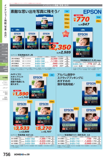 ※メーカー事情によりパッケージデザインが変更になることがあります。インクジェット用紙(写真・光沢)素敵な思い出を写真に残そう!L判400枚入100枚入50枚入20枚入税抜1袋(20枚入)¥770税込¥8472L判20枚入[エプソン]写真用紙光沢L判税抜L判400枚入¥2,350税込¥2,585商品種別お申込番号M価税抜税抜価格税込価格型式/KL100PSKR型式/KL400PSKRL判400枚入L判100枚入L判50枚入L判20枚入●寸法/L判サイズ(89×127mm)●坪量/255g/㎡●紙厚/0.27mm●白色度/92%●包装数:1/10(400枚入)、1/30(100枚入)、1/60(50枚入)、1/10020枚入)8-625-13468-625-13488-625-13498-625-1350¥2,350¥2,585¥1,120¥1,232¥940¥1,034¥570¥627型式/KL50PSKR型式/KL20PSKRオープン単位1袋1袋1袋1袋(400枚入)(100枚入)(50枚入)(20枚入)[エプソン]写真用紙光沢2L判20枚入8-625-1351オープン¥770¥847税抜価格税込価格お申込番号単位1袋M価税抜(20枚入)商品種別2L判型式/K2L20PSKR●寸法/2L判サイズ(127×178mm)●坪量/255g/㎡●紙厚/0.27mm●白色度/92%●包装数:1/50A4サイズに大きくプリントできるから、授業や発表にも使えます。20枚入A4アルバム保存やスクラップブッキングにおすすめの薄手写真用紙!A420枚入1袋(20枚入)税抜¥1,590税込¥1,74950枚入100枚入50枚入100枚入1袋(50枚入)税抜¥3,533税込¥3,8861袋(100枚入)税抜¥5,270税込¥5,797インクジェット用紙(写真・光沢)学習ペーパークラフト・素材イベント用品学習支援用品保育安全・安心OA・サプライ用品文具・事務用品日用品OA用紙トナー・トナー・インクカーインクカートリッジメディアメディPC周辺PC周辺機器機器家具・家具共用備品共用備[エプソン]写真用紙光沢A4商品種別お申込番号M価税抜税抜価格税込価格型式/KA420PSKR型式/KA450PSKR型式/8-625-13528-625-1353KA4100PSKR8-625-1354A420枚入A450枚入A4100枚入(100枚入)●坪量/255g/㎡●紙厚/0.27mm●白色度/92%●包装数:1/2020枚入・50枚入)、1/10(100枚入)¥1,590¥1,749¥3,533¥3,886¥5,270¥5,797(20枚入)(50枚入)オープン1袋1袋単位1袋756Vol.20[エプソン]写真用紙ライト〈薄手光沢〉A4型式/M価税抜商品種別お申込番号A420枚入A450枚入A4100枚入(100枚入)●坪量/200g/㎡●紙厚/0.2mm●白色度/92%●包装数:1/20(20枚入)、1/10KA420SLU8-625-1741KA450SLU8-625-1742KA4100SLU8-625-1743税込価格¥792¥1,600¥1,760¥2,660¥2,926¥720(50枚入)(20枚入)税抜価格オープン単位1袋型式/型式/1袋1袋(50枚入)、1/5100枚入)