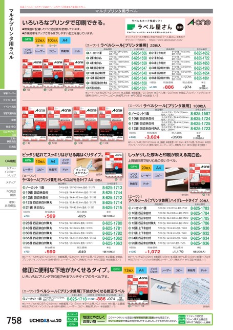 オリジナルラベルが簡単に作成できる「ラベル屋さん」を無料でダウンロードできます。https://www.labelyasan.com/ラベル寸法/297×210mm、型式/73301ラベル寸法/86.4×50.8mm、型式/31532ラベル寸法/86.4×42.3mm、型式/31504ラベル寸法/83.8×42.3mm、型式/288448-625-15878-625-17248-625-17258-625-1723税込価格¥3,986単位1袋(100枚入)ノーカット1面10面四辺余白付12面四辺余白付12面四辺余白付角丸●●●●M価税抜¥4,580税抜価格¥3,624[エーワン]ラベルシール[プリンタ兼用]商品種別100枚入お申込番号お申込番号8-625-16528-625-17228-625-16538-625-15638-625-16548-625-1861単位1袋(22枚入)商品種別ラベル寸法/70×38.1mm、型式/72321ラベル寸法/70×42.3mm、型式/72421ラベル寸法/70×33.9mm、型式/72324ラベル寸法/53.3×25.4mm、型式/72230ラベル寸法/48.3×25.4mm、型式/72244ラベル寸法/38.1×21.2mm、型式/7226521面上下余白付21面余白なし24面上下余白付30面四辺余白付・角丸44面四辺余白付65面四辺余白付・角丸●●●●●●M価税抜¥1,120税抜価格¥886税込価格¥974お申込番号8-625-15868-625-15588-625-15598-625-16478-625-16488-625-16498-625-16508-625-1651ラベル寸法/297×210mm、型式/72301ラベル寸法/148.5×210mm、型式/72202ラベル寸法/148.5×105mm、型式/72204ラベル寸法/97×69mm、型式/72208ラベル寸法/86.4×50.8mm、型式/72210ラベル寸法/86.4×42.3mm、型式/72212ラベル寸法/83.8×42.3mm、型式/72312ラベル寸法/42×74.25mm、型式/72220ノーカット1面2面余白なし4面余白なし8面四辺余白付10面四辺余白付12面四辺余白付12面四辺余白付・角丸20面余白なし●●●●●●●●商品種別[エーワン]ラベルシール[プリンタ兼用]22枚入●シート/A4判(297×210mm)●上質紙●総紙厚/0.13mm●ラベル厚/0.07mm●対応プリンタ/インクジェット(顔料/染料)、レーザー、コピー、熱転写、ドット●FSC認証●包装数:1/522枚入22枚入●〜●(●〜●)100枚入100枚入●〜●(●〜●)A4インクジェットレーザーコピー熱転写ドット❶1面●10面●21面※各ラベルシートのサイズは右ページのサイズ見本をご参照ください。マルチプリンタ用ラベルいろいろなプリンタで印刷できる。●環境面に配慮したFSC認証紙を使用しています。●作業効率をアップさせるはがしやすい加工を施しています。●1面●10面●12面●12面●シート/A4判(297×210mm)●上質紙●総紙厚/0.13mm●ラベル厚/0.07mm●対応プリンタ/インクジェット(顔料/染料)、レーザー、コピー、熱転写、ドット●FSC認証●包装数:1しっかりした厚みと印刷が映える高白色。上質紙採用で貼り心地の良いラベル。20枚入A4レーザーコピードットインクジェット熱転写[エーワン]ラベルシール[プリンタ兼用]ハイグレードタイプ20枚入使用例●1面お申込番号8-625-17838-625-17848-625-17858-625-17868-625-19308-625-19328-625-19348-625-1936商品種別ラベル寸法/210×297mm、型式/75301ラベル寸法/86.4×50.8mm、型式/75210ラベル寸法/86.4×42.3mm、型式/75212ラベル寸法/83.8×42.3mm、型式/75312ラベル寸法/70×42.3mm、型式/75318ラベル寸法/70×38.1mm、型式/75321ラベル寸法/66×33.9mm、型式/75224ラベル寸法/35×12mm、型式/75295ノーカット1面10面四辺余白付12面四辺余白付12面四辺余白付角丸18面上下余白付21面上下余白付24面四辺余白付95面四辺余白付角丸●●●●●●●●M価税抜¥1,340税抜価格¥1,072税込価格¥1,179単位1袋(20枚入)●1面お申込番号8-625-17138-625-17448-625-17128-625-17148-625-1715単位1袋(10枚入)8-625-17808-625-17818-625-17828-625-18628-625-1863単位1袋(10枚入)商品種別ラベル寸法/297×210mm、型式/31271ラベル寸法/86.4×50.8mm、型式/31283ラベル寸法/86.4×42.3mm、型式/31255ラベル寸法/83.8×42.3mm、型式/31275ラベル寸法/70×42.3mm、型式/31257税込価格¥625ラベル寸法/82×18mm、型式/31178ラベル寸法/82×12mm、型式/31176ラベル寸法/36×12mm、型式/31278ラベル寸法/38.1×21.2mm、型式/31269ラベル寸法/35×12mm、型式/31171税込価格¥649ノーカット1面10面四辺余白付12面四辺余白付12面四辺余白付角丸21面余白なし●●●●●M価税抜¥760税抜価格¥56928面四辺余白付角丸40面四辺余白付角丸60面四辺余白付角丸65面四辺余白付角丸95面四辺余白付角丸●●●●●M価税抜¥760税抜価格¥59010枚入A4インクジェットレーザーコピー熱転写ドット[エーワン]ラベルシール[プリンタ兼用]キレイにはがせるタイプA410枚入使用例キレイにはがせる!ピッタリ貼れてスッキリはがせる再はくりタイプ。●シート/A4判(297×210mm)●総紙厚/0.15mm●ラベル厚/0.09mm●上質紙●対応プリンタ/インクジェット(染料・顔料)、レーザー、コピー、熱転写、ドット●FSC認証●包装数:1/5●シート/A4判(297×210mm)●総紙厚/0.19mm●上質紙●ラベル厚/0.13mm●坪量/175g/㎡●対応プリンタ/インクジェット(染料・顔料)、レーザー、コピー、熱転写、ドット●FSC認証●包装数:1/5修正に便利な下地がかくせるタイプ。いろいろなプリンタで印刷できるマルチタイプのラベルです。12枚入A4インクジェットレーザーコピー熱転写ドット[エーワン]ラベルシール[プリンタ兼用]下地がかくせる修正ラベル商品種別●ノーカット1面ラベル寸法/297×210mm、型式/31281お申込番号M価税抜税抜価格税込価格8-625-1718¥1,120¥886¥974単位1袋(12枚入)●シート/A4判(297×210mm)●総紙厚/0.17mm●