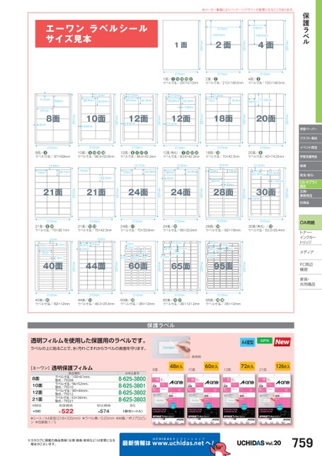 保護ラベル学習ペーパークラフト・素材イベント用品学習支援用品保育安全・安心OA・サプライ用品文具・事務用品日用品OA用紙トナー・トナー・インクカーインクカートリッジメディアィアPC周辺辺機器器家具・具・共用備品用※メーカー事情によりパッケージデザインが変更になることがあります。297mm105mm148.5mm4面297mm210mm148.5mm2面297mm1面エーワンラベルシールサイズ見本10.5mm69mm21.2mm86.4mm50.8mm21.2mm86.4mm42.3mm21.5mm21.2mm83.8mm42.3mm70mm42.3mm42mm74.25mm210mm1面/❶⓯⓳ラベル寸法/297×210mm210mm2面/❷ラベル寸法/210×148.5mm210mm4面/❸ラベル寸法/105×148.5mm3.8mm297mm20面297mm18面297mm12面19.3mm297mm12面18.6mm297mm10面18.6mm297mm97mm8面8mm210mm8面/❹ラベル寸法/97×69mm210mm10面/❺⓰⓴ラベル寸法/86.4×50.8mm210mm12面/❻⓱ラベル寸法/86.4×42.3mm210mm12面(角丸)/❼⓲ラベル寸法/83.8×42.3mm210mm18面/ラベル寸法/70×42.3mm210mm20面/❽ラベル寸法/42×74.25mm53.3mm25.4mm3.8mm297mm30面19mm297mm82mm6mm28面297mm24面297mm24面297mm21面297mm21面14.8mm70mm38.1mm70mm12.7mm12.9mm9.5mm21.5mm42.3mm70mm33.9mm66mm6mm33.9mm20mm18mm210mm21面/❾ラベル寸法/70×38.1mm210mm21面/❿ラベル寸法/70×42.3mm210mm24面/⓫ラベル寸法/70×33.9mm210mm24面/ラベル寸法/66×33.9mm210mm28面/ラベル寸法/82×18mm210mm30面(角丸)/⓬ラベル寸法/53.3×25.4mm297mm95面297mm65面297mm10.92mm38.1mm21.2mm2.5mm4.75mm12mm2mm16.5mm35mm13.5mm2mm8.8mm25.4mm48.3mm8.4mm24mm12mm4mm36mm4mm60面27mm297mm44面297mm9.5mm12mm20mm82mm6mm40面210mm40面/ラベル寸法/82×12mm210mm44面/⓭ラベル寸法/48.3×25.4mm210mm60面/ラベル寸法/36×12mm210mm65面/⓮ラベル寸法/38.1×21.2mm210mm95面/ラベル寸法/35×12mm透明フィルムを使用した保護用のラベルです。ラベルの上に貼ることで、水・汚れ・こすれからラベルの表面を守ります。A4変型保護ラベル[エーワン]透明保護フィルム8面10面12面21面M価税抜¥580商品種別ラベル寸法/100×61mm、型式/79208ラベル寸法/96×52mm、型式/79210ラベル寸法/80×44mm、型式/79212ラベル寸法/63×36mm、型式/79221税抜価格¥522使用例8面48片入10面60片入12面72片入21面126片入お申込番号8-625-38008-625-38018-625-38028-625-3803単位1袋(6シート入)税込価格¥574●シート/A4変型(218×335mm)●ラベル厚/0.05mm●材質/ポリプロピレン●包装数:1/5※カタログに掲載の商品情報(仕様・価格・税率など)は変更になる場合がございます。最新情報はUCHwIDASww.uchidas.netへ!Vol.20759