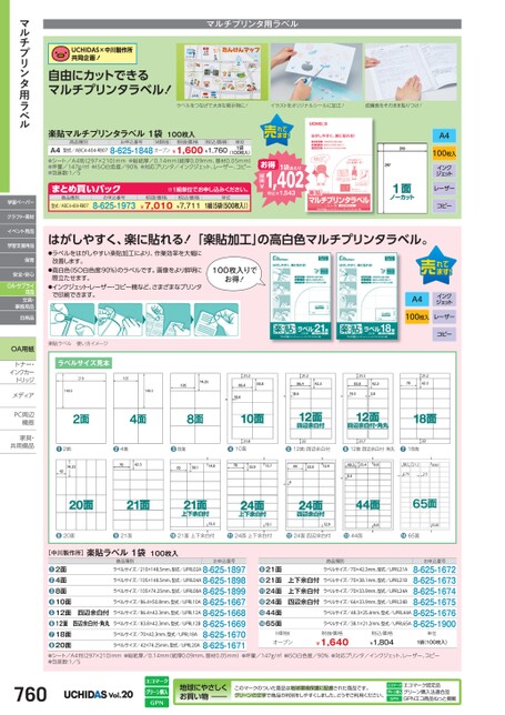 マルチプリンタ用ラベルUCHIDAS×中川製作所共同企画!自由にカットできるマルチプリンタラベル!ラベルをつなげて大きな掲示物に!イラストをオリジナルシールに加工!成績表をそのまま貼りつけ!A4100枚入インクジェットレーザーコピー1袋あたり1,402税込¥1,543税抜¥お得楽貼マルチプリンタラベル1袋100枚入商品種別お申込番号M価税抜税抜価格税込価格型式/ABC4-404-RB078-625-1848オープン¥1,600¥1,760A4●シート/A4判(297×210)mm●総紙厚/0.14mm(紙厚0.09mm、基材0.05mm)●坪量/147g/㎡●ISO白色度/90%●対応プリンタ/インクジェット、レーザー、コピー●包装数:1/5(100枚入)単位1袋まとめ買いパック商品種別型式/ABC4-404-RB07お申込番号8-625-1973※1組単位申込。税抜価格¥7,010税込価格¥7,711単位1組(5袋(500枚入))はがしやすく、楽に貼れる!「楽貼加工」の高白色マルチプリンタラベル。●ラベルをはがしやすい楽貼加工により、作業効率を大幅に●高白色(ISO白色度:90%)のラベルです。画像をより鮮明に●インクジェット・レーザー・コピー機など、さまざまなプリンタ改善します。際立たせます。で印刷できます。100枚入りでお得!A4インクジェット100枚入レーザーコピー楽貼ラベル使い方イメージラベルサイズ見本●2面●4面●8面●10面●12面四辺余白付●12面四辺余白付・角丸●18面●20面●21面●21面上下余白付●24面上下余白付●24面四辺余白付●44面●65面商品種別お申込番号ラベルサイズ/70×38.1mm、型式/UPRL21Bラベルサイズ/70×33.9mm、型式/UPRL24Aラベルサイズ/70×42.3mm、型式/UPRL21A8-625-16728-625-16738-625-16748-625-1675ラベルサイズ/48.3×25.4mm、型式/UPRL44A8-625-1676ラベルサイズ/38.1×21.2mm、型式/UPRL65A8-625-1900ラベルサイズ/66×33.9mm、型式/UPRL24B21面21面上下余白付24面上下余白付24面四辺余白付44面65面●●●●●●M価税抜オープン税抜価格¥1,640税込価格¥1,804単位1袋(100枚入)商品種別お申込番号ラベルサイズ/210×148.5mm、型式/UPRL02A8-625-1897ラベルサイズ/105×148.5mm、型式/UPRL04A8-625-1898ラベルサイズ/105×74.25mm、型式/UPRL08A8-625-1899ラベルサイズ/86.4×50.8mm、型式/UPRL10A8-625-1667ラベルサイズ/86.4×42.3mm、型式/UPRL12A8-625-1668ラベルサイズ/83.8×42.3mm、型式/UPRL12B8-625-16698-625-16708-625-1671ラベルサイズ/42×74.25mm、型式/UPRL20Aラベルサイズ/70×42.3mm、型式/UPRL18A2面4面8面10面12面四辺余白付12面四辺余白付・角丸18面20面●●●●●●●●[中川製作所]楽貼ラベル1袋100枚入●シート/A4判(297×210)mm●総紙厚/0.14mm(紙厚0.09mm、基材0.05mm)●坪量/147g/㎡●ISO白色度/90%●対応プリンタ/インクジェット、レーザー、コピー●包装数:1/5760Vol.20地球にやさしくお買い物このマークのついた商品は地球環境保護に配慮された商品です。グリーンの文字で商品の判別をしやすくしました。どうぞご利用ください。エコマーク認定品グリーン購入法適合品GPNエコ商品ねっと掲載マルチプリンタ用ラベル学習ペーパークラフト・素材イベント用品学習支援用品保育安全・安心OA・サプライ用品文具・事務用品日用品OA用紙トナー・トナー・インクカーインクカートリッジメディアメディPC周辺PC周辺機器機器家具・家具共用備品共用備
