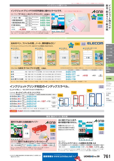 インクジェット用ラベル・耐光・耐水ラベル・耐水紙学習ペーパークラフト・素材イベント用品学習支援用品保育安全・安心OA・サプライ用品文具・事務用品日用品OA用紙トナー・トナー・インクカーインクカートリッジメディアィアPC周辺辺機器器家具・具・共用備品用インクジェット用ラベル※メーカー事情によりパッケージデザインが変更になることがあります。インクジェットプリンタでの印字適性に優れたラベルです。[エーワン]ラベルシール[インクジェット]100枚入商品種別ノーカット1面12面四辺余白付12面四辺余白付角丸21面余白なしラベル寸法/297×210mm、型式/28908ラベル寸法/86.4×42.3mm、型式/28920ラベル寸法/83.8×42.3mm、型式/28916ラベル寸法/70×42.3mm、型式/28924M価税抜¥5,720税抜価格¥4,285税込価格¥4,713お申込番号8-625-00808-625-16448-625-16458-625-1646単位1袋(100枚入)※サイズ見本はP.759をご覧ください。A4100枚入インクジェット●シート/A4判(297×210mm)●総紙厚/0.15mm●ラベル厚/0.09mm●シート入数/100シート●FSC認証●対応プリンタ/インクジェット(染料/顔料)●包装数:11面使用例なまえラベル(インクジェット用)太めのペン、ファイルの背、ノート、教科書などに!パソコンとインクジェットプリンタで、なまえラベルが簡単に作成できます。●●ファイル用・小1面:43×12mmファイル用・中1面:60×12mm12枚入インクジェット●ファイル用・大1面:90×12mm●ファイル用・大(厚ファイル用)1面:90×18mm148mm5面148mm8面148mm8面148mm16面100mm100mm100mm100mm※EPSONPM-4000PXはPXインクの設定でご使用ください。※マットブラックインクには対応しておりません。M価税抜税抜価格税込価格単位¥530¥410¥4511袋(12枚入)お申込番号8-625-13768-625-13778-625-17378-625-1739内容/16面×12枚、ラベル寸法(枚数)/43×12mm(192枚)、型式/EDT-KNM9内容/8面×12枚、ラベル寸法(枚数)/60×12mm(96枚)、型式/EDT-KNM10内容/8面×12枚、ラベル寸法(枚数)/90×12mm(96枚)、型式/EDT-KNM11内容/5面×12枚、ラベル寸法(枚数)/90×18mm(60枚)、型式/EDT-KNM13小中大大(厚ファイル用)●●●●[エレコム]なまえラベル(ファイル用)12枚入商品種別●シート/100×148mm●紙厚/0.192mm●坪量/174g/㎡●材質/フォト光沢紙●対応プリンタ/インクジェット(染料/顔料)●包装数:1/100120片90片160片●●●単位1パック10シート(160片入)1パック10シート(120片入)1パック10シート(90片入)インクジェットプリンタ対応のインデックスラベル。仕上がりが美しく、一気に印字できるので作業が早い![コクヨ]タックインデックス〈パソプリ〉お申込番号M価税抜税抜価格税込価格¥205¥157¥172型式/型式/型式/タ-PC20B8-625-2144タ-PC20R8-625-2145タ-PC21B8-625-2146タ-PC21R8-625-2147タ-PC22B8-625-2148型式/型式/商品種別18×25mm、青枠、小18×25mm、赤枠、小23×29mm、青枠、中23×29mm、赤枠、中27×34mm、青枠、大●●●●●●シート/100×148mm●紙厚/約0.14mm●材質/紙●包装数:1/20LOOKP.867タイトルブレーンを掲載しております。インクジェットA4判ノーカット10枚入インクジェット210mm[エーワン]屋外でも使えるサインラベルシール商品種別お申込番号M価税抜税抜価格税込価格白ノーカットA4判ツヤ消しフィルム、●シート/A4判(297×210mm)●総厚/0.16mm●ラベル厚/0.08mm●材質/ポリエステルフィルム●シート入数/10枚●包装数:18-625-1389¥2,080¥1,690¥1,859型式/31031単位1袋(10枚入)[エーワン]インクジェットラベルシール超耐水光沢紙A4商品種別型式/64201お申込番号8-625-2133M価税抜¥1,360税抜価格¥1,100税込価格¥1,210(10枚入)●シート/A4判(210×297mm)●総厚/0.22mm●坪量/193g/㎡●ラベル厚/0.11mm●ノーカット●対応プリンタ/インクジェット(染料/顔料)●包装数:1/5単位1袋※カタログに掲載の商品情報(仕様・価格・税率など)は変更になる場合がございます。最新情報はUCHIDASww.uchidas.netwへ!Vol.20761耐光・耐水ラベル・耐水紙水に濡れてもにじまず、紙の表面が破けません。結露の生じるパッケージ、水気のある場所での表示、宛名などにおすすめです。A4判ノーカット10枚入ツヤ消しフィルムレーザー使用例297mm1面屋外でも使える強粘着タイプ!
