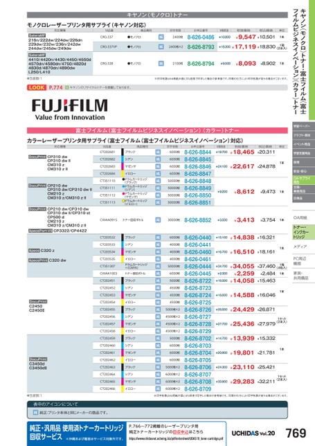 キヤノン(モノクロ)トナー・富士フイルム(富士イルムビジネスイノベーション)(カラー)トナーフ学習ペーパークラフト・素材イベント用品学習支援用品安全・安心OA・サプライ用品文具・事務用品日用品OA用紙用紙トナー・インクカートリッジメディアィアPC周辺辺機器器家具・具・共用備品用印字枚数6000枚6000枚6000枚6000枚50000枚50000枚50000枚50000枚お申込番号8-626-88448-626-88458-626-88468-626-88478-626-88488-626-88498-626-88508-626-8851M価税抜¥19,700税抜価格¥18,465税込価格¥20,311単位¥24,100¥22,617¥24,8781本保育¥9,200¥8,612¥9,4731本30000枚8-626-8852¥3,500¥3,413¥3,7541本6000枚4000枚4000枚4000枚50000枚6000枚5000枚4500枚4500枚4500枚5000枚×24500枚×24500枚×24500枚×25000枚6000枚6000枚6000枚5000枚×26000枚×26000枚×26000枚×28-626-04408-626-04418-626-04608-626-04618-626-04448-626-04458-626-87228-626-87238-626-87248-626-87258-626-87268-626-87278-626-87288-626-87298-626-87028-626-87038-626-87048-626-87058-626-87068-626-87078-626-87088-626-8709¥15,100¥14,838¥16,321¥16,700¥16,510¥18,1611本¥34,700¥2,300¥16,000¥34,055¥2,259¥14,058¥37,460¥2,484¥15,4631箱(4色入)1本1本¥16,600¥14,588¥16,046¥26,600¥24,429¥26,871¥27,700¥25,4361セット(2本入)¥27,979¥14,700¥13,939¥15,332¥20,800¥19,801¥21,7811本¥24,300¥23,110¥25,421¥30,900¥29,2831セット(2本入)¥32,211モノクロレーザープリンタ用サプライ(キヤノン対応)キヤノン(モノクロ)トナー対応機種SateraMF216n/222dw/224dw/226dn229dw/232w/236n/242dw244dw/245dw/249dwSateraMF4410/4420n/4430/4450/4550d4570dn/4580dn/4750/4820d4830d/4870dn/4890dwL250/L410●包装数:1M品番商品種別CRG-337●モノクロCRG-337VP●モノクロCRG-328●モノクロ純純純印字枚数2400枚2400枚×2お申込番号M価税抜税抜価格税込価格8-626-04868-626-8793¥10,800¥9,547¥10,501¥18,300¥17,119¥18,830単位1本1箱(2本入)2100枚8-626-8794¥9,500¥8,093¥8,9021本※印字枚数はA4用紙片面に5%密度で印字した場合の参考値です。印刷の仕方により印字枚数が変わる場合がございます。LOOKP.774リキヤノンのリサイクルトナーを掲載しております。富士フイルム(富士フイルムビジネスイノベーション)(カラー)トナーカラーレーザープリンタ用サプライ(富士フイルム(富士フイルムビジネスイノベーション)対応)対応機種DocuPrintCP310dwCP310dwIICM310zCM310zIIDocuPrintCP210dwCP310dw/CP310dwIICM210zCM310z/CM310zIIDocuPrintCP210dw/CP310dwCP310dwII/CP310stCP500dCM210zCM310z/CM310zIIApeosPort-VIICP3322/CP4422M品番CT202681CT202682CT202683CT202684CT351110CT351111CT351112CT351113商品種別ブラックシアンマゼンタイエロー●ドラムカートリッジ(ブラック)●ドラムカートリッジ(シアン)●ドラムカートリッジ(マゼンタ)●ドラムカートリッジ(イエロー)CWAA0915トナー回収ボトルApeosC320zApeosPrintC320dwDocuPrintC2450C2450ⅡDocuPrintC3450dC3450dⅡ●包装数:1CT203532CT203533CT203534CT203535CT351307CWAA1003CT202451CT202452CT202453CT202454CT202455CT202456CT202457CT202458CT202459CT202460CT202461CT202462CT202463CT202464CT202465CT202466ブラックシアンマゼンタイエロードラムカートリッジ+(CMYK)トナー回収ボトルブラックシアンマゼンタイエローブラックシアンマゼンタイエローブラックシアンマゼンタイエローブラックシアンマゼンタイエロー純純純純純純純純純純純純純純純純純純純純純純純純純純純純純純純※印字枚数はA4用紙片面に5%密度で印字した場合の参考値です。印刷の仕方により印字枚数が変わる場合がございます。表中純純正:プリンタ本体と同じメーカーの商品です。純正・汎用品使用済トナーカートリッジ回収サービス※沖縄および離島はサービス対象外です。P.766〜772掲載のレーザープリンタ用純正トナーカートリッジの回収申込はこちらhttps://wwwuchidasnet.ecbeing.biz/pdf/ordersheet/UDAS19_toner-cartridge.pdfVol.20769