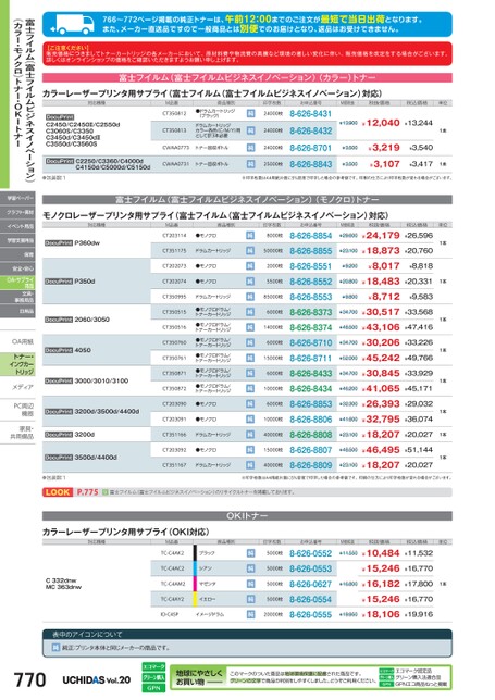 766〜772掲載純正、午前12:00注文最短当日出荷。、直送品一般商品別便届、返品受。【ご注意ください】販売価格につきましてトナーカートリッジの各メーカーにおいて、原材料費や物流費の高騰など環境の著しい変化に伴い、販売価格を改定をする場合がございます。詳しくはオンラインショップの価格をご確認いただきますようお願い申し上げます。富士フイルム(富士フイルムビジネスイノベーション)(カラー)トナーカラーレーザープリンタ用サプライ(富士フイルム(富士フイルムビジネスイノベーション)対応)お申込番号M価税抜税抜価格税込価格単位対応機種DocuPrintC2450/C2450Ⅱ/C2550dC3060S/C3350C3450d/C3450dⅡC3550d/C3560SM品番CT350812CT350813商品種別●ドラムカートリッジ(ブラック)ドラムカートリッジカラー各色(C/M/Y)用として計3本必要CWAA0773トナー回収ボトルDocuPrintC2250/C3360/C4000dC4150d/C5000d/C5150dCWAA0731トナー回収ボトル●包装数:1純純純純印字枚数24000枚8-626-843124000枚8-626-8432¥13,900¥12,040¥13,2441本24000枚8-626-870125000枚8-626-8843¥3,500¥3,500¥3,219¥3,107¥3,540¥3,4171本※印字枚数はA4用紙片面に5%密度で印字した場合の参考値です。印刷の仕方により印字枚数が変わる場合がございます。富士フイルム(富士フイルムビジネスイノベーション)(モノクロ)トナーモノクロレーザープリンタ用サプライ(富士フイルム(富士フイルムビジネスイノベーション)対応)対応機種M品番商品種別DocuPrintP360dwDocuPrintP350dDocuPrint2060/3050DocuPrint4050DocuPrint3000/3010/3100DocuPrint3200d/3500d/4400dDocuPrint3200dDocuPrint3500d/4400dCT203114●モノクロCT351175ドラムカートリッジCT202073●モノクロCT202074●モノクロCT350995ドラムカートリッジCT350515CT350516CT350760CT350761CT350871CT350872●モノクロドラム/トナーカートリッジ●モノクロドラム/トナーカートリッジ●モノクロドラム/トナーカートリッジ●モノクロドラム/トナーカートリッジ●モノクロドラム/トナーカートリッジ●モノクロドラム/トナーカートリッジCT203090●モノクロCT203091●モノクロCT351166ドラムカートリッジCT203092●モノクロCT351167ドラムカートリッジ印字枚数8000枚50000枚2000枚5500枚85000枚6000枚14000枚6000枚15000枚6000枚10000枚6000枚10000枚40000枚15000枚40000枚お申込番号8-626-88548-626-88558-626-85518-626-85528-626-85538-626-83738-626-83748-626-87108-626-87118-626-84338-626-84348-626-88538-626-88068-626-88088-626-88078-626-8809M価税抜¥29,600¥23,100¥9,200¥20,800¥9,800¥34,700¥48,500¥34,700¥52,000¥34,700¥46,200¥32,300¥41,600¥23,100¥48,500¥23,100税抜価格¥24,179¥18,873¥8,017¥18,483¥8,712¥30,517¥43,106¥30,206¥45,242¥30,845¥41,065¥26,393¥32,795¥18,207¥46,495¥18,207単位1本税込価格¥26,596¥20,760¥8,818¥20,3311本¥9,583¥33,568¥47,416¥33,226¥49,766¥33,929¥45,171¥29,032¥36,0741本1本1本1本¥20,0271本¥51,144¥20,0271本純純純純純純純純純純純純純純純純※印字枚数はA4用紙片面に5%密度で印字した場合の参考値です。印刷の仕方により印字枚数が変わる場合がございます。●包装数:1LOOKP.775リ富士フイルム(富士フイルムビジネスイノベーション)のリサイクルトナーを掲載しております。OKIトナー富士フイルム(富士フイルムビジネスイノベーション)(カラー・モノクロ)トナー・OKIトナー学習ペーパークラフト・素材イベント用品学習支援用品保育安全・安心OA・サプライ用品文具・事務用品日用品OA用紙OA用紙トナー・インクカートリッジメディアメディPC周辺PC周辺機器機器家具・家具共用備品共用備カラーレーザープリンタ用サプライ(OKI対応)対応機種M品番商品種別C332dnwMC363dnwTC-C4AK2ブラックTC-C4AC2シアンTC-C4AM2マゼンタTC-C4AY2イエローID-C4SPイメージドラム表中純純正:プリンタ本体と同じメーカーの商品です。印字枚数5000枚5000枚5000枚5000枚20000枚お申込番号M価税抜税抜価格8-626-05528-626-05538-626-06278-626-05548-626-0555¥11,550¥16,800¥19,950¥10,484¥15,246¥16,182¥15,246¥18,106単位税込価格¥11,532¥16,770¥17,8001本¥16,770¥19,916純純純純純770Vol.20地球にやさしくお買い物このマークのついた商品は地球環境保護に配慮された商品です。グリーンの文字で商品の判別をしやすくしました。どうぞご利用ください。エコマーク認定品グリーン購入法適合品GPNエコ商品ねっと掲載