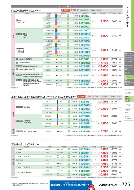 リサイクルトナー学習ペーパークラフト・素材イベント用品学習支援用品保育安全・安心OA・サプライ用品文具・事務用品日用品OA用紙用紙トナー・インクカートリッジメディアィアPC周辺辺機器器家具・具・共用備品用●包装数:1※印字枚数はA4用紙片面に5%密度で印字した場合の参考値です。印刷の仕方により印字枚数が変わる場合がございます。印字枚数15000枚11000枚11000枚11000枚5000枚6000枚6000枚6000枚8-626-89678-626-89688-626-89698-626-89708-626-89968-626-89978-626-89988-626-8999純富士フイルムの純正トナーを掲載しております。税抜価格¥21,598税込価格¥23,757単位オープン¥17,098¥18,807¥8,540¥9,394オープン¥11,800¥12,9801本1本10000枚8-626-8966オープン¥13,790¥15,1691本リリリリリリリリリDocuPrintC4150dDocuPrintC3450dC3450dⅡCT203177CT203178CT203179CT203180CT202459CT202460CT202461CT202462ブラックシアンマゼンタイエローブラックシアンマゼンタイエローDocuPrint3000/3010/3100CT350872●モノクロカラーモノクロ富士フイルム(富士フイルムビジネスイノベーション)対応リサイクルトナーLOOKP.769・770対応機種M品番商品種別お申込番号M価税抜●包装数:1※印字枚数はA4用紙片面に5%密度で印字した場合の参考値です。印刷の仕方により印字枚数が変わる場合がございます。M品番LB320MLB320BLB320ドラムLB321MLB321BLB321ドラムLB322BLB322ドラム商品種別●モノクロ●モノクロドラムカートリッジ●モノクロ●モノクロドラムカートリッジ●モノクロドラムカートリッジ印字枚数10000枚12000枚25000枚10000枚12000枚25000枚15000枚25000枚お申込番号8-626-89468-626-89448-626-89488-626-89478-626-89458-626-89498-626-06198-626-0620M価税抜オープンオープンオープンオープンオープンオープンオープン税抜価格¥8,888¥14,800¥8,533¥8,888¥14,680¥8,533¥17,091¥30,891税込価格¥9,776単位1本¥16,280¥9,386¥9,776¥16,148¥9,386¥18,800¥33,9801本1本1本1本1本1本リリリリリリリリ※印字枚数はA4用紙片面に5%密度で印字した場合の参考値です。印刷の仕方により印字枚数が変わる場合がございます。富士通対応リサイクルトナー対応機種XL-9382XL-9381XL-9381/XL-9382XL-9322XL-9321モノクロXL-9321/XL-9322XL-9450/XL-9450E●包装数:1※カタログに掲載の商品情報(仕様・価格・税率など)は変更になる場合がございます。最新情報はUCHwIDASww.uchidas.netへ!Vol.20775リサイクルトナーP.772LOOK商品種別印字枚数純RICOHの純正トナーを掲載しております。6200枚6200枚6200枚6200枚8000枚7000枚7000枚7000枚8000枚7000枚7000枚7000枚5000枚7000枚12000枚10000枚お申込番号8-626-06218-626-06228-626-06238-626-06248-626-87378-626-87388-626-87398-626-87408-626-04568-626-04578-626-04588-626-04598-626-89518-626-89528-626-85908-626-8819M価税抜税抜価格税込価格単位オープン¥9,500¥10,4501本オープン¥9,500¥10,4501本オープン¥9,500¥10,4501本オープンオープンオープンオープン¥8,889¥11,100¥22,400¥11,200¥9,777¥12,210¥24,640¥12,3201本1本1本1本15000枚8-626-8301オープン¥12,560¥13,8161本10000枚25000枚8-626-89508-626-8953オープン¥12,645¥8,889¥13,909¥9,7771本リリリリリリリリリリリリリリリリリリリM品番PC300HブラックPC300HシアンPC300HマゼンタPC300HイエローブラックシアンマゼンタイエローC740HブラックブラックC740HシアンシアンC740HマゼンタマゼンタC740HイエローイエローPC6000HブラックPC6000HシアンPC6000HマゼンタPC6000HイエローSP2300HSP3700H4200HSP4500Hブラックシアンマゼンタイエロー●モノクロ●モノクロ●モノクロ●モノクロRICOH対応リサイクルトナー対応機種PC301C301SFIPSiOSPC740C750C751カラーPC6000LC6010C6020SP2300L/2300SFLSP3700/3700SFIPSiOSP4210/4300/4310SP4500/4510/4510SF※SP3610は非対応。モノクロIPSiOSP6100/6110/6120/62106220/6310/6320/63306100H●モノクロIPSiOSP6410/6410LE/64206420LE/6430/6430LE6430TE/6440/64506450TESP6400HSP6400ドラム●モノクロドラムカートリッジ