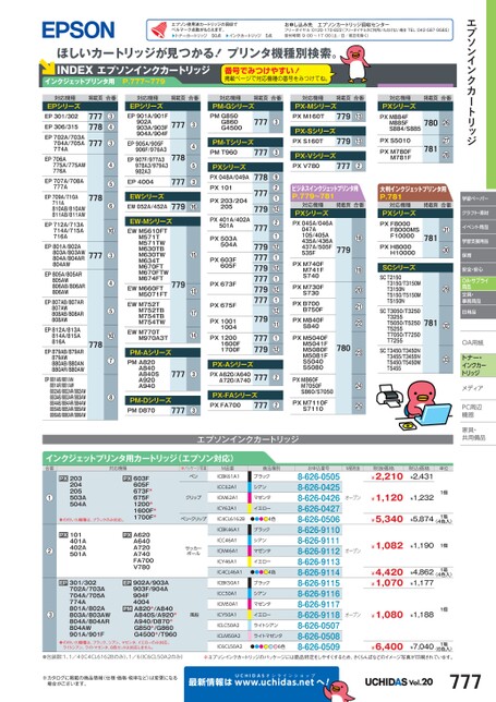 エプソンインクカートリッジ学習ペーパークラフト・素材イベント用品学習支援用品保育安全・安心OA・サプライ用品文具・事務用品日用品OA用紙用紙トナー・インクカートリッジメディアィアPC周辺辺機器器家具・具・共用備品用エプソン使用済カートリッジの回収でベルマーク点数がもらえます。▶トナーカートリッジ50点▶インクカートリッジ5点お申し込み先エプソンカートリッジ回収センターフリーダイヤル:0120-170-822(フリーダイヤルがご利用いただけない場合TEL:042-587-9585)受付時間:9:00〜17:00(土/日/祝日を除く)ほしいカートリッジが見つかる!プリンタ機種別検索。INDEXエプソンインクカートリッジ番号でみつけやすい!掲載ページで対応機種の番号をみつけてね。インクジェットプリンタ用P.777〜779掲載頁合番777778777778●●●●●●●777●●●●●●778対応機種EPシリーズEP301/302EP306/315EP702A/703A704A/705A774AEP706A775A/775AW776AEP707A/708A777AEP709A/710A711A810AB/810AW811AB/811AWEP712A/713A714A/715A716AEP801A/802A803A/803AW804A/804AR804AWEP805A/805AR805AW806AB/806AR806AWEP807AB/807AR807AW808AB/808AR808AWEP812A/813A814A/815A816AEP879AB/879AR879AW880AB/880AN880AR/880AWEP881AB/881AN881AR/881AW882AB/882AR/882AW883AB/883AR/883AW884AB/884AR/884AW885AB/885AR/885AW886AB/886AR/886AW対応機種EPシリーズEP901A/901F902A903A/903F904A/904FEP905A/905F906F/976A3EP907F/977A3978A3/979A3982A3EP4004EWシリーズEW052A/452A掲載頁合番777●●●●778777779●EW-MシリーズEWM5610FTM571TM571TWM630TBM630TWM634TM670FTM670FTWM674FTEWM660FTM5071FT779EWM752TM752TBM754TBM754TWEWM770TM970A3TPM-AシリーズPMA820A840A840SA920A940777●●●●●PM-DシリーズPMD870777●対応機種掲載頁PM-GシリーズPMG850G860G4500777合番●PM-TシリーズPMT960777●PXシリーズPX048A/049APX101PX203/204205PX401A/402A501APX503A504APX603F605FPX673FPX675FPX10011004PX12001600F1700F778777779777779777779777779777779777779●●●●●●●●●●●●●●●●PX-AシリーズPXA620/A640A720/A740777●PX-FAシリーズPXFA700777●対応機種掲載頁PX-MシリーズPXM160T779合番●PX-SシリーズPXS160TPX-VシリーズPXV780779●777●ビジネスインクジェットプリンタ用P.779〜781対応機種PXシリーズPX045A/046A047A105/405A435A/436A437A/505F535FPXM740FM741FS740PXM730FS730PXB700B750FPXM840FS840PXM5040FM5041FM5080FM5081FS5040S5080PXM860FM7050FS860/S7050PXM7110FS7110掲載頁合番779780●●●●●●●●インクジェットプリンタ用カートリッジ(エプソン対応)エプソンインクカートリッジ対応機種PXシリーズPXM884FM885FS884/S885PXS5010PXM780FM781F掲載頁合番780781●●●大判インクジェットプリンタ用P.781対応機種掲載頁合番PXシリーズPXF8000F8000MSF10000PXH8000H10000SCシリーズSCT2150T3150/T3150MT3150NT5150/T5150MT5150NSCT3050/T3250T3255T5050/T5250T5255T7050/T7250T7255SCT3450/T3450NT3455/T3455NT5450/T5450MT5455781●●●781●●合番●PX203204205503A504A対応機種PX603F605F673F675F12001600F1700F※パッケージ写真ペンクリップM品番ICBK61A1ICC62A1ICM62A1ICY62A1商品種別ブラックシアンマゼンタイエローペン・クリップIC4CL6162B●●●●4色の付いた機種は、ブラックのみ対応。PX101401A402A501A●PXA620A640A720A740FA700V780EP301/302702A/703A704A/705A774A801A/802A803A/803AW804A/804AR804AW901A/901F●EP902A/903A903F/904A904F4004PMA820/A840A840S/A920A940/D870G850/G860G4500/T960サッカーボール風船の付いた機種は、ブラック、シアン、マゼンタ、イエローのみ対応。ライトシアン、ライトマゼンタ、6色セットは対応しません。●包装数:1、1/4(IC4CL6162Bのみ)、1/6(IC6CL50A2のみ)ICBK46A1ICC46A1ICM46A1ICY46A1ブラックシアンマゼンタイエローIC4CL46A1●●●●4色ICBK50A1ICC50A1ICM50A1ICY50A1ICLC50A2ICLM50A2ブラックシアンマゼンタイエローライトシアンライトマゼンタM価税抜税抜価格¥2,210税込価格¥2,431オープン¥1,120¥1,232単位1個¥5,340¥5,8741箱(4色入)¥1,082¥1,1901個オープン¥4,420¥1,0701箱(4色入)¥4,862¥1,177オープン¥1,080¥1,1881個お申込番号8-626-05058-626-04258-626-04268-626-04278-626-05068-626-91108-626-91118-626-91128-626-91138-626-91148-626-91158-626-91168-626-91178-626-91188-626-05078-626-05088-626-0509IC6CL50A2●●●●●●6色(6色入)※エプソンインクカートリッジのパッケージには商品特定をしやすくするため、さくらんぼなどのイメージ写真が印刷されています。¥6,400¥7,0401箱※カタログに掲載の商品情報(仕様・価格・税率など)は変更になる場合がございます。最新情報はUCHIDASww.uchidas.netwへ!Vol.20777